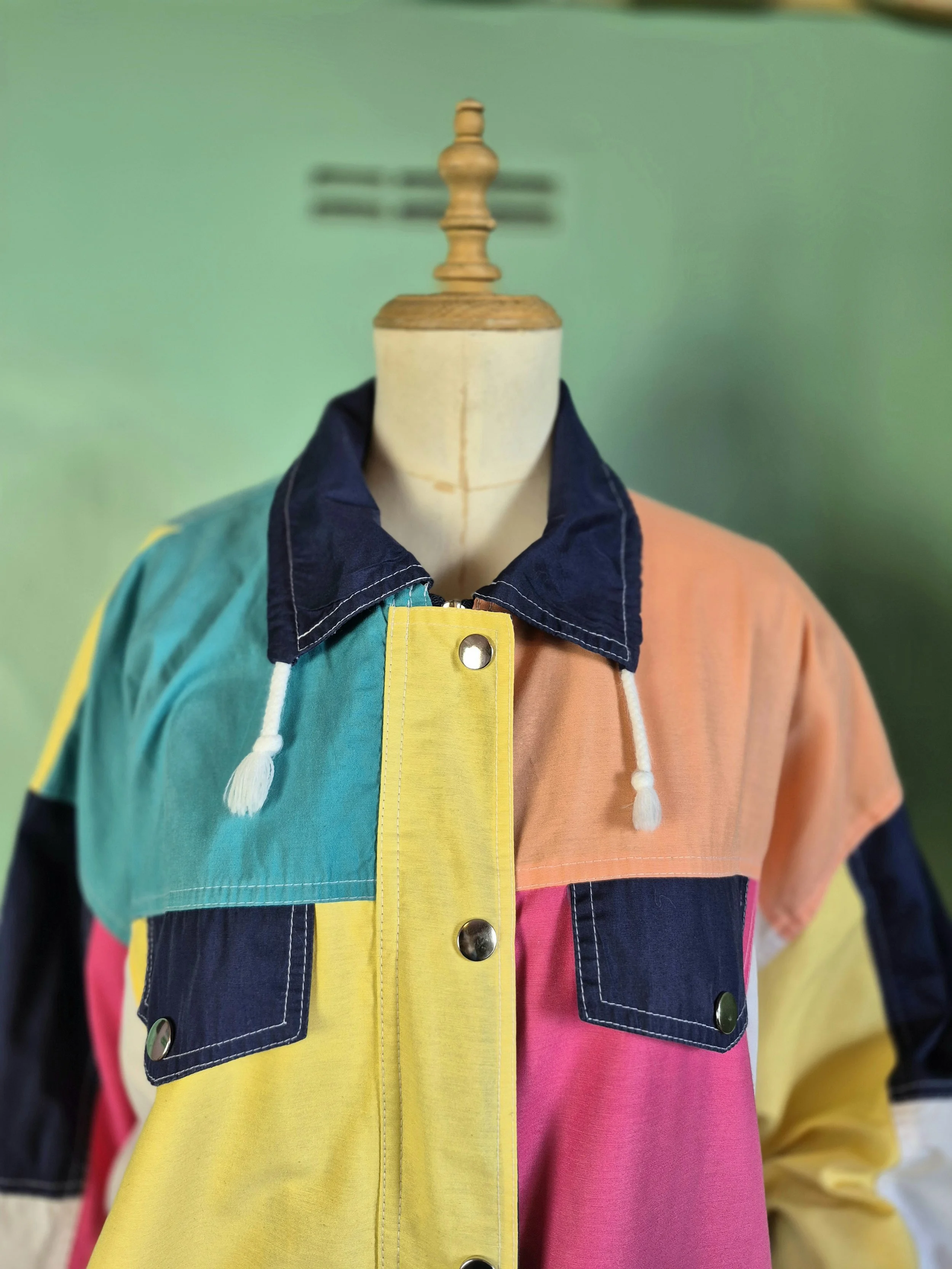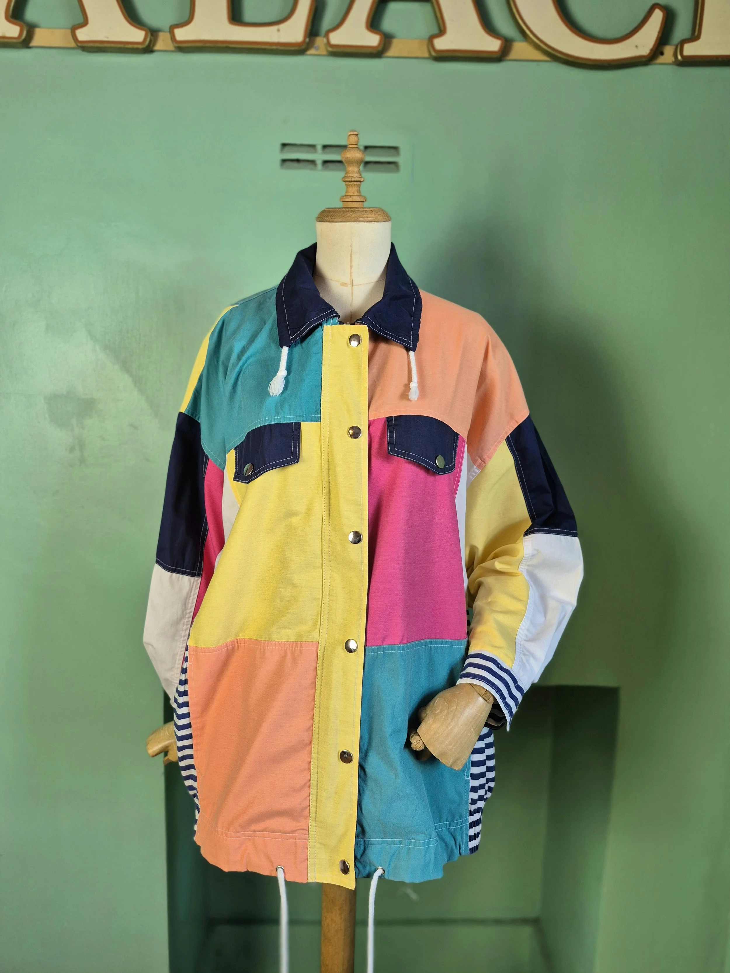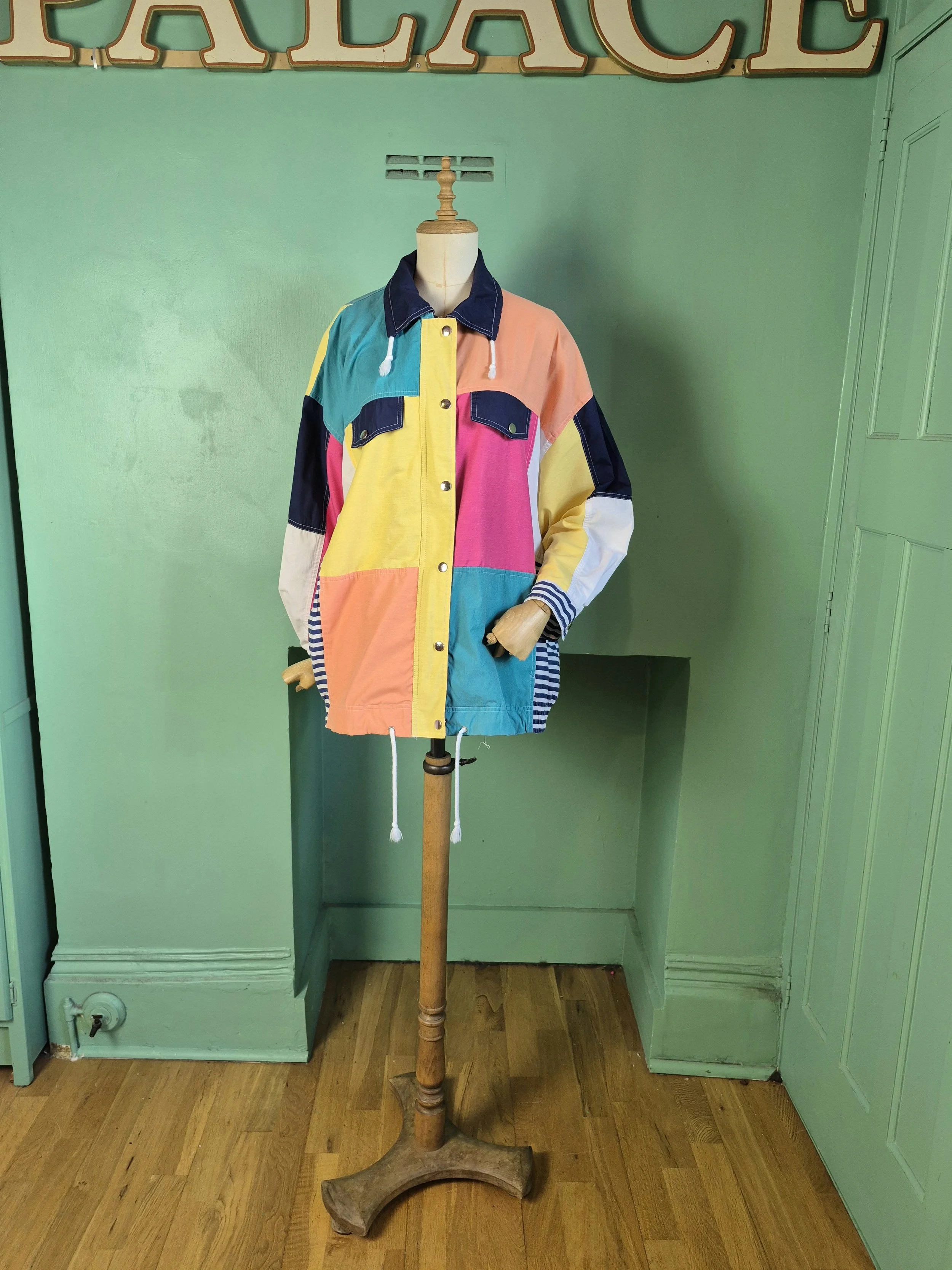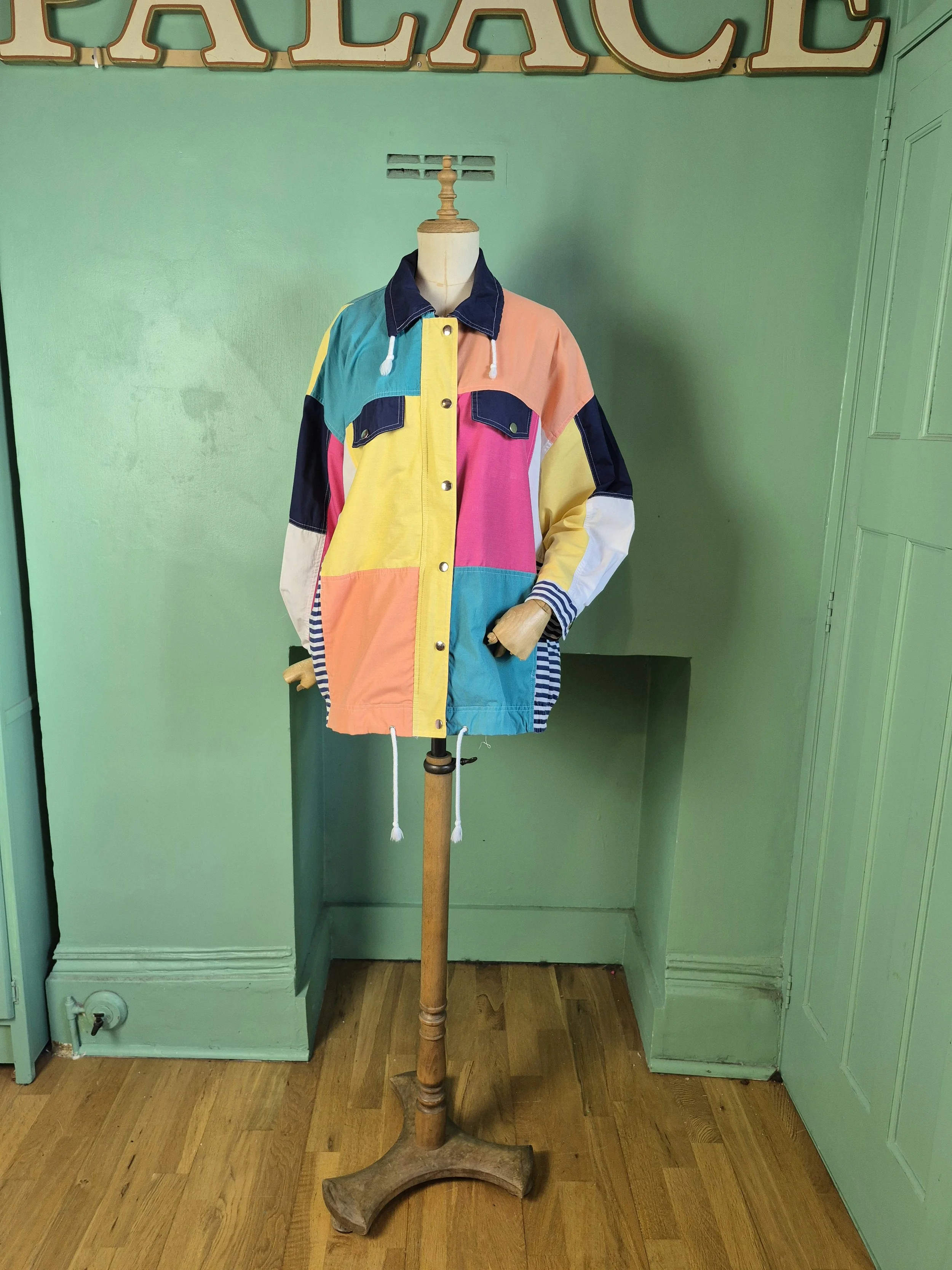 So cute. Lightweight patch colour block jacket. Drewstring to waist, zip and popper front.