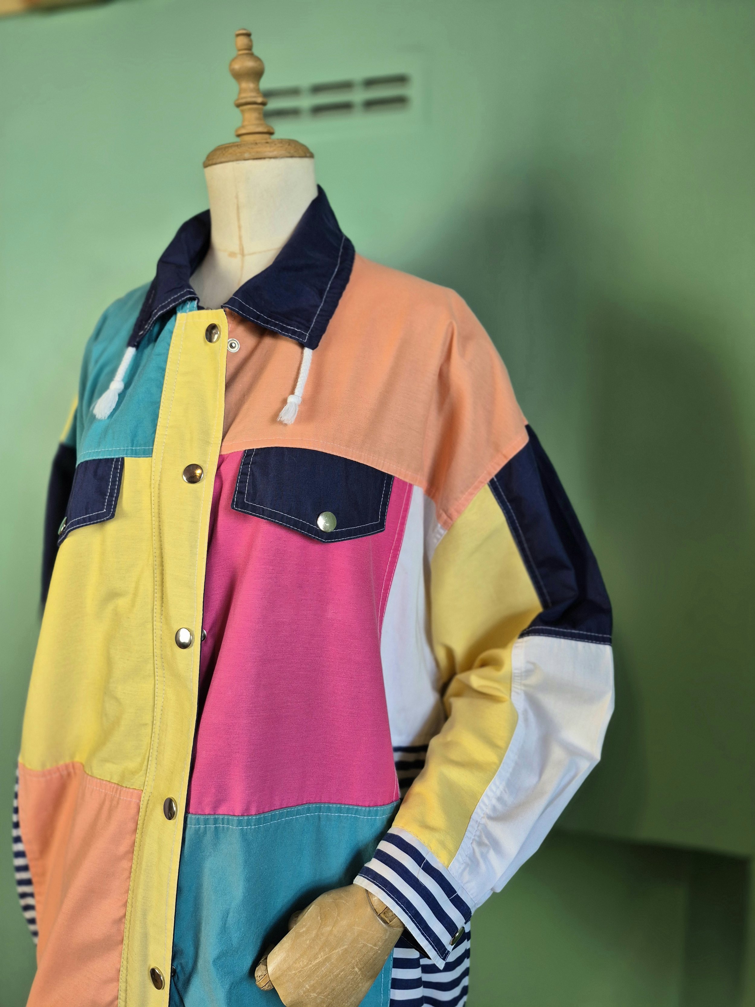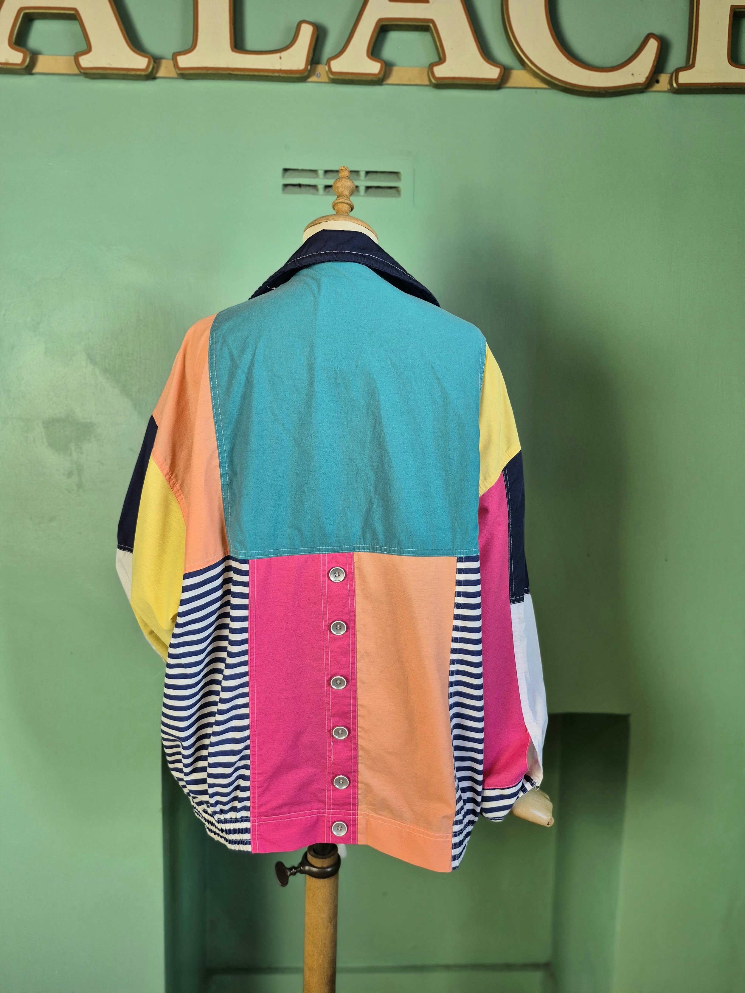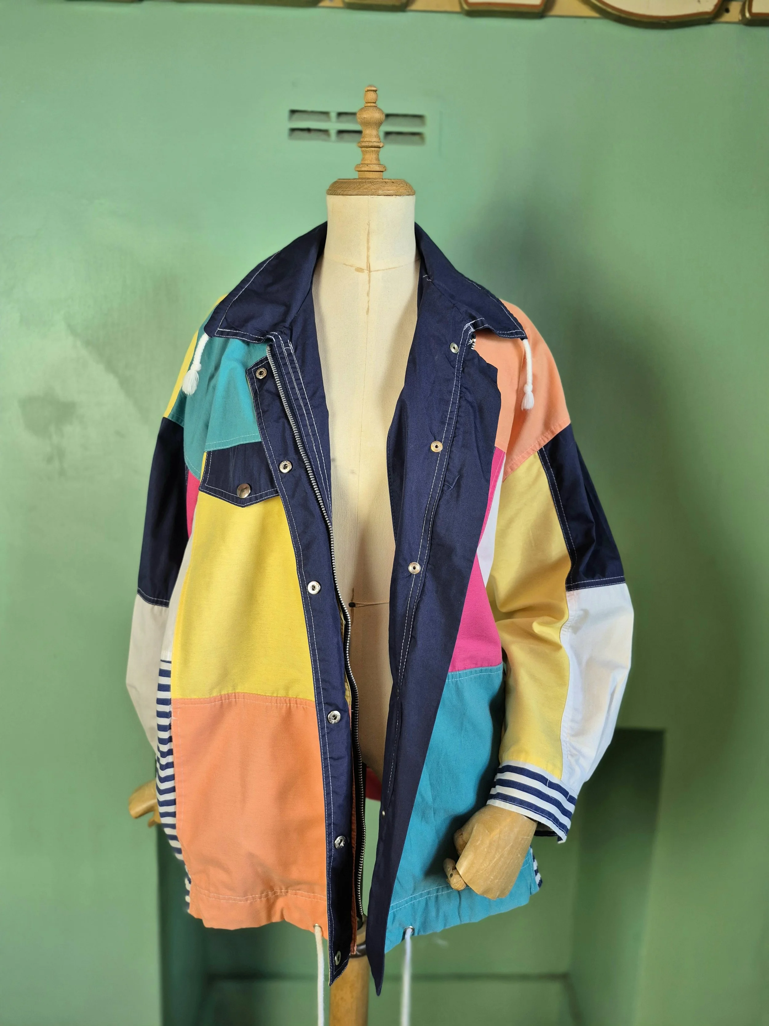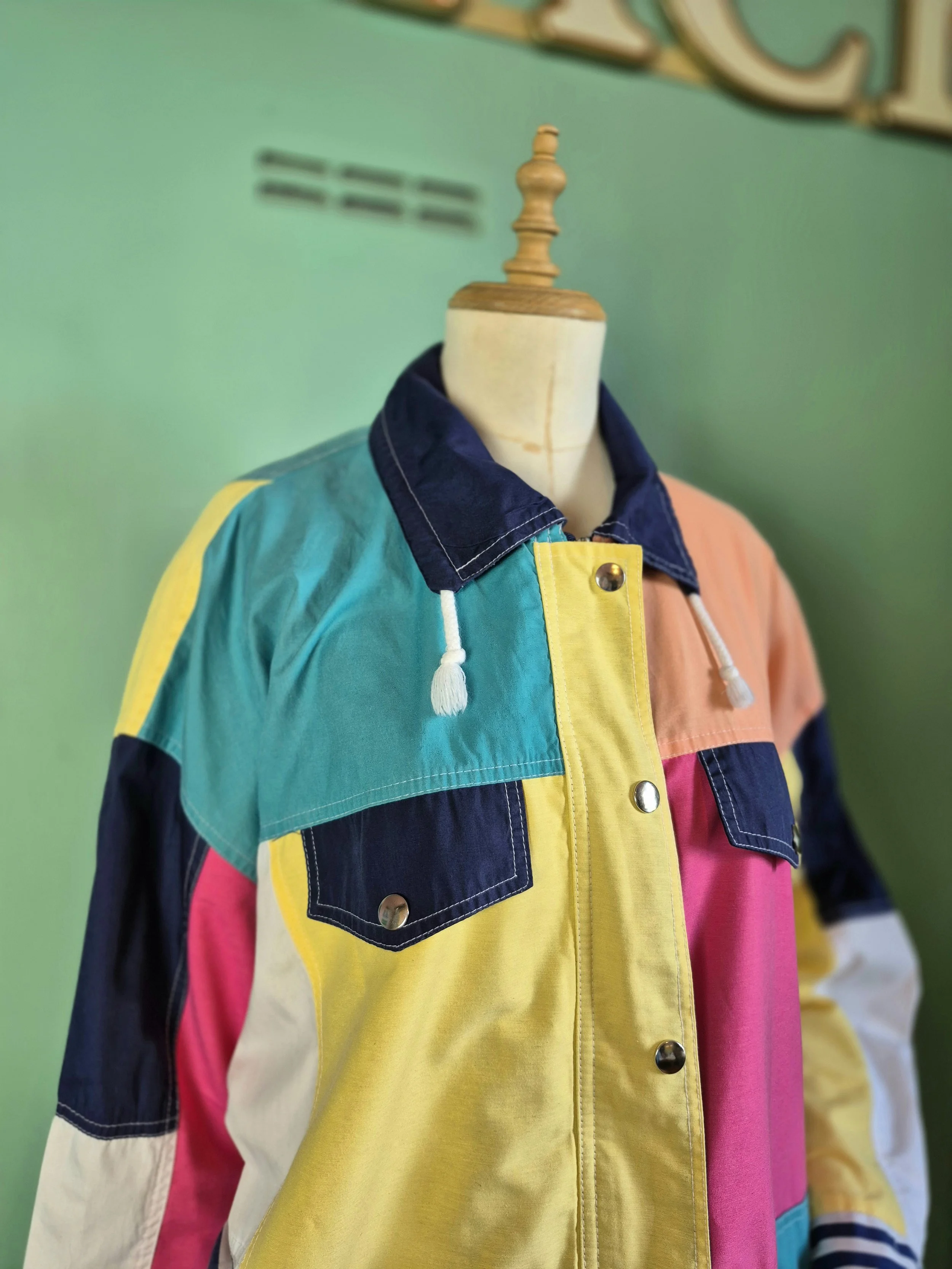 So cute. Lightweight patch colour block jacket. Drewstring to waist, zip and popper front.