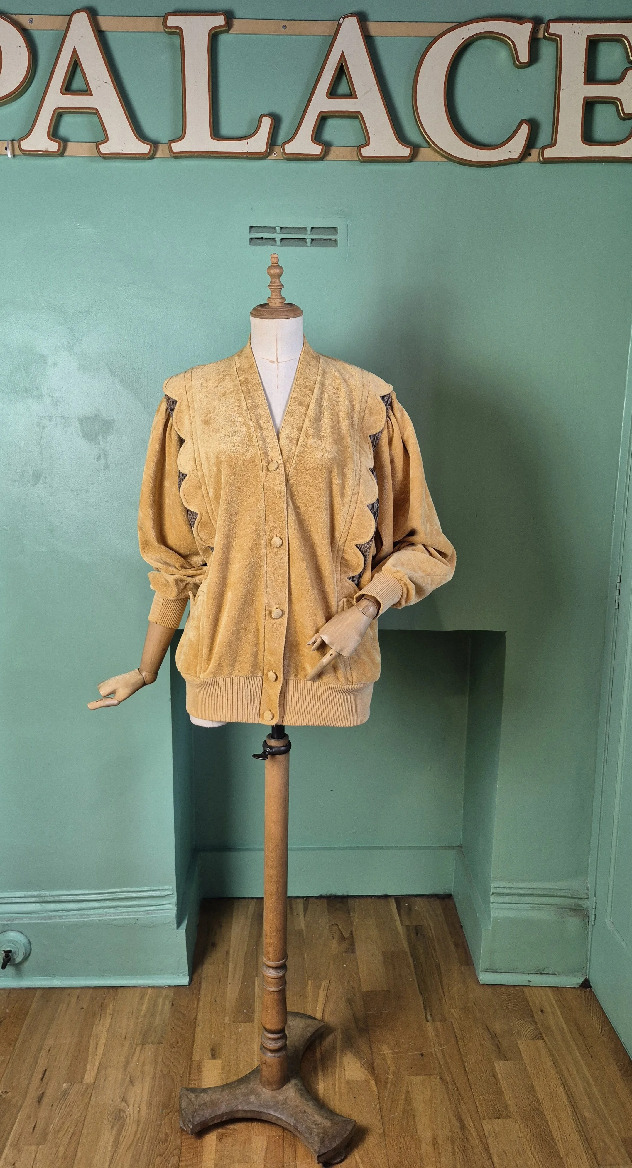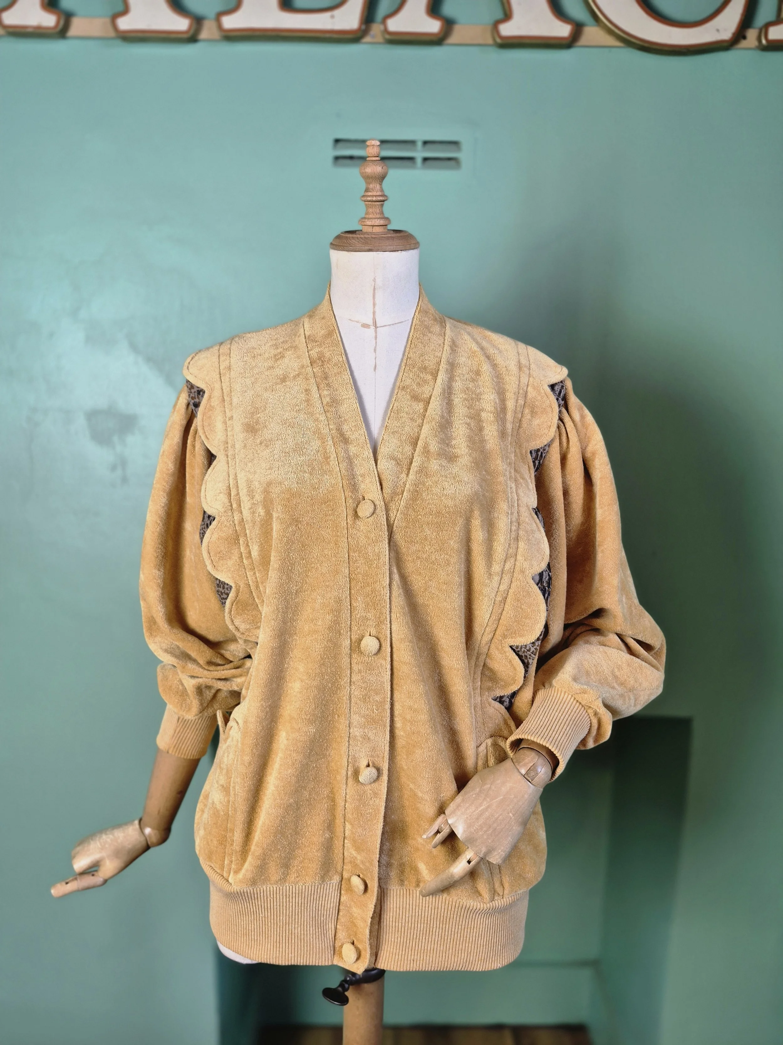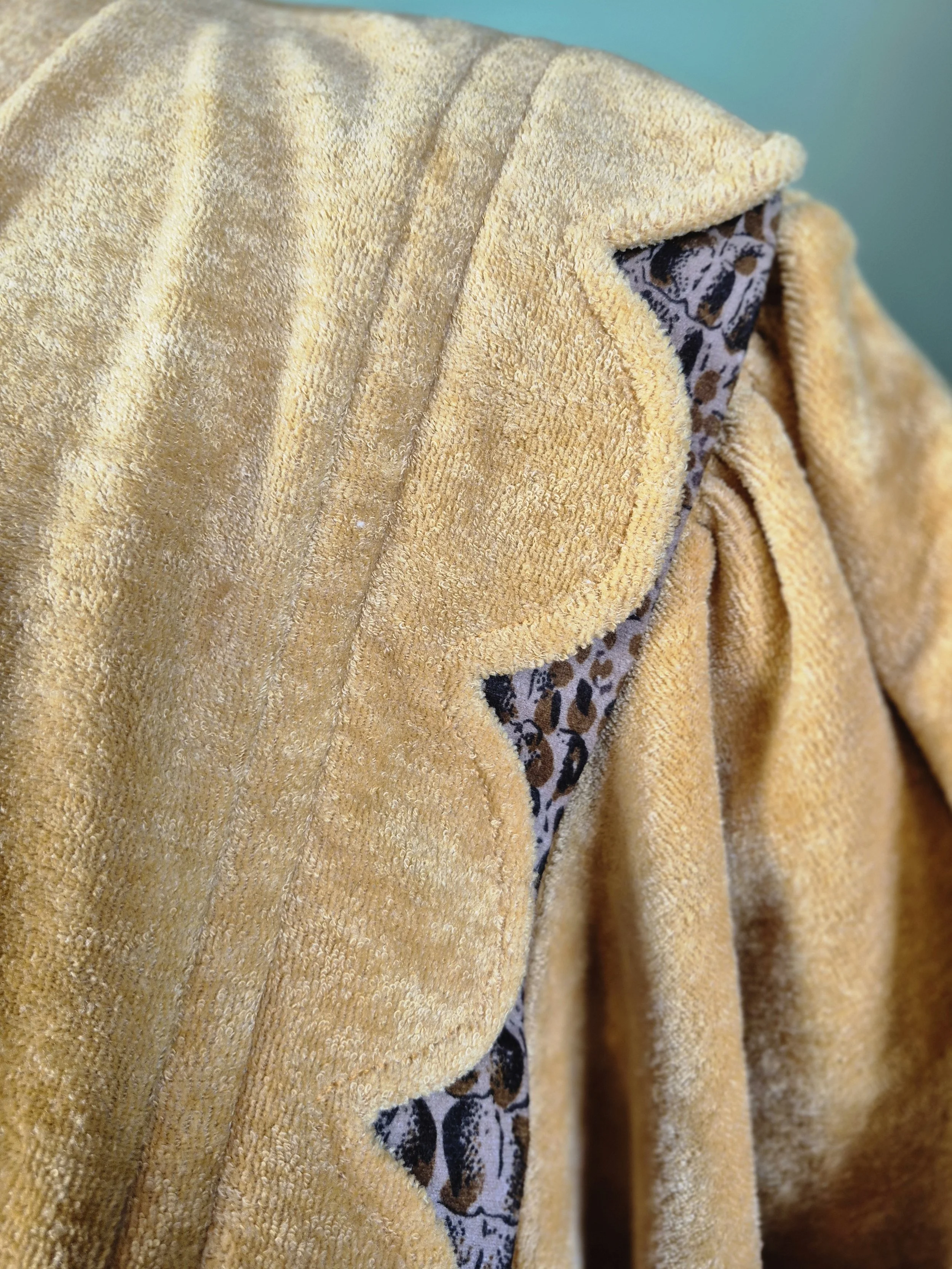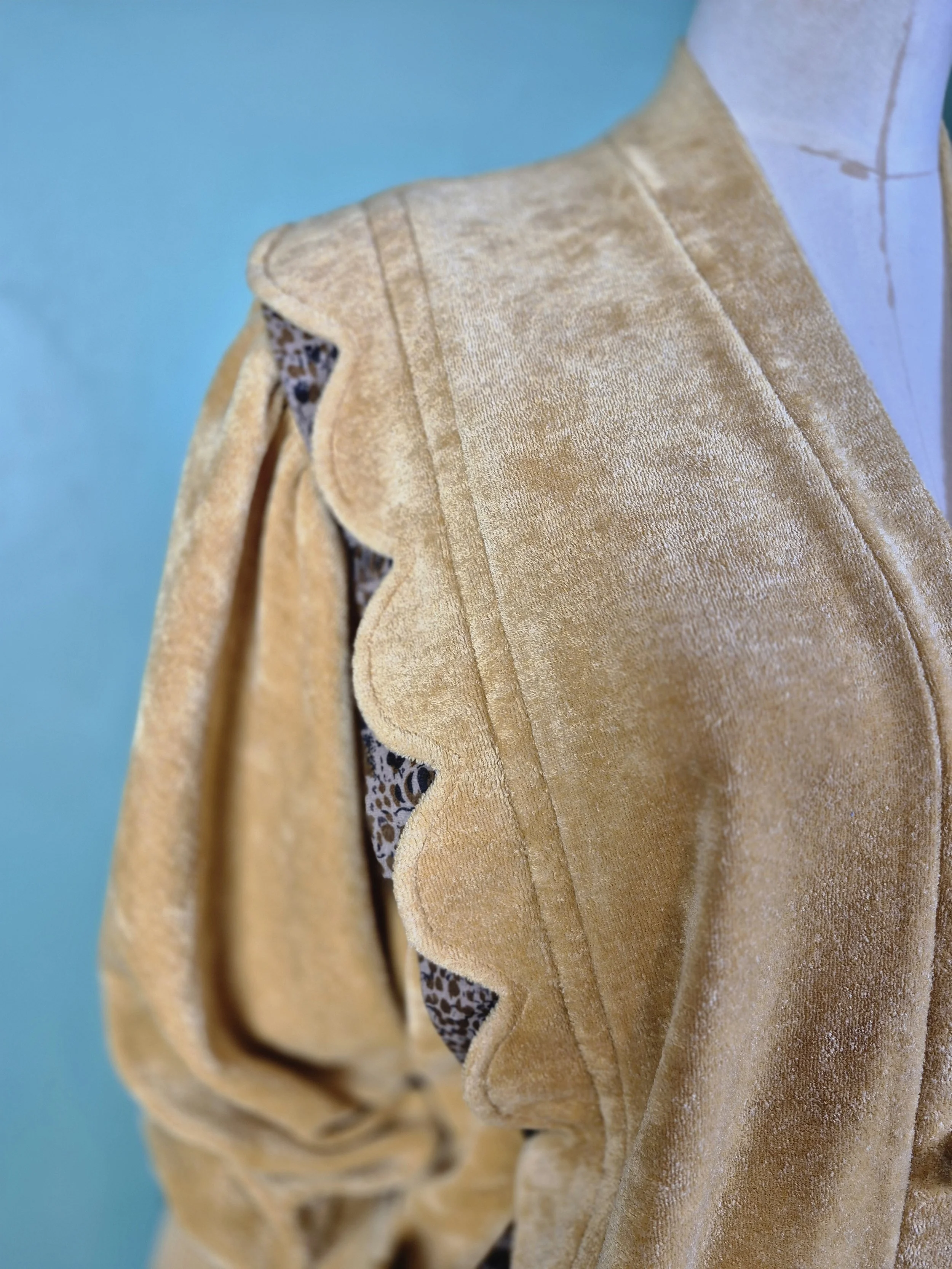 Half jumper half top and totally fabulous. Bold jewel tone leaf print fabric with leaf appliqués. fastens with a single button at the back of the neck.