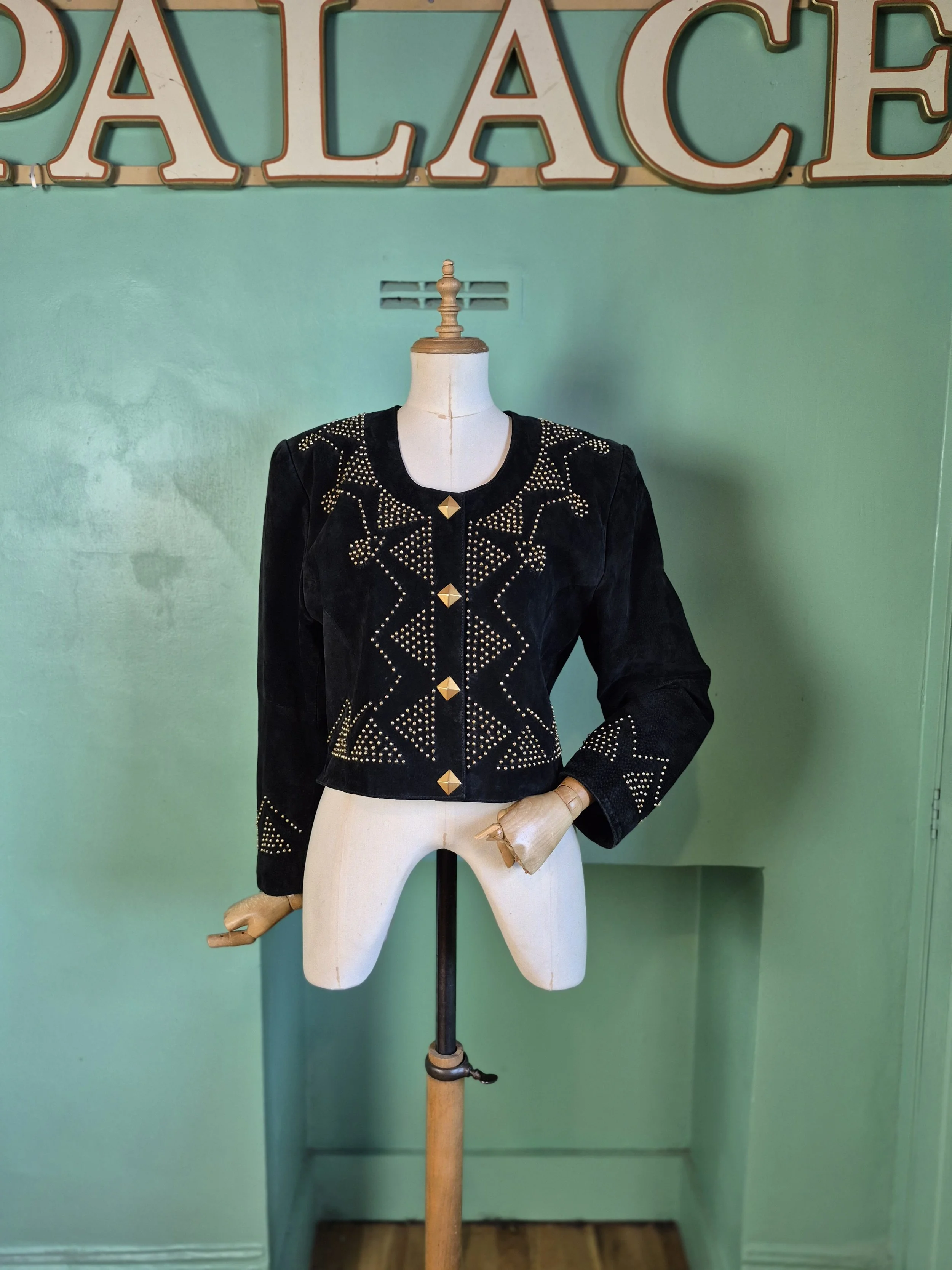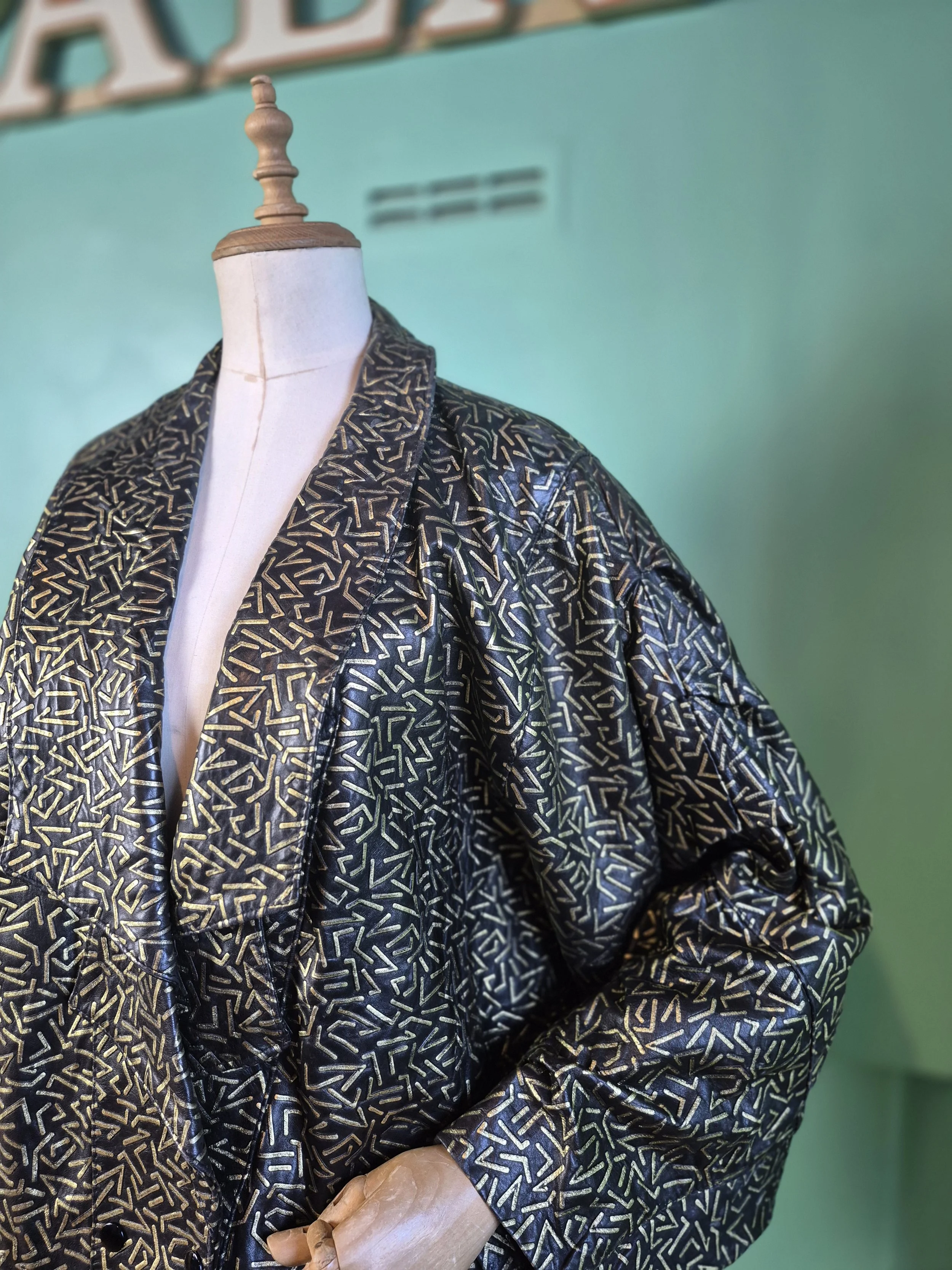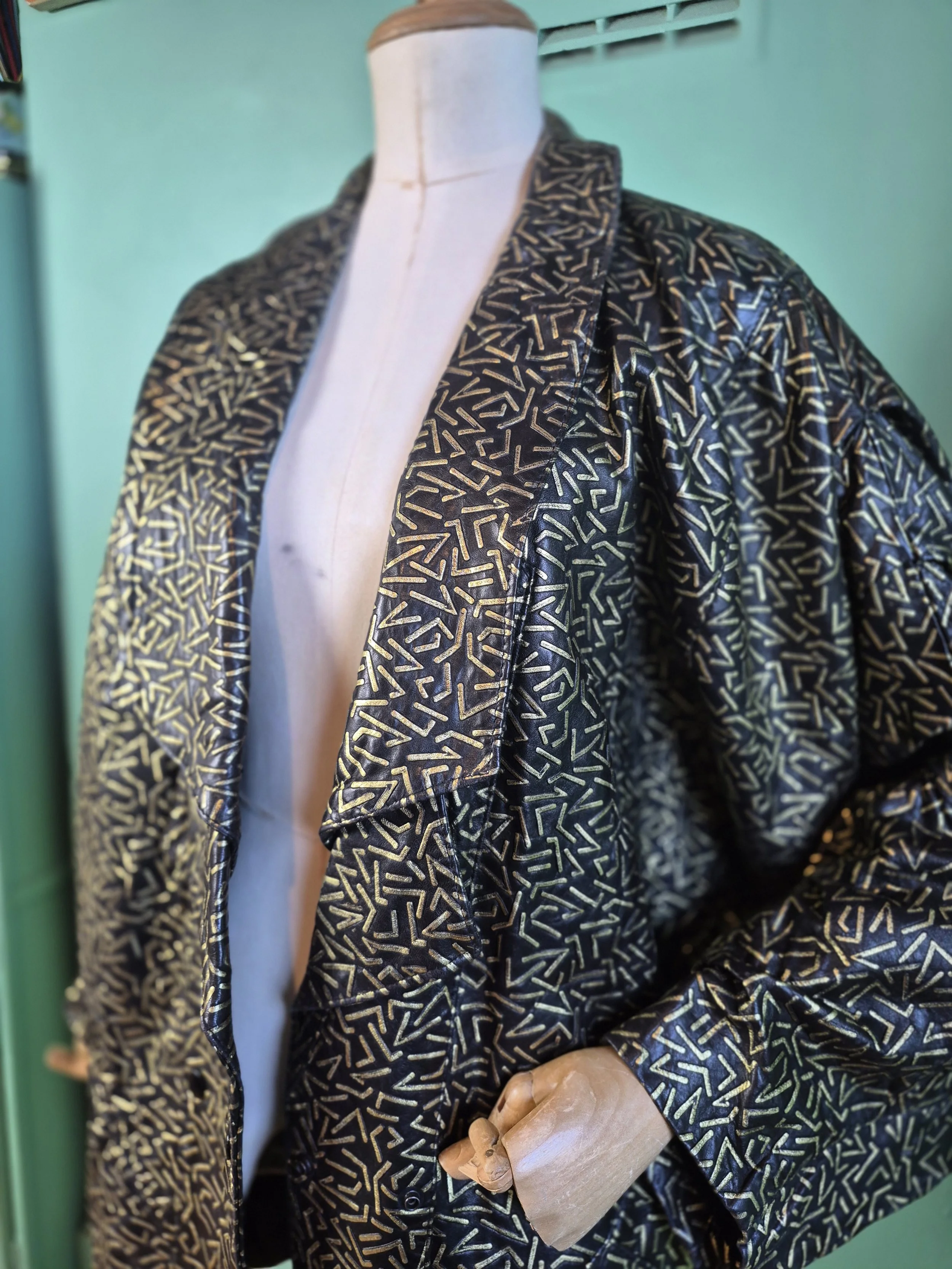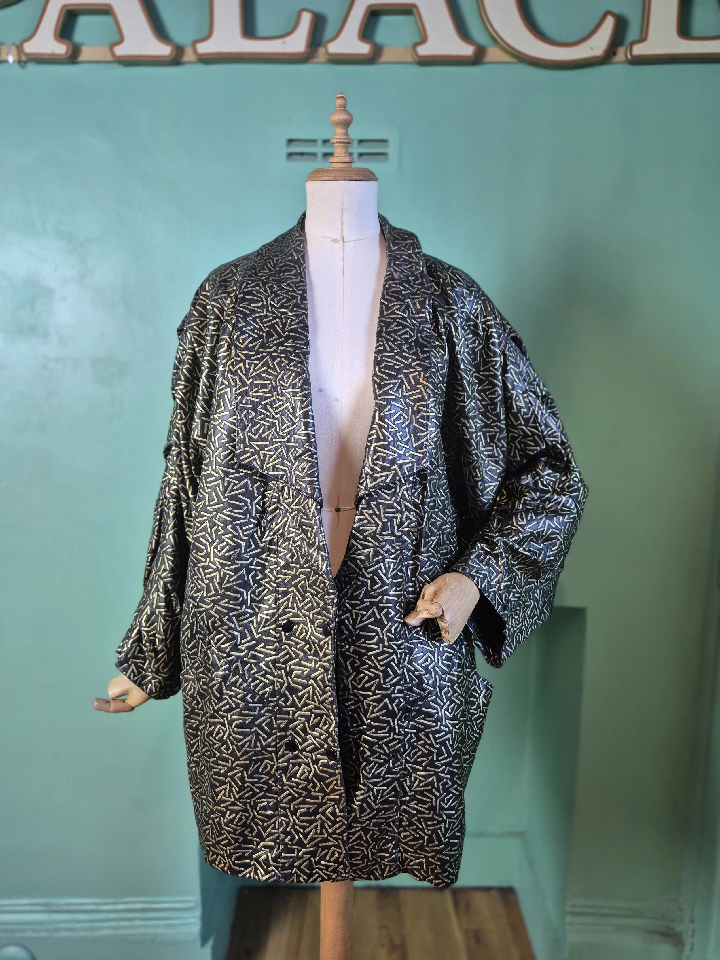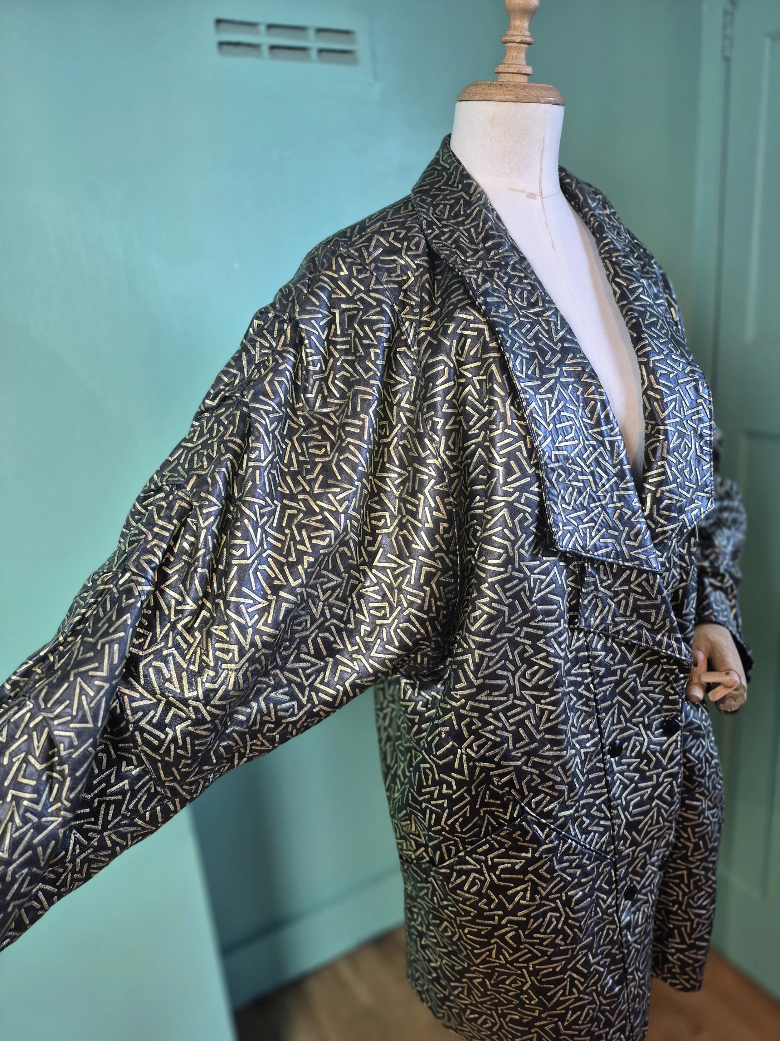Statement black leather coat with all over gold detailing. Features a double lapel and batwing sleeves. Fastens with double breasted poppers.
