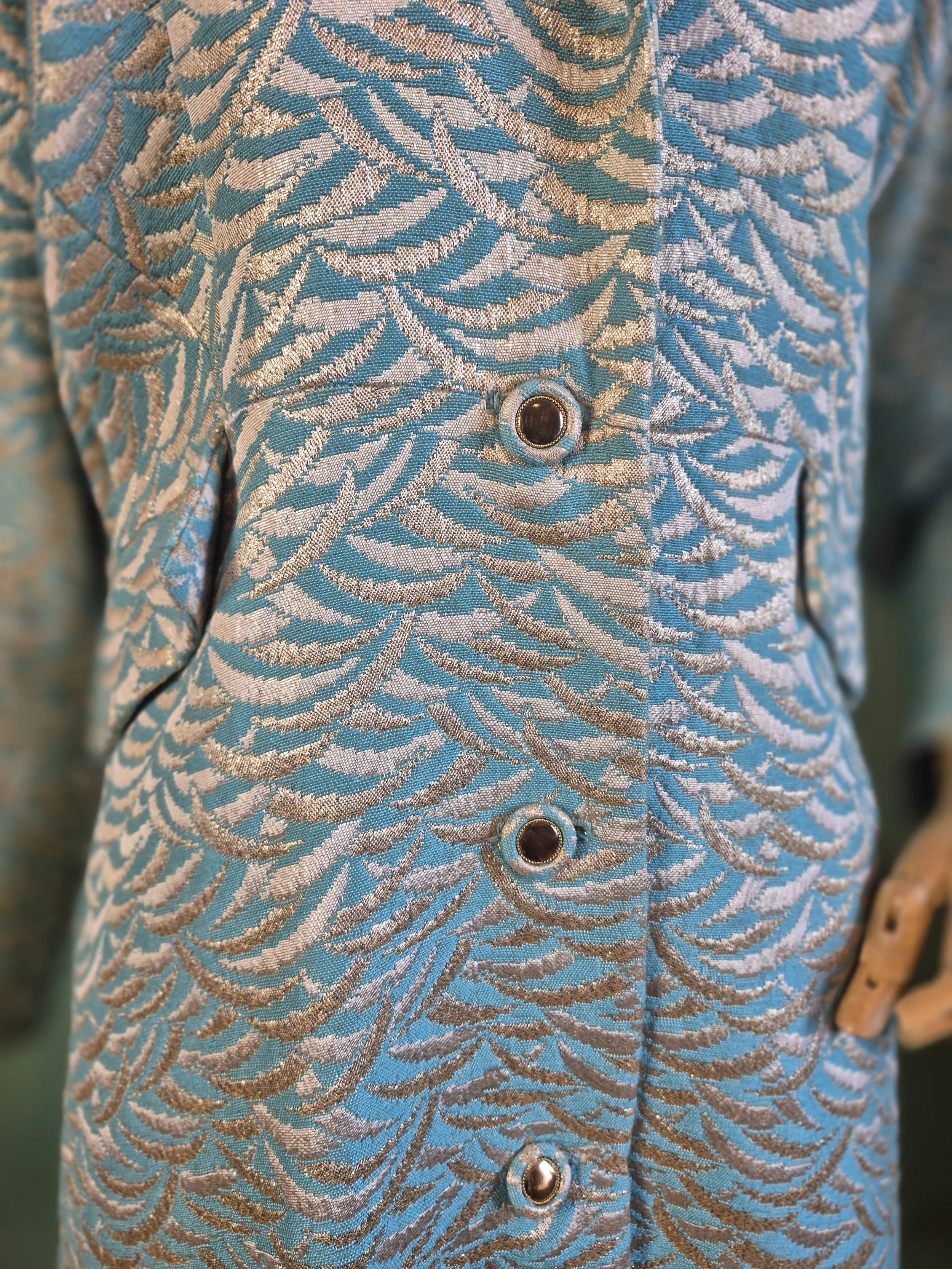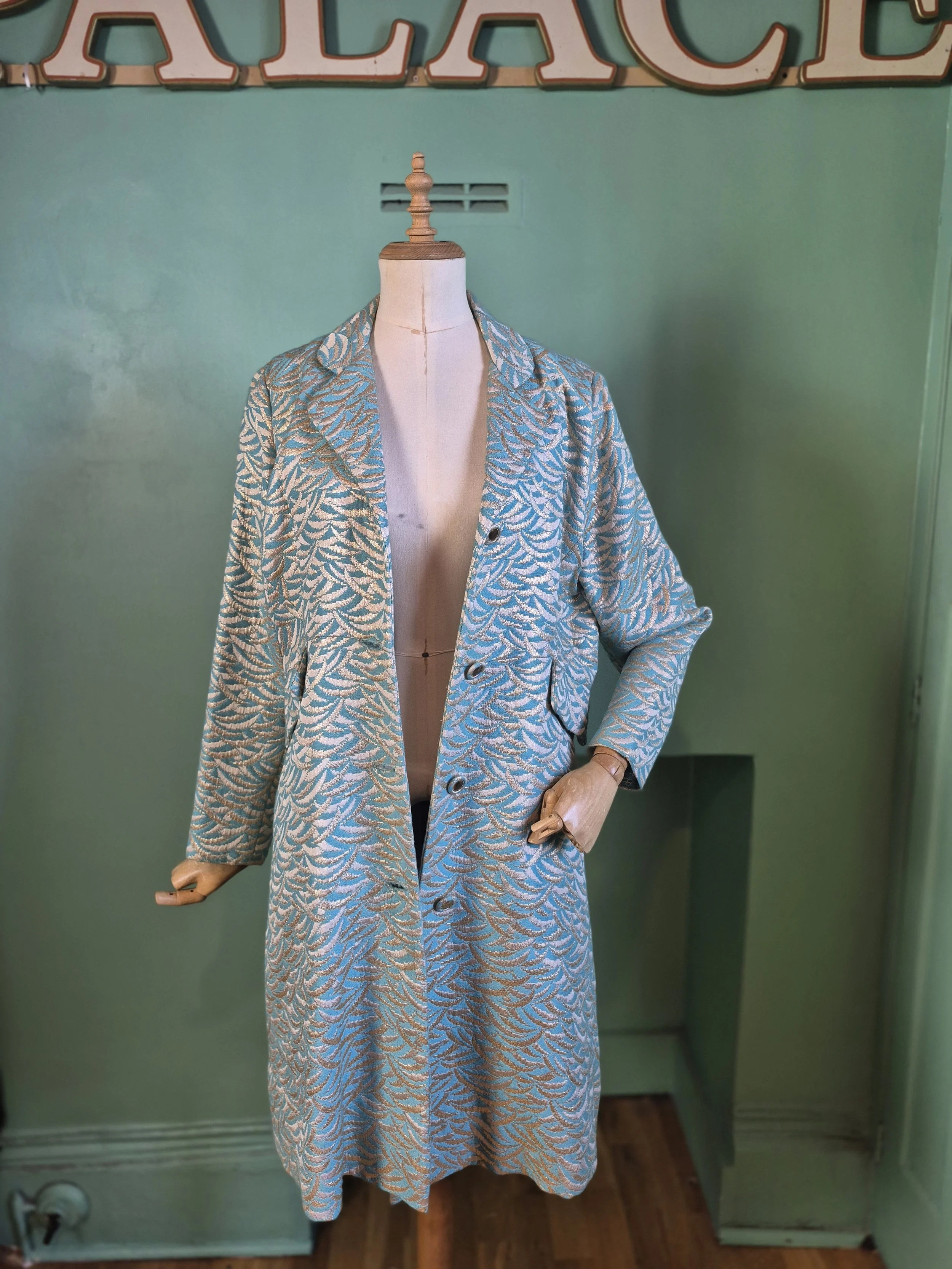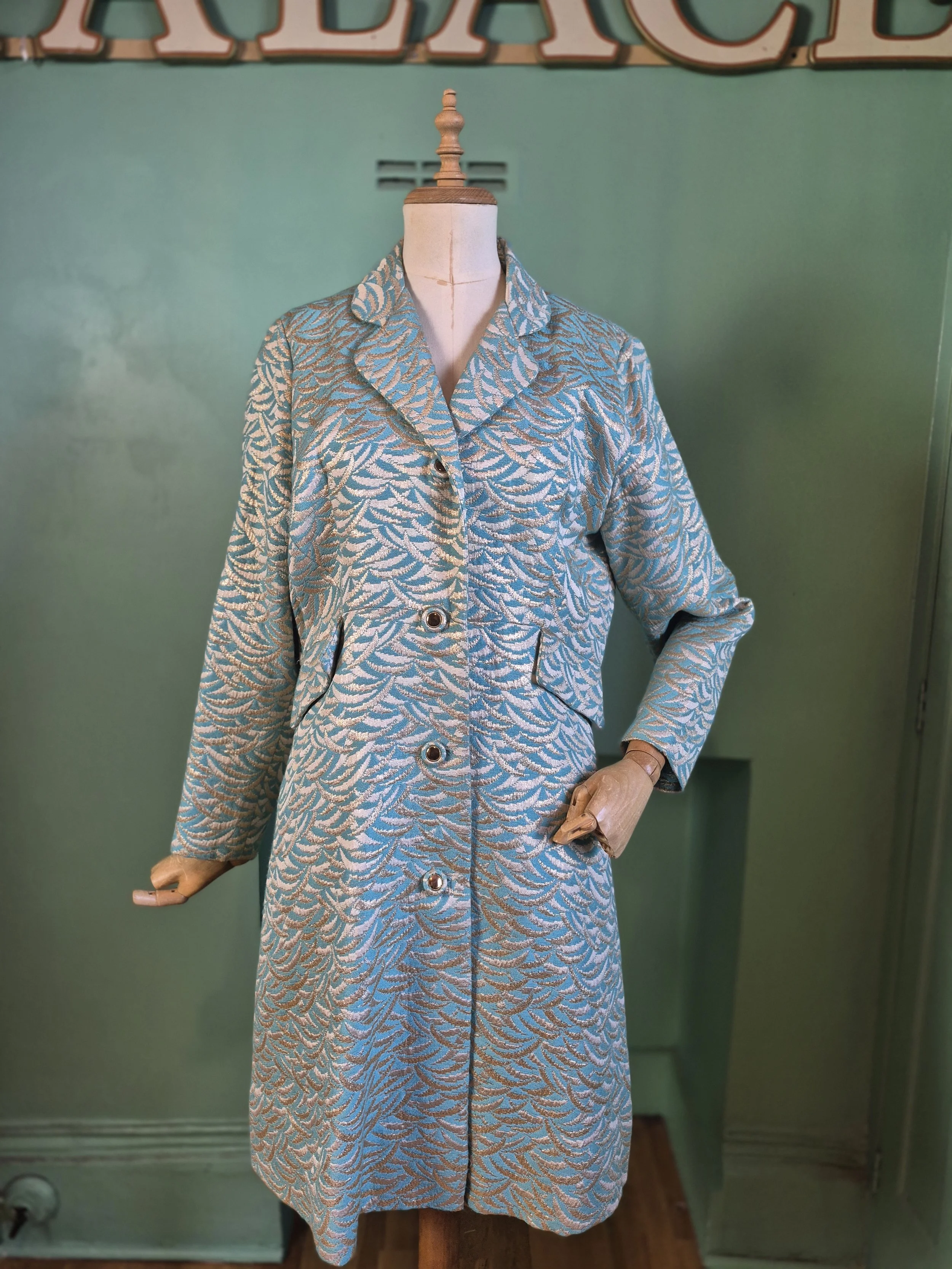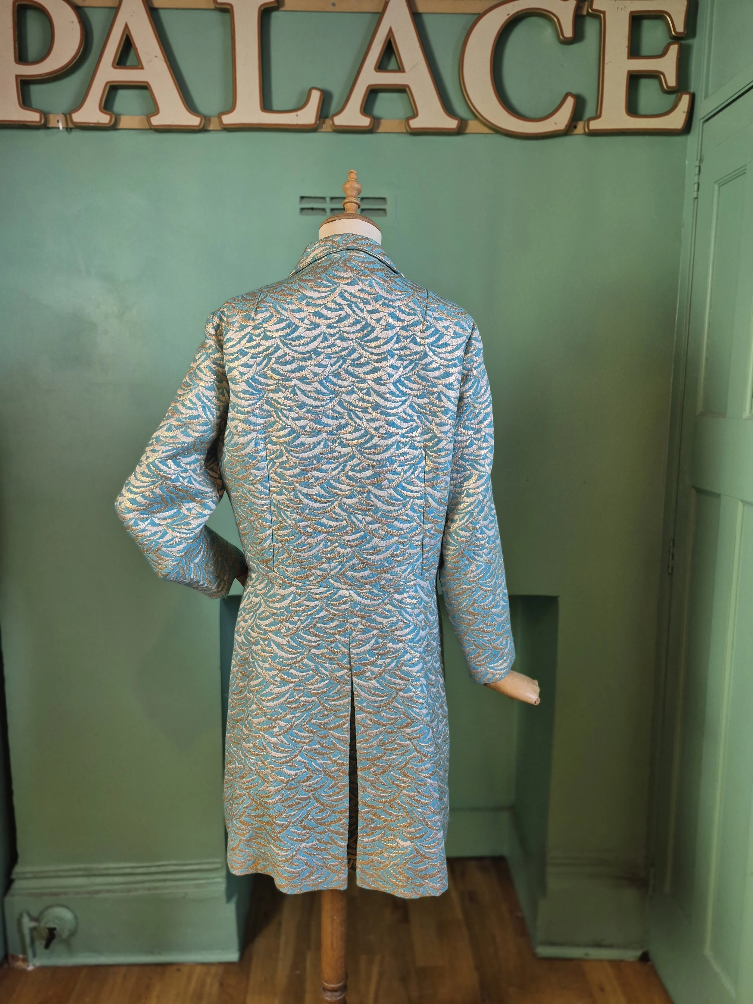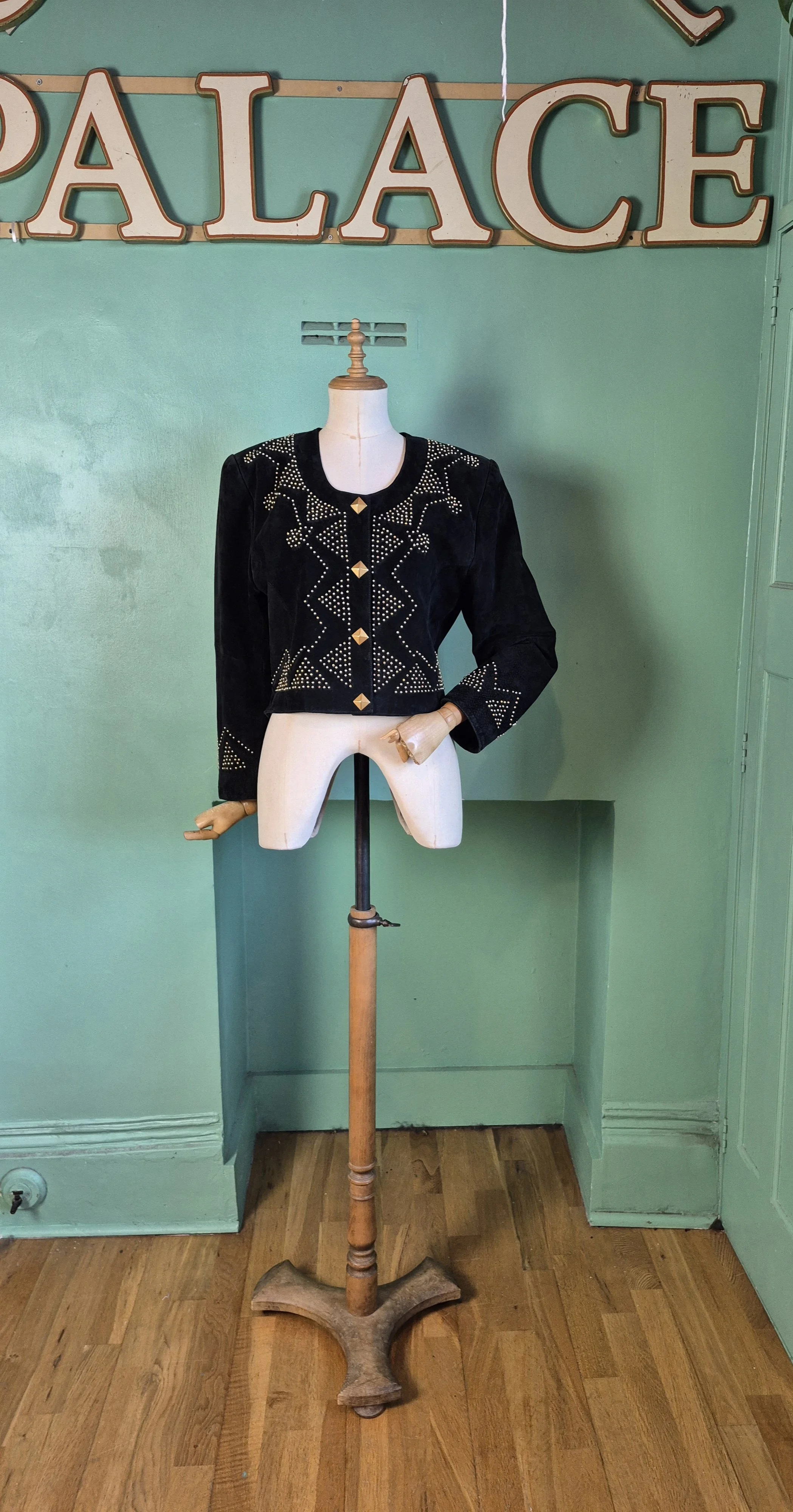 Statement black leather coat with all over gold detailing. Features a double lapel and batwing sleeves. Fastens with double breasted poppers.