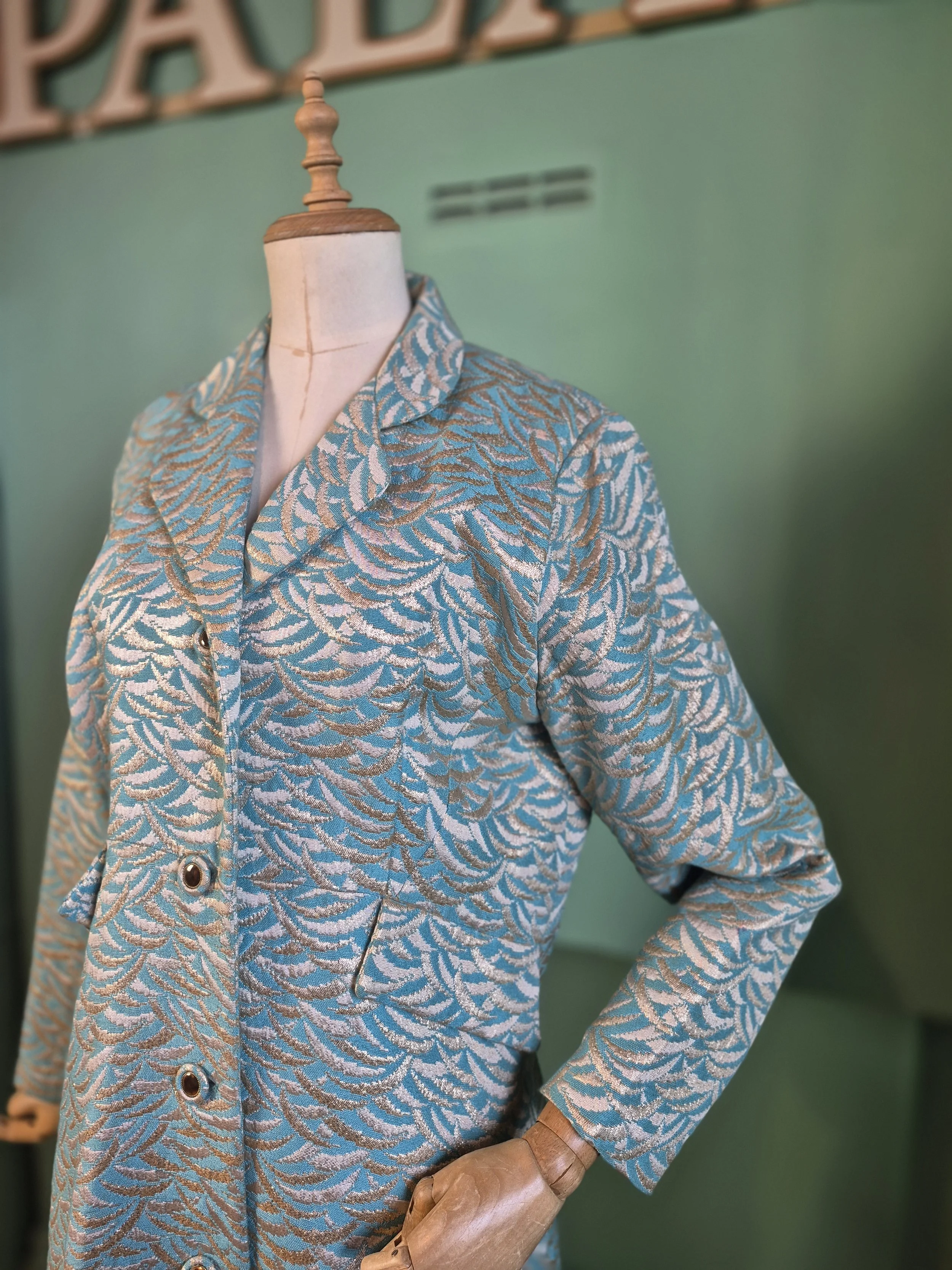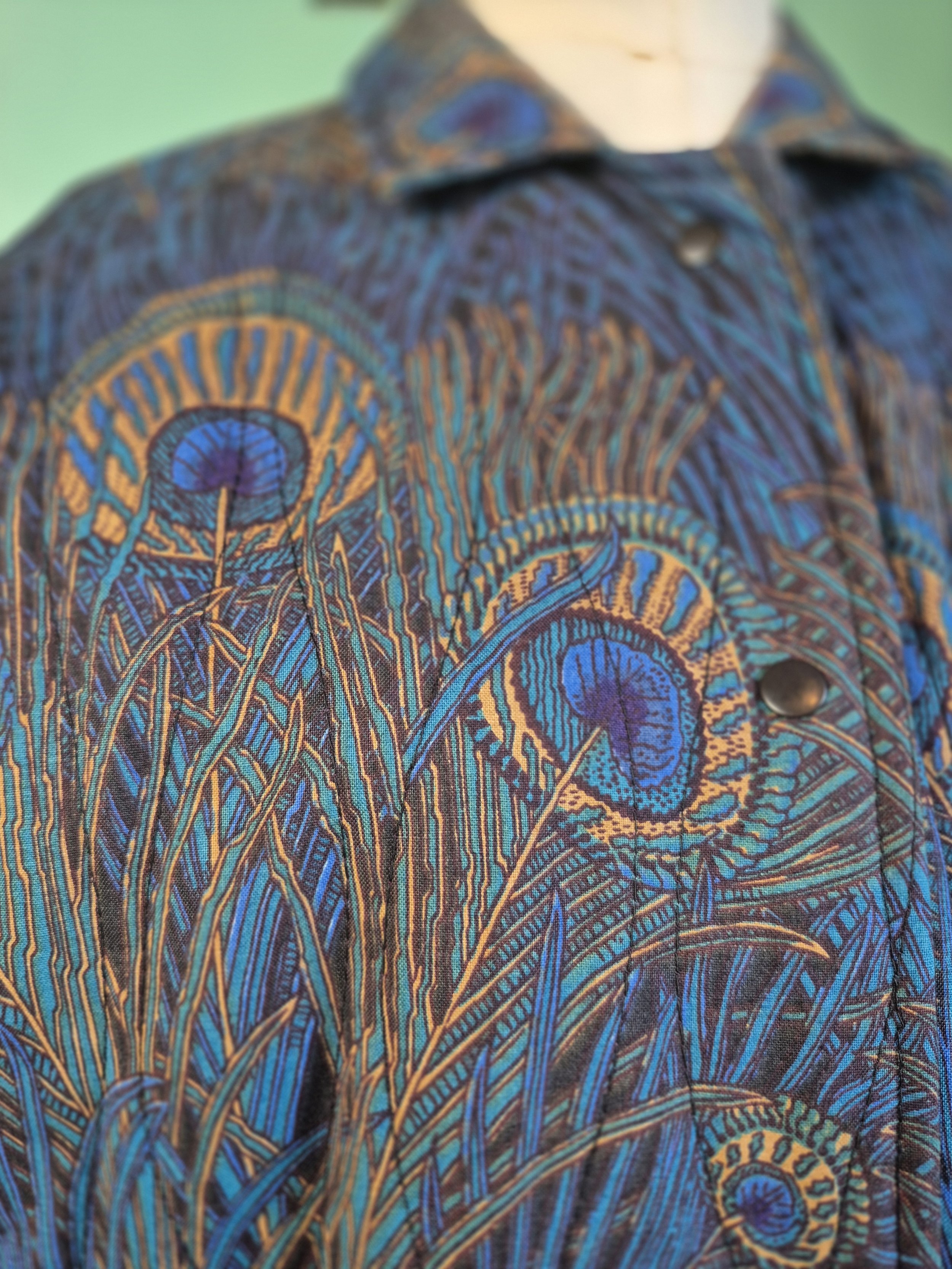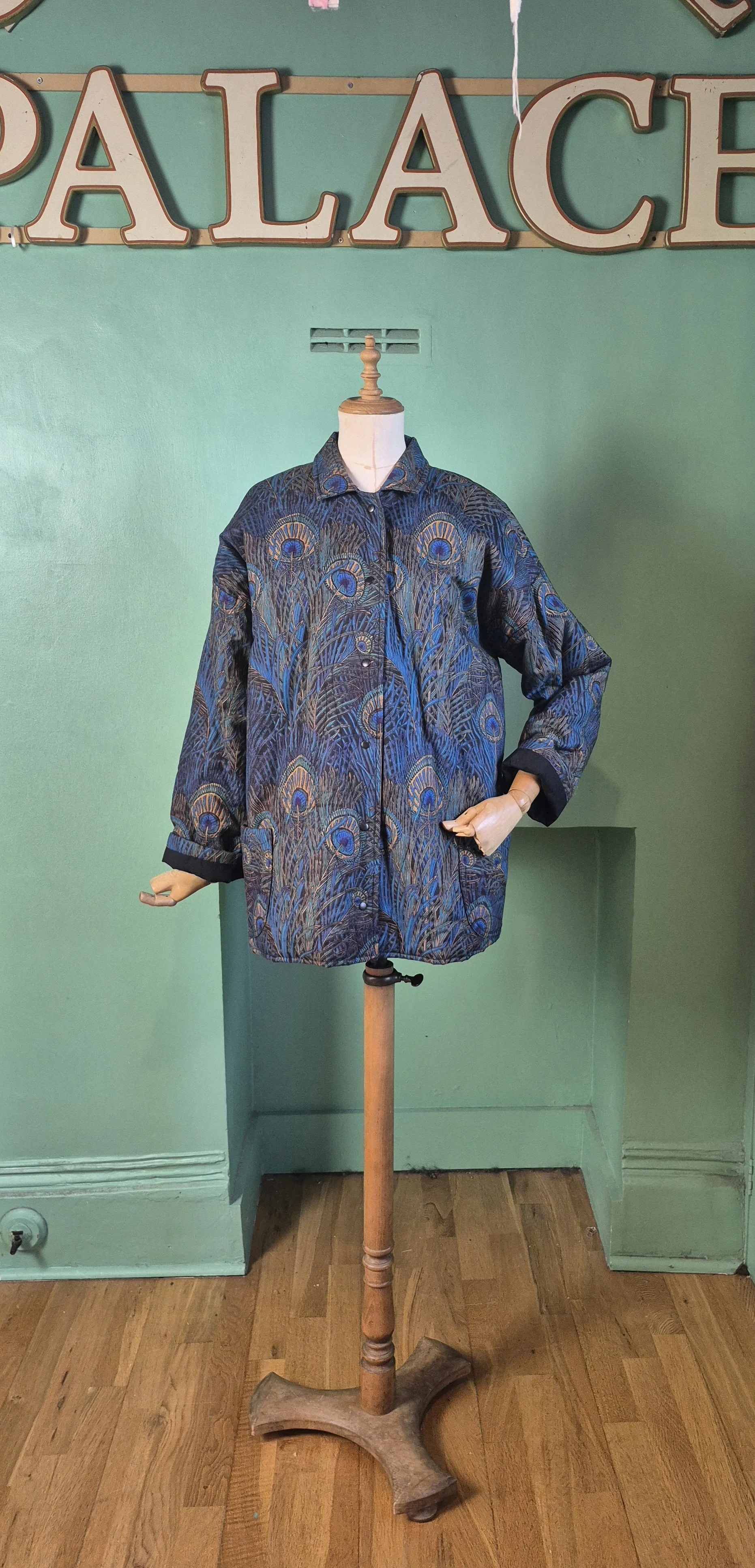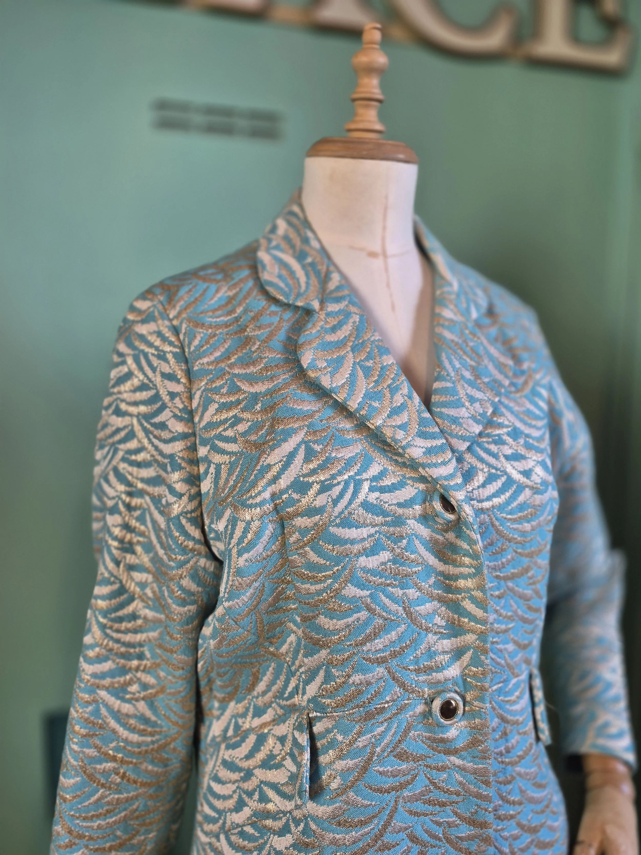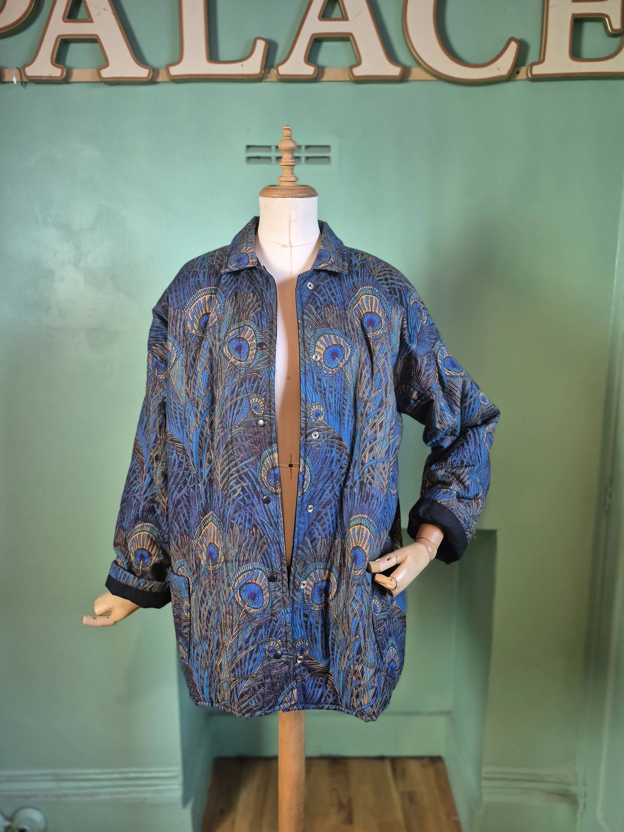 Statement black leather coat with all over gold detailing. Features a double lapel and batwing sleeves. Fastens with double breasted poppers.