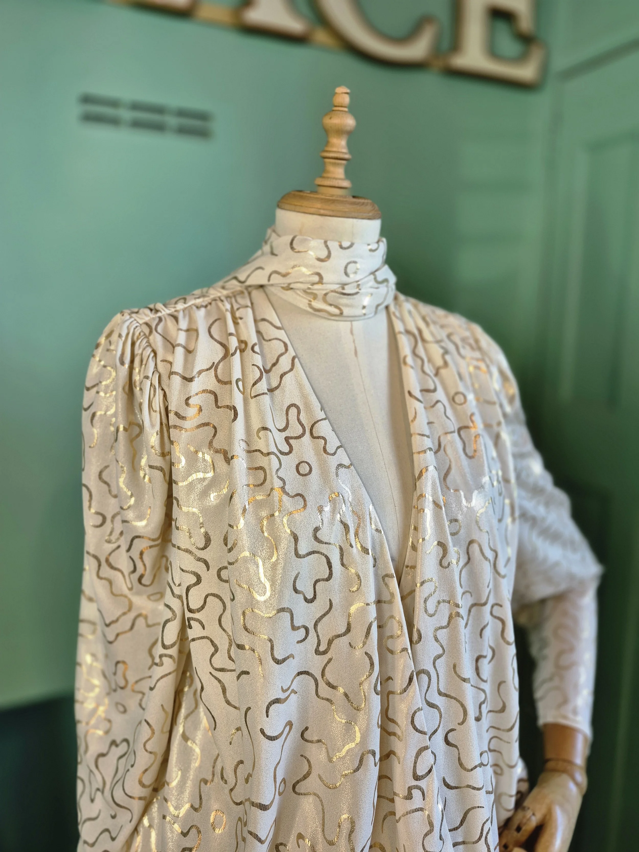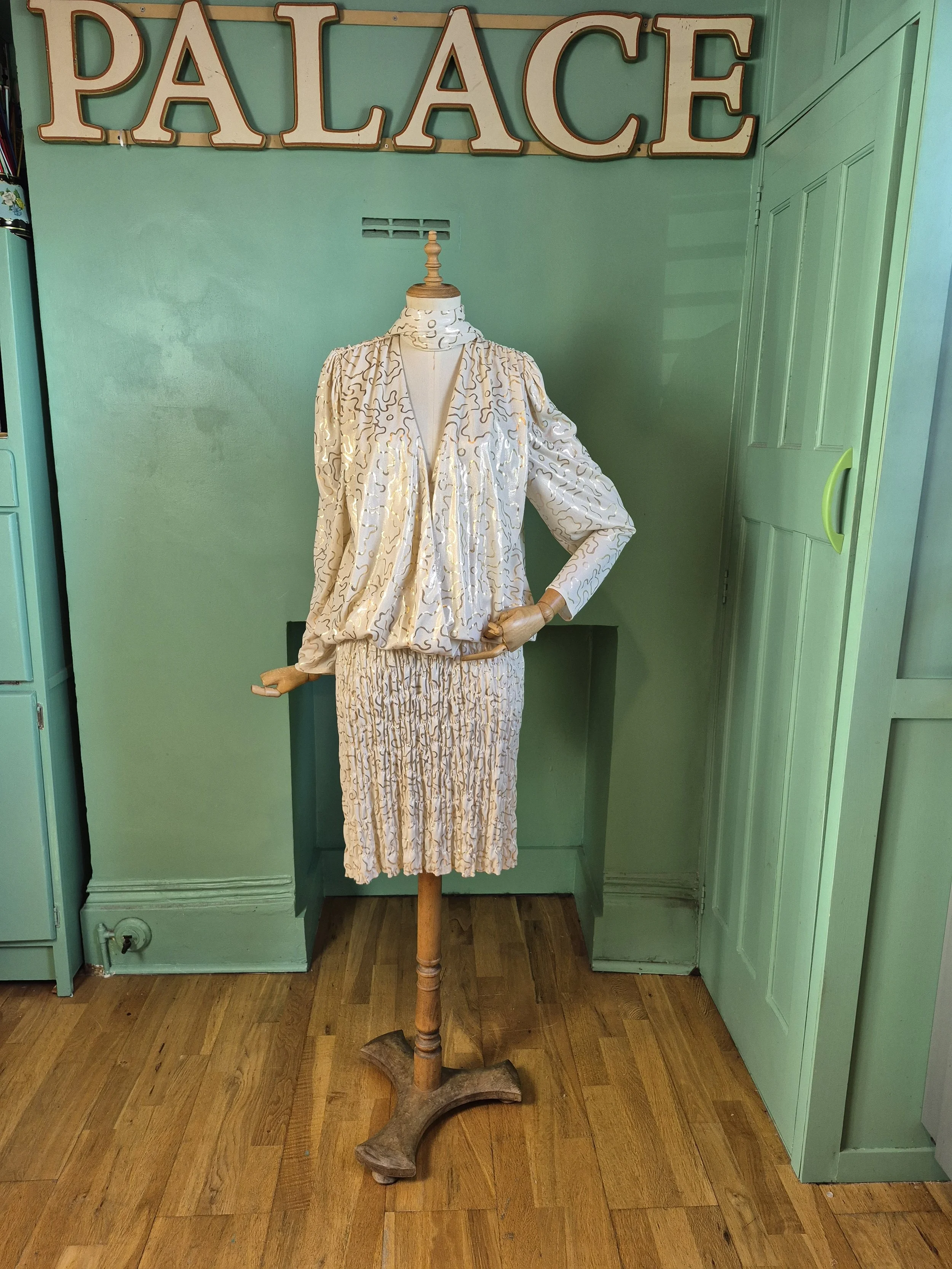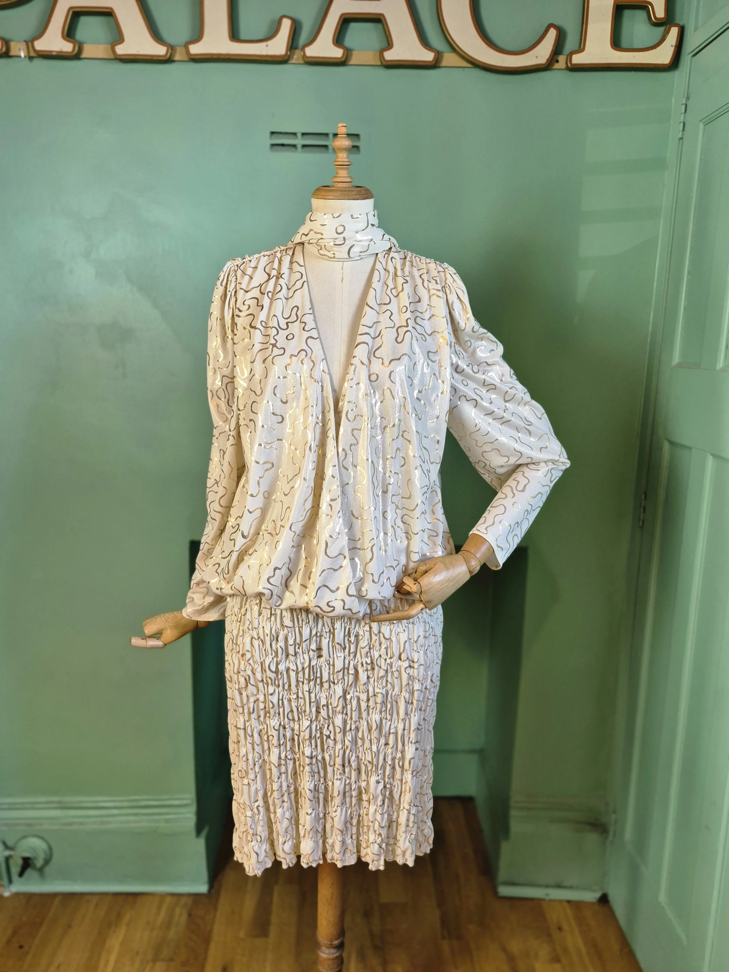 What a show stopper of an 80s dress. High neck with tie which can be worn various ways. lunging neckline and ruched skirt. So fabulous.