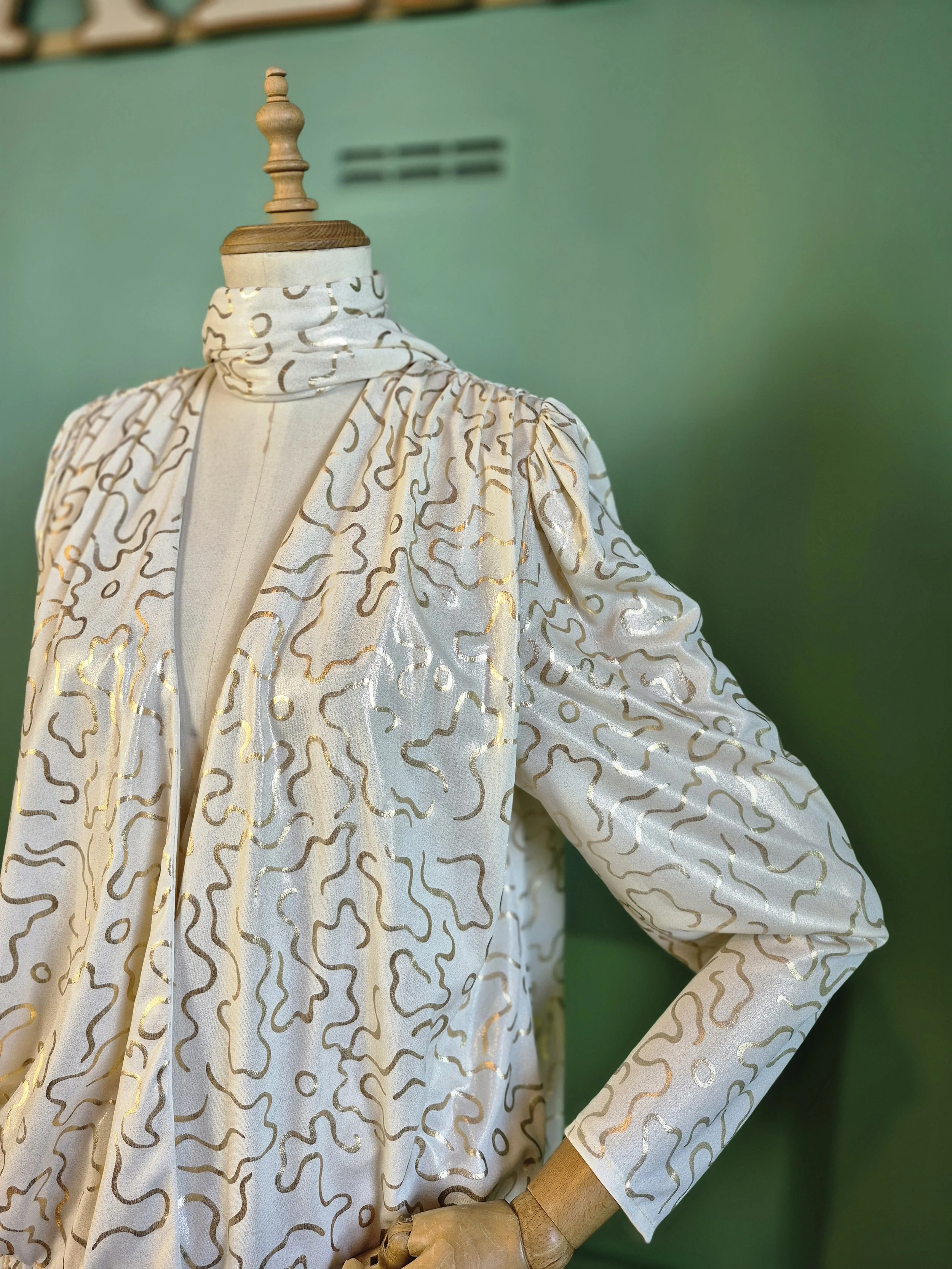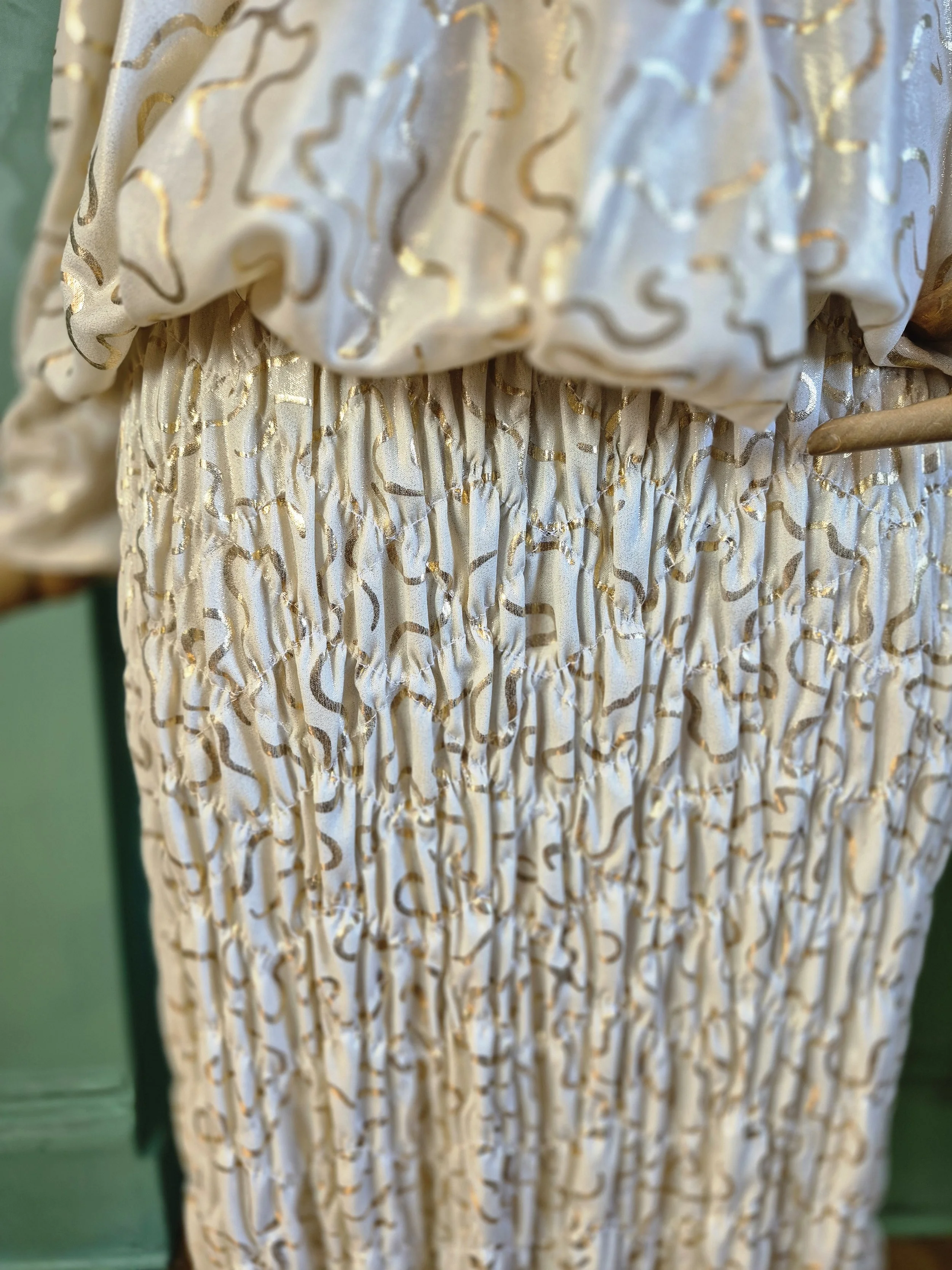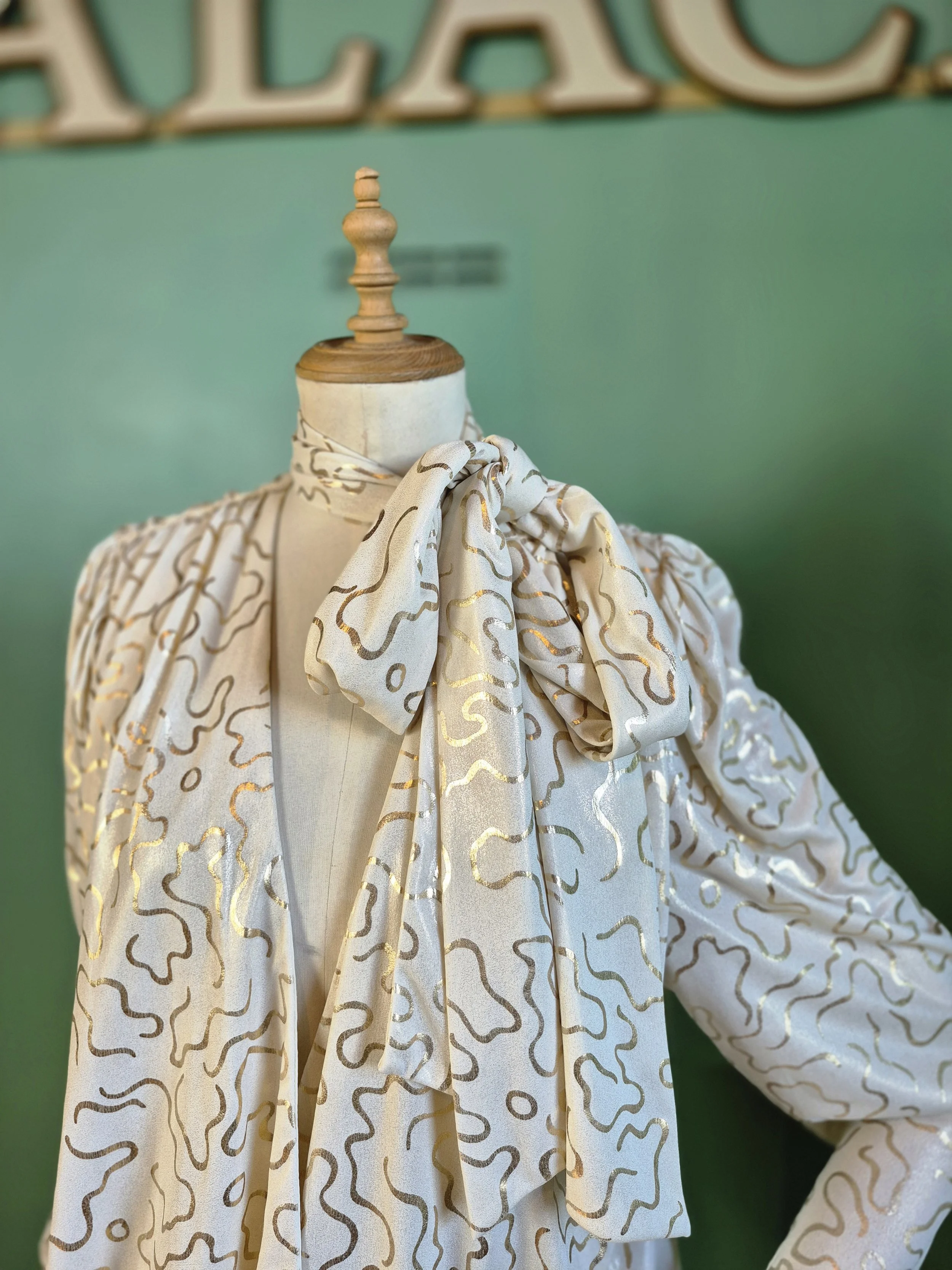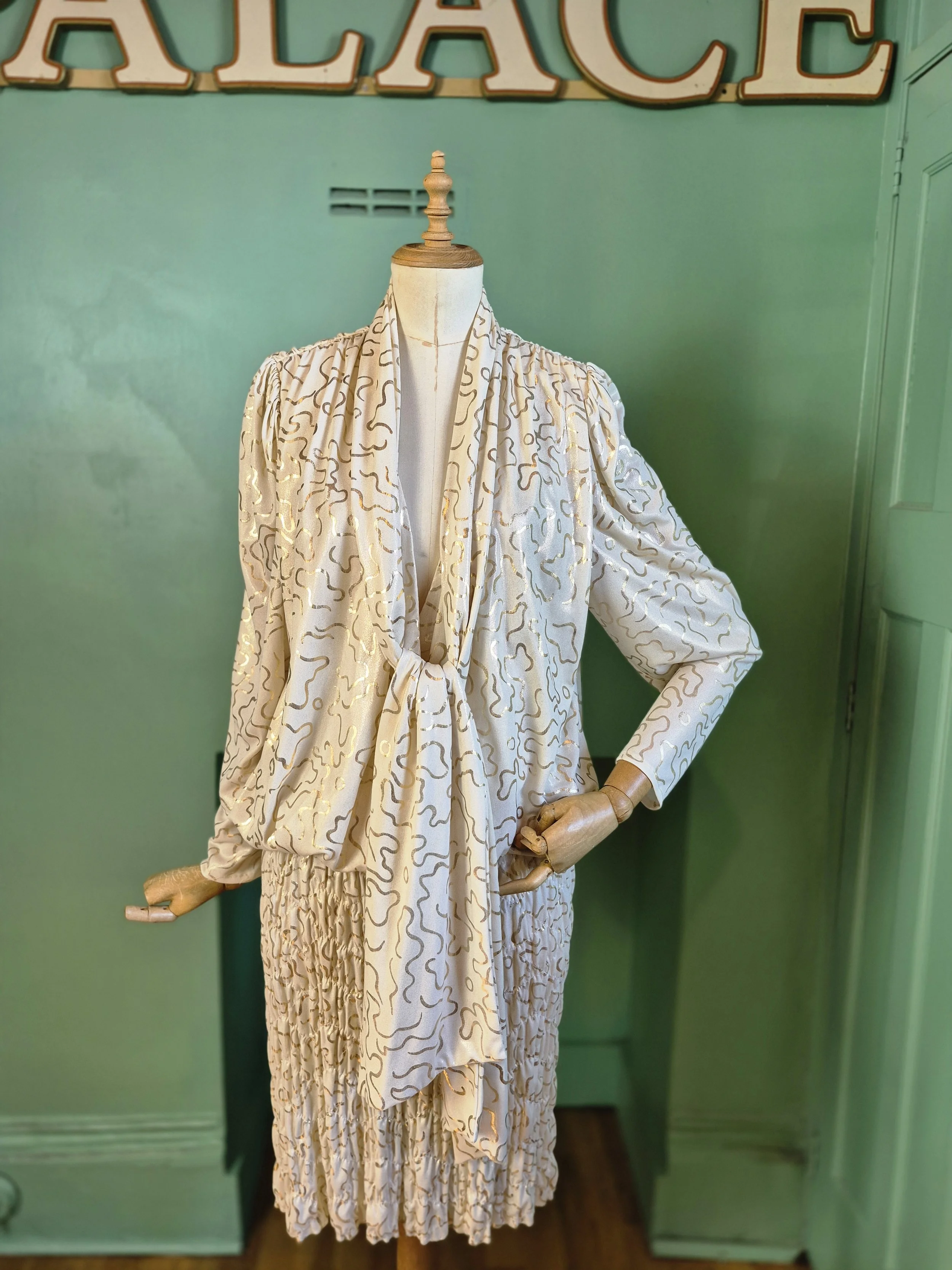 What a show stopper of an 80s dress. High neck with tie which can be worn various ways. lunging neckline and ruched skirt. So fabulous.