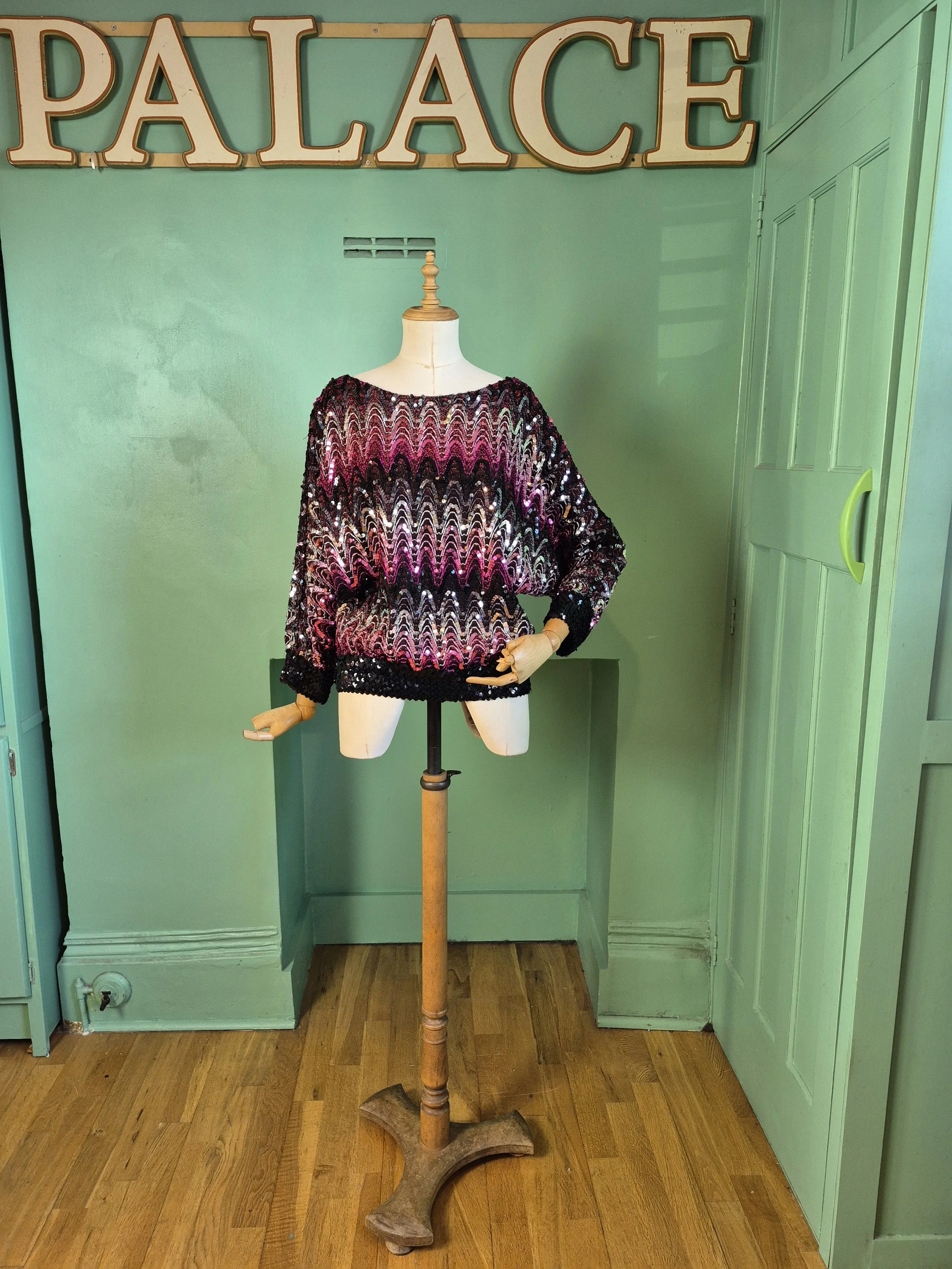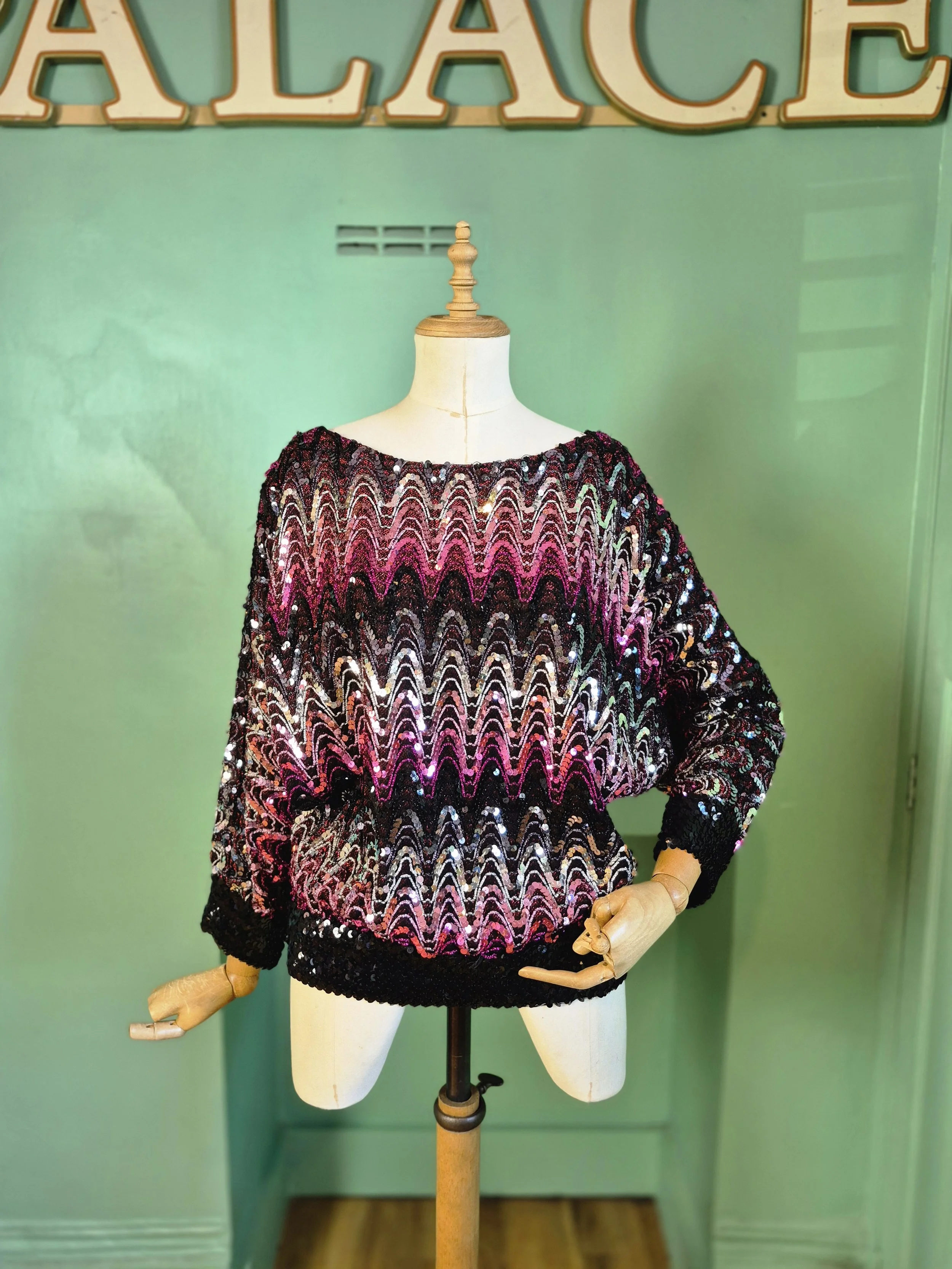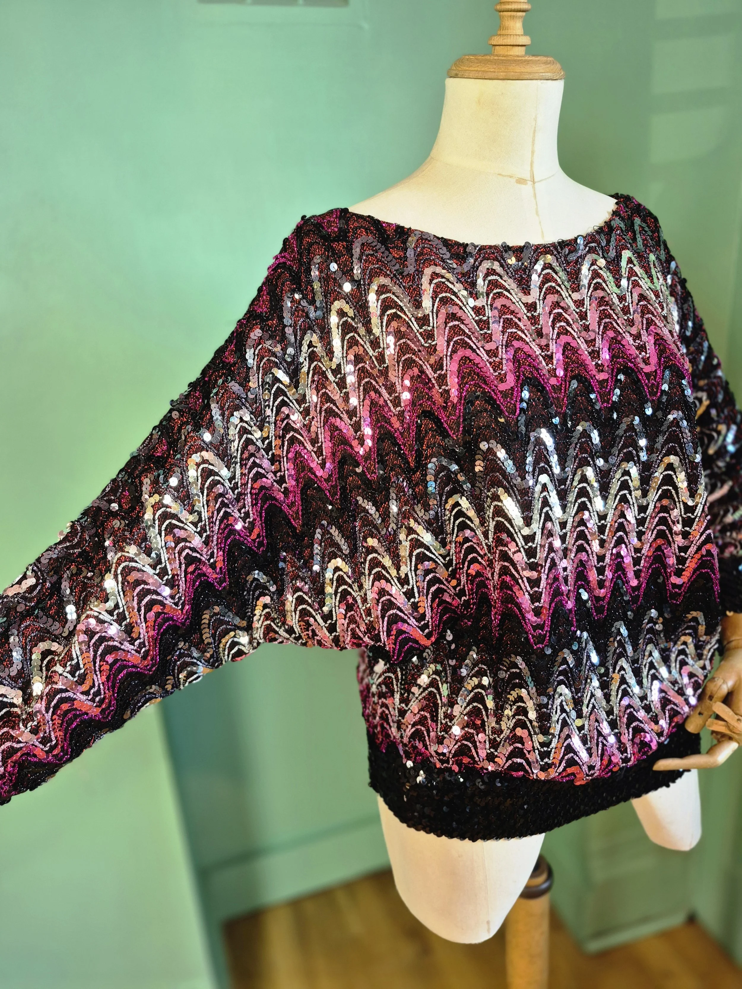 Gorgeous slouchy rainbow sequin top by Ann Green. Batwing sleeves and contrast cuffs and waistband with stretch.