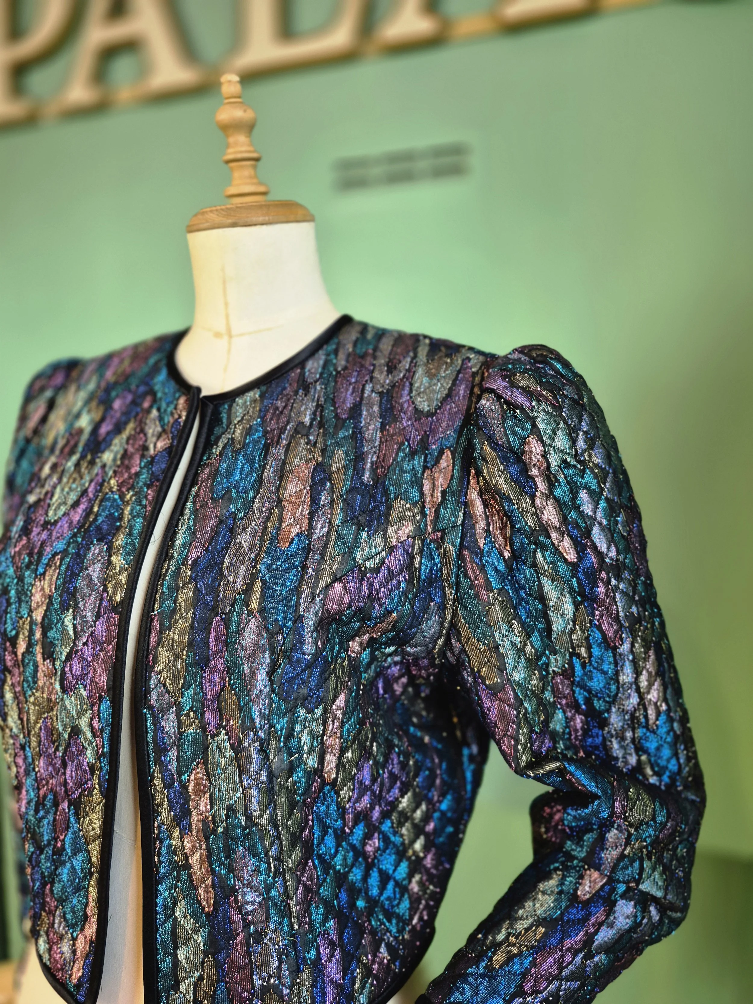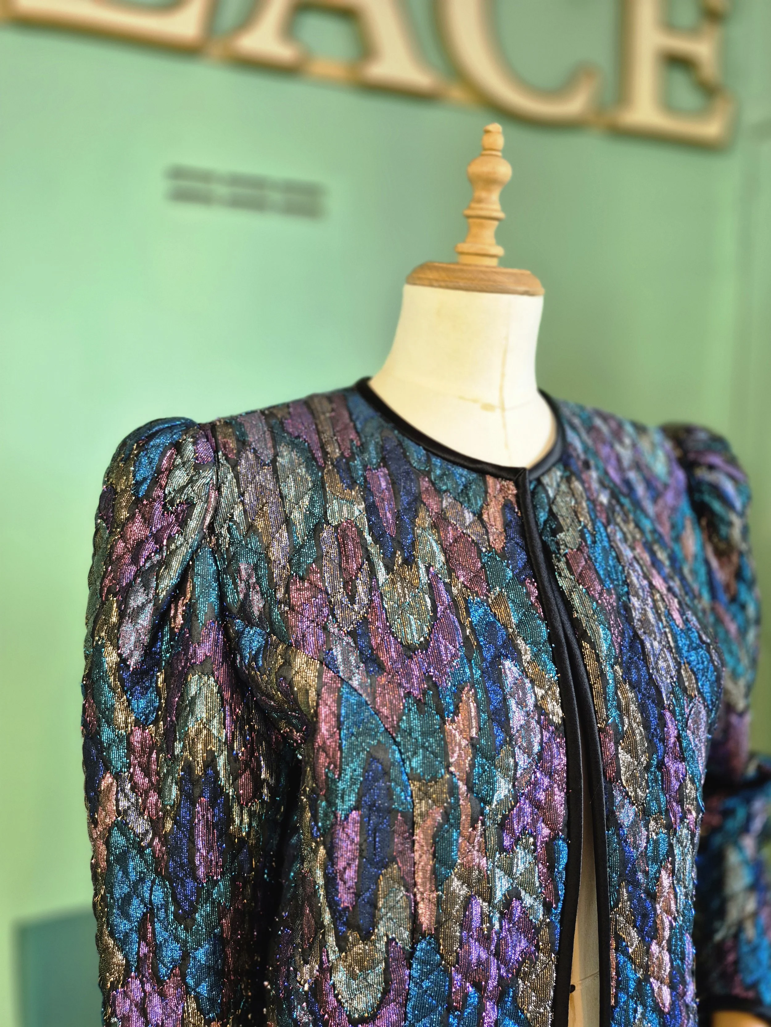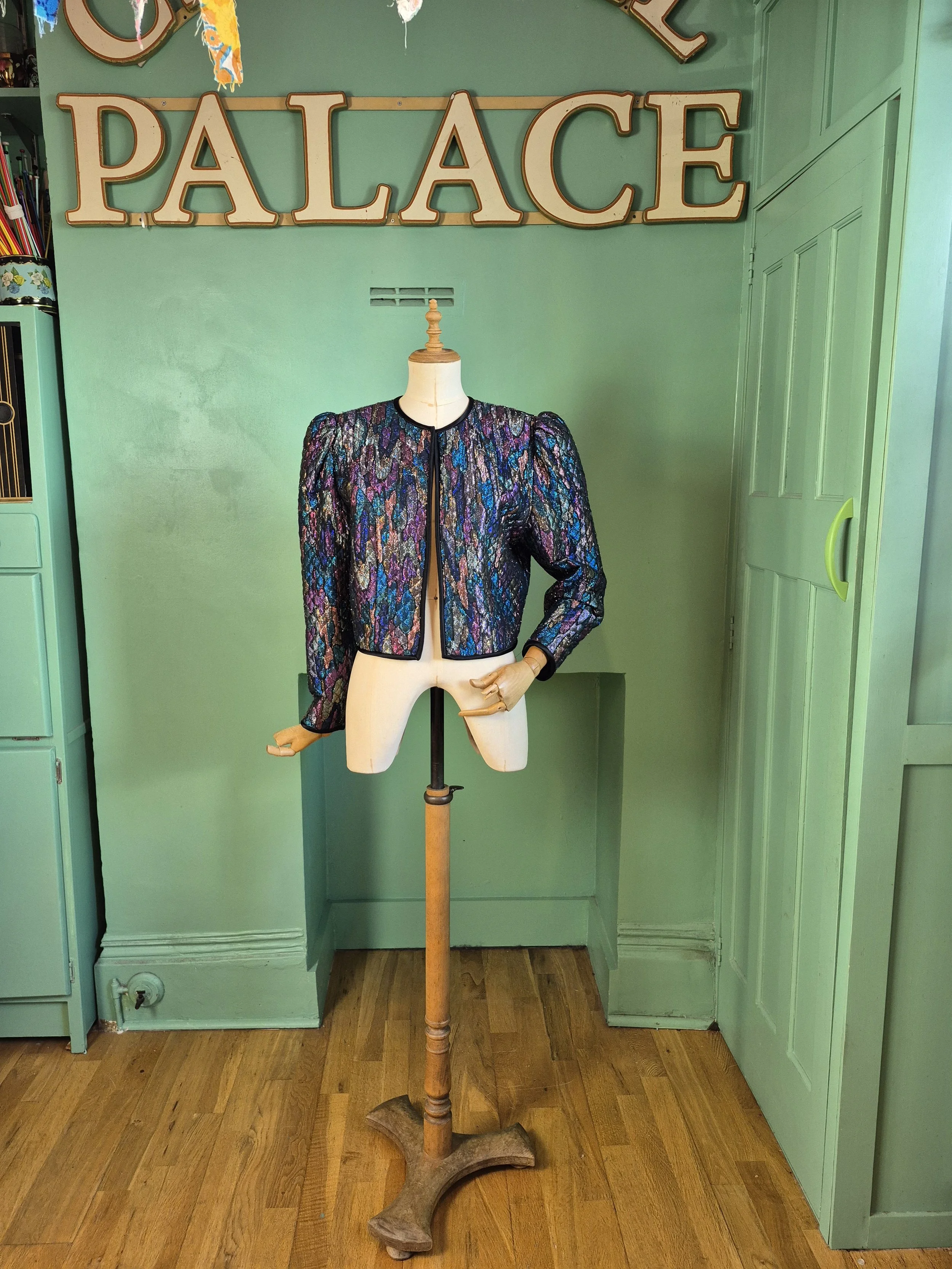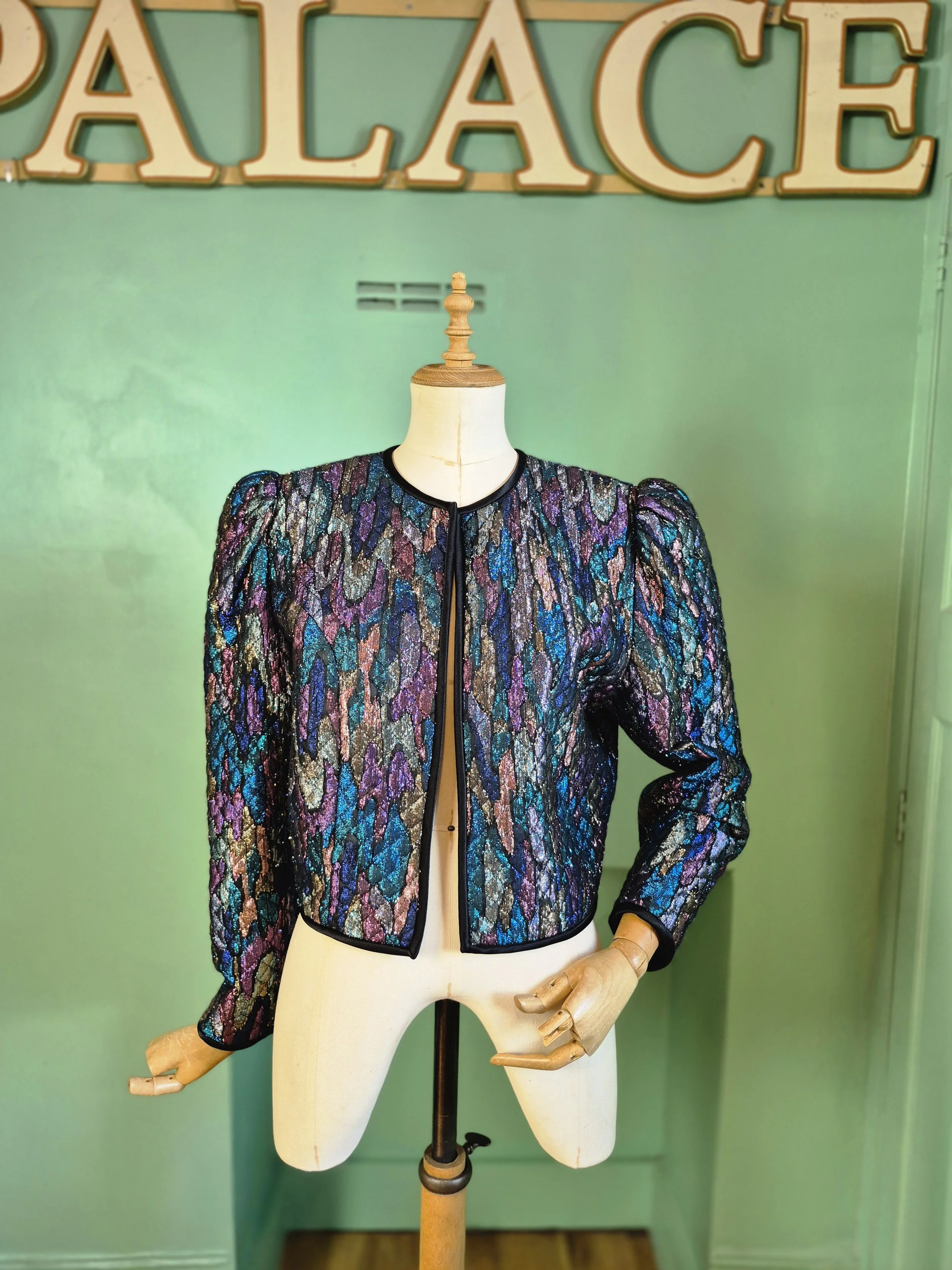 What a bobby dazzler. Lightly quilted lurex jacket with structure. No fastenings. Just add over anything to bring the party.