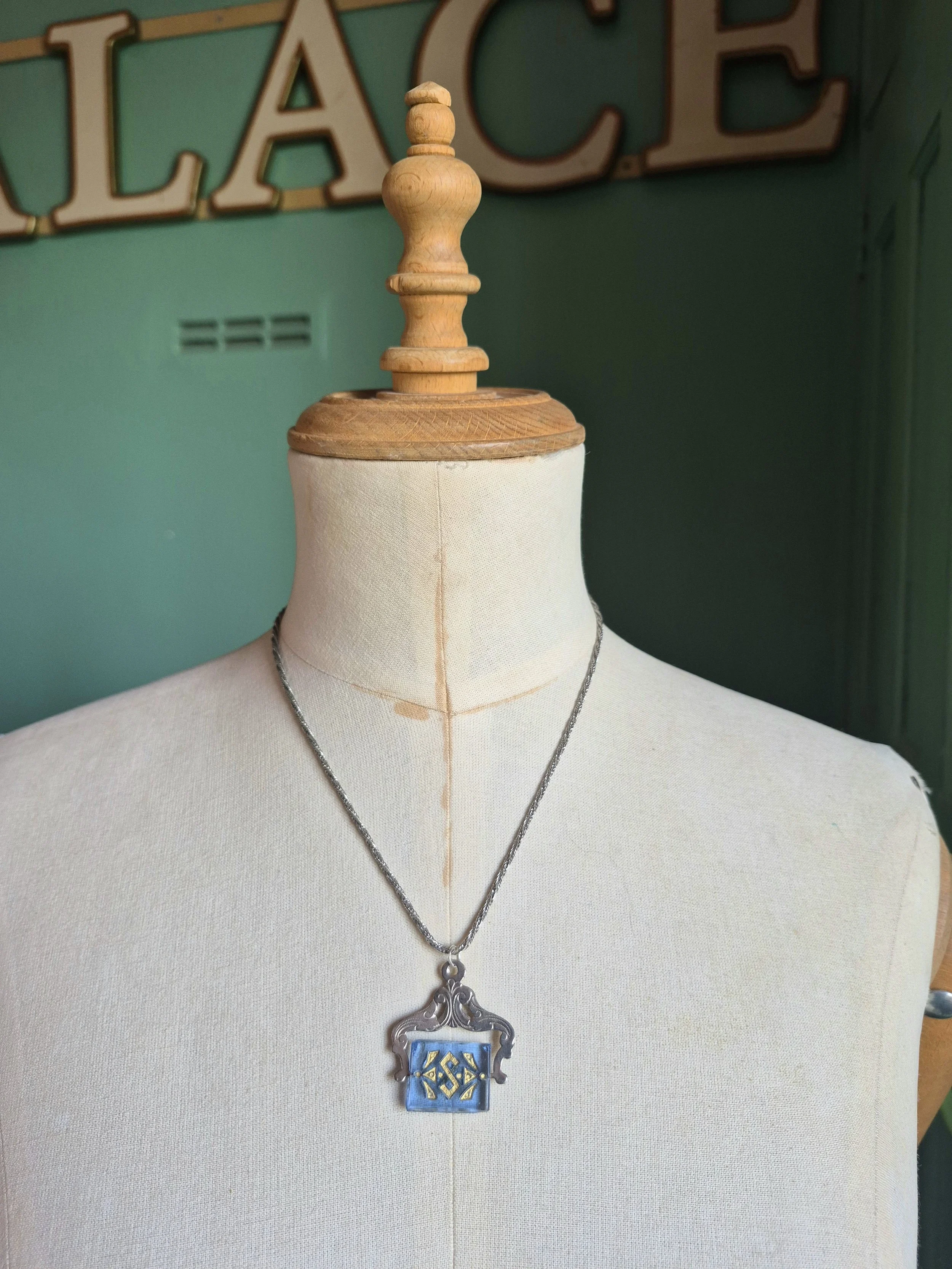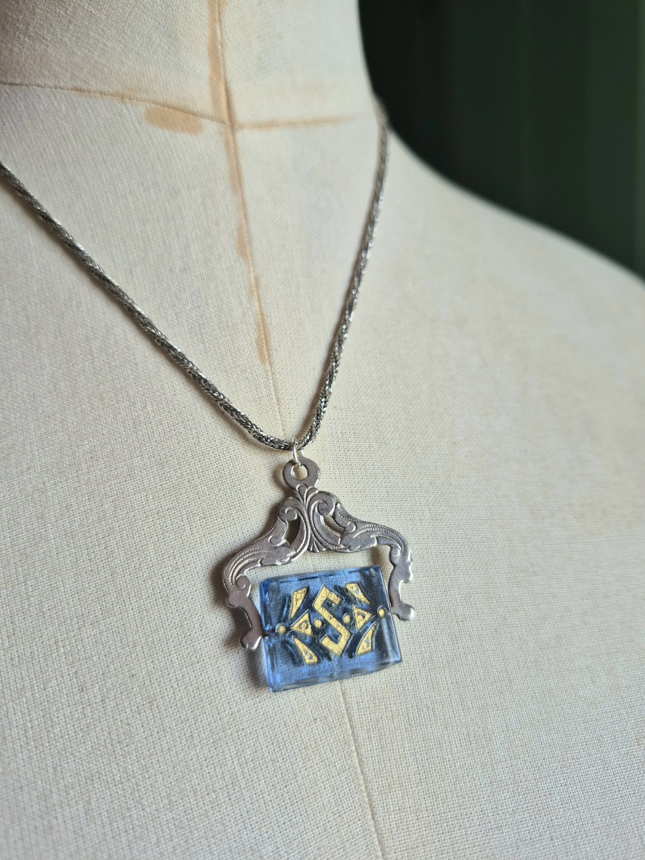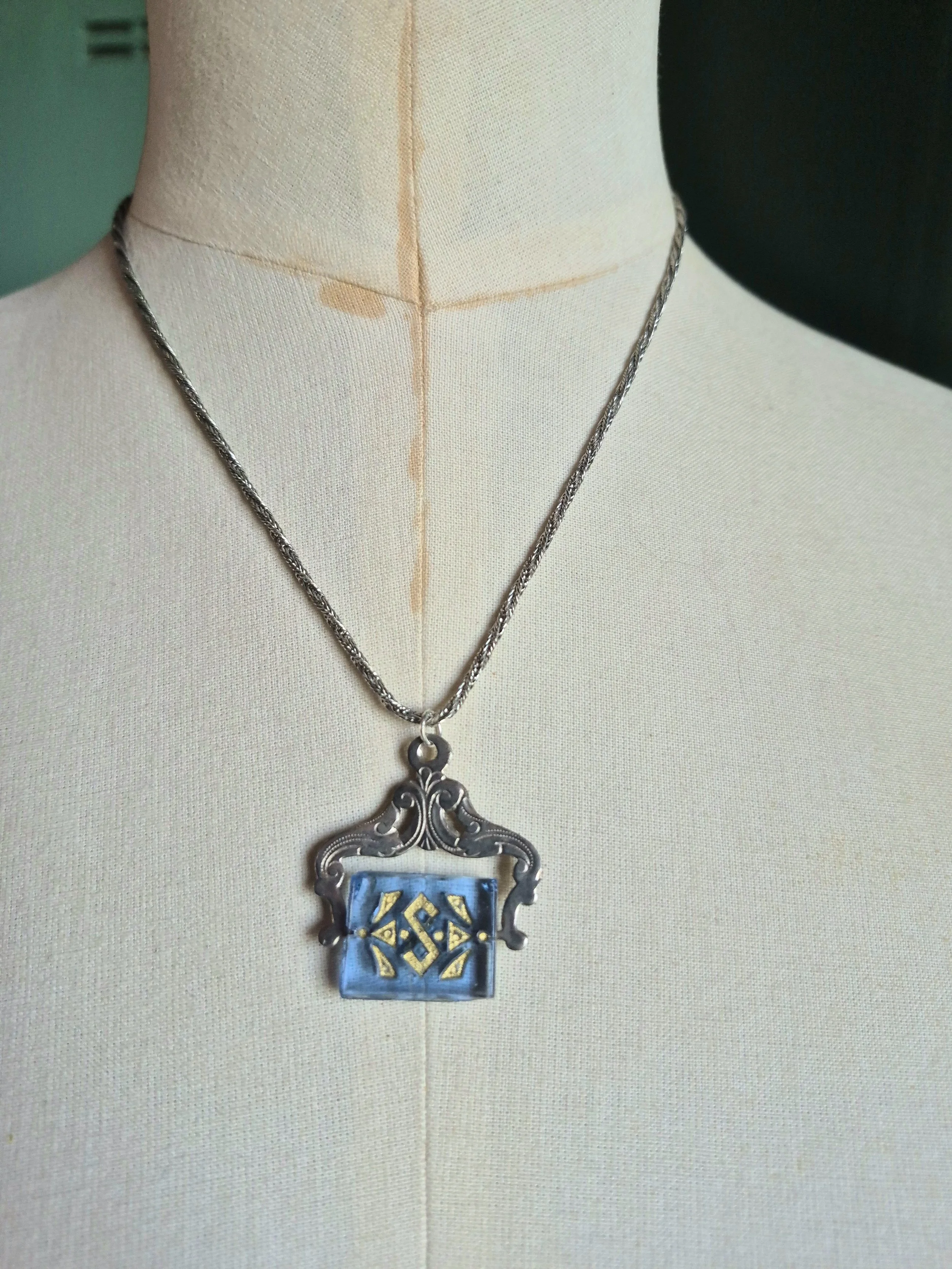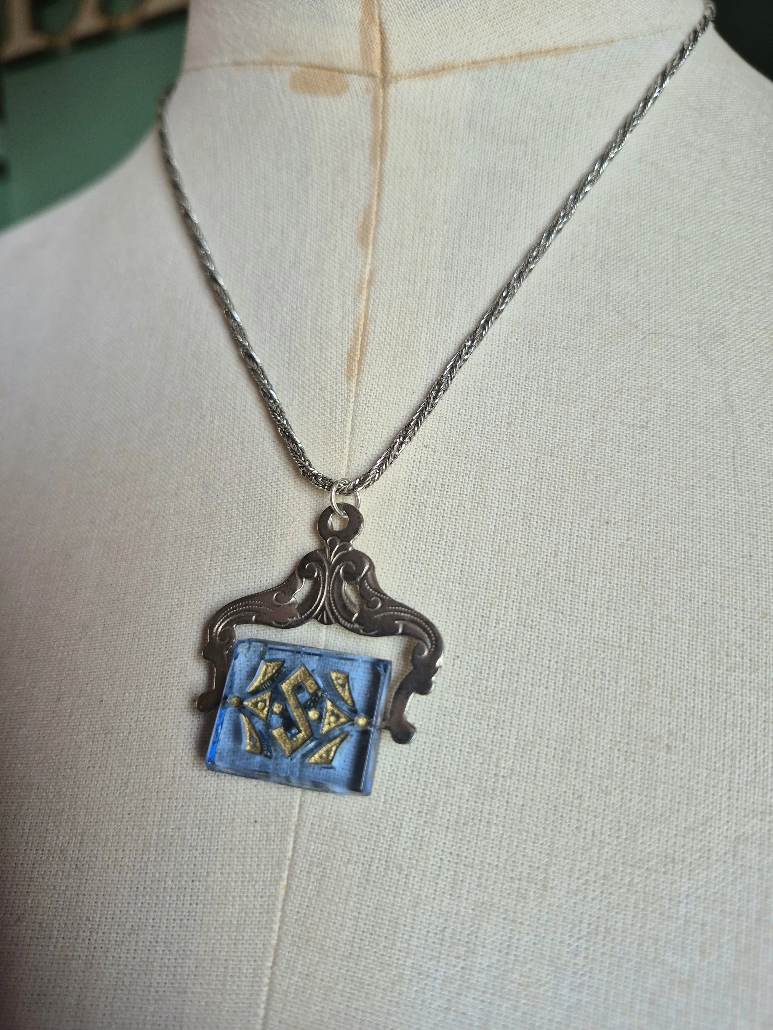 Delicate necklace made from a silver tone watch fob with carved pale blue glass piece.