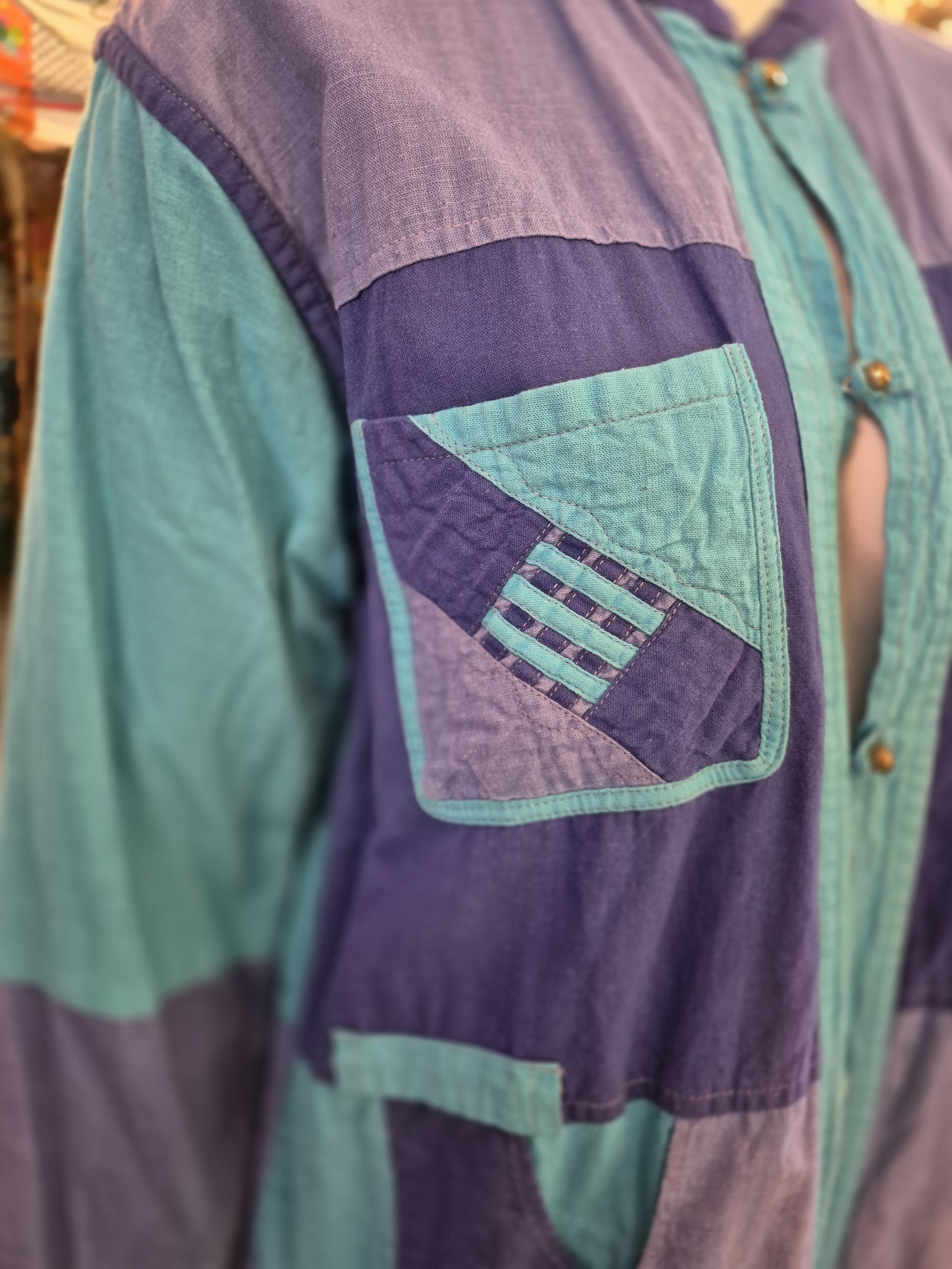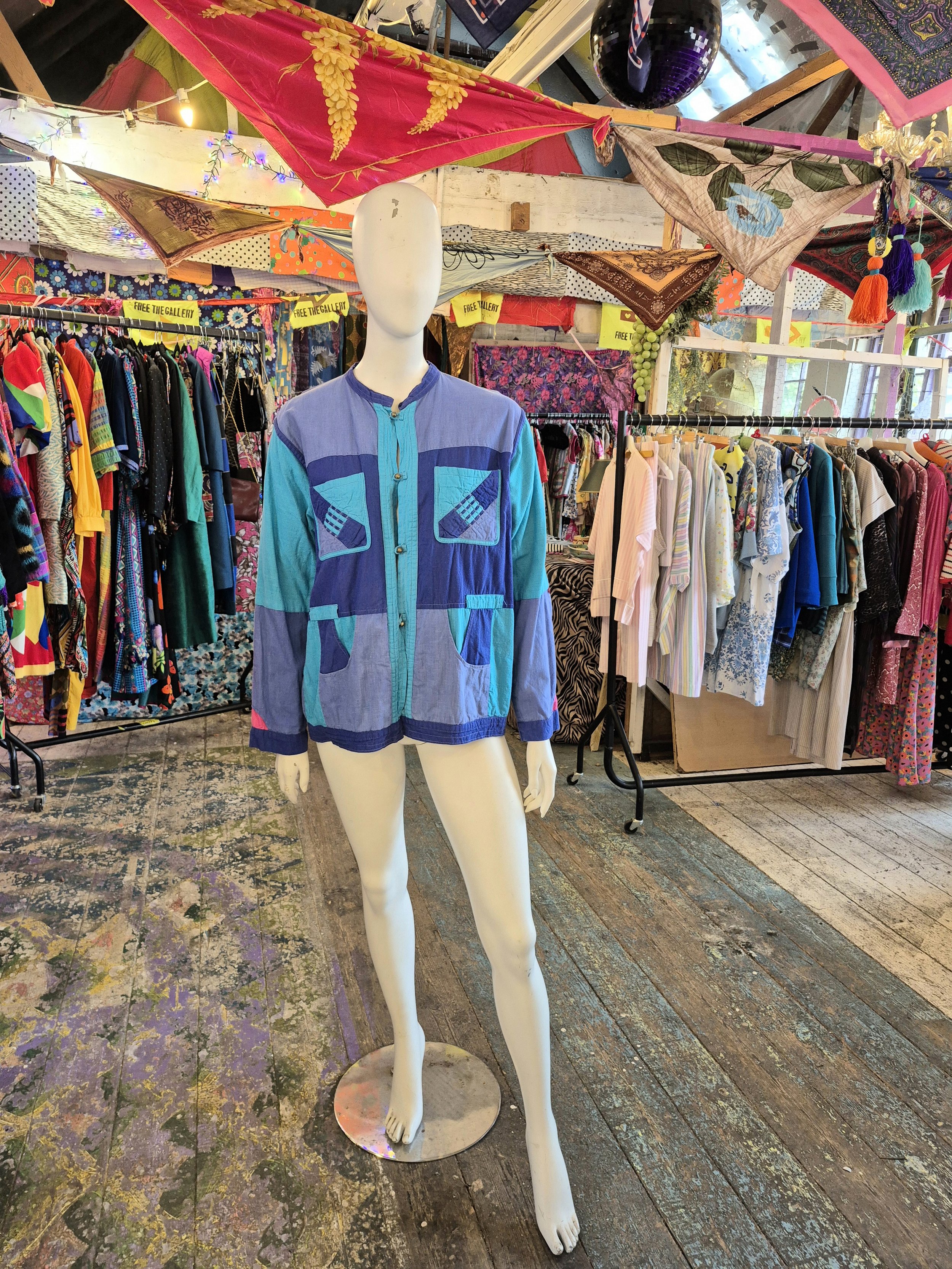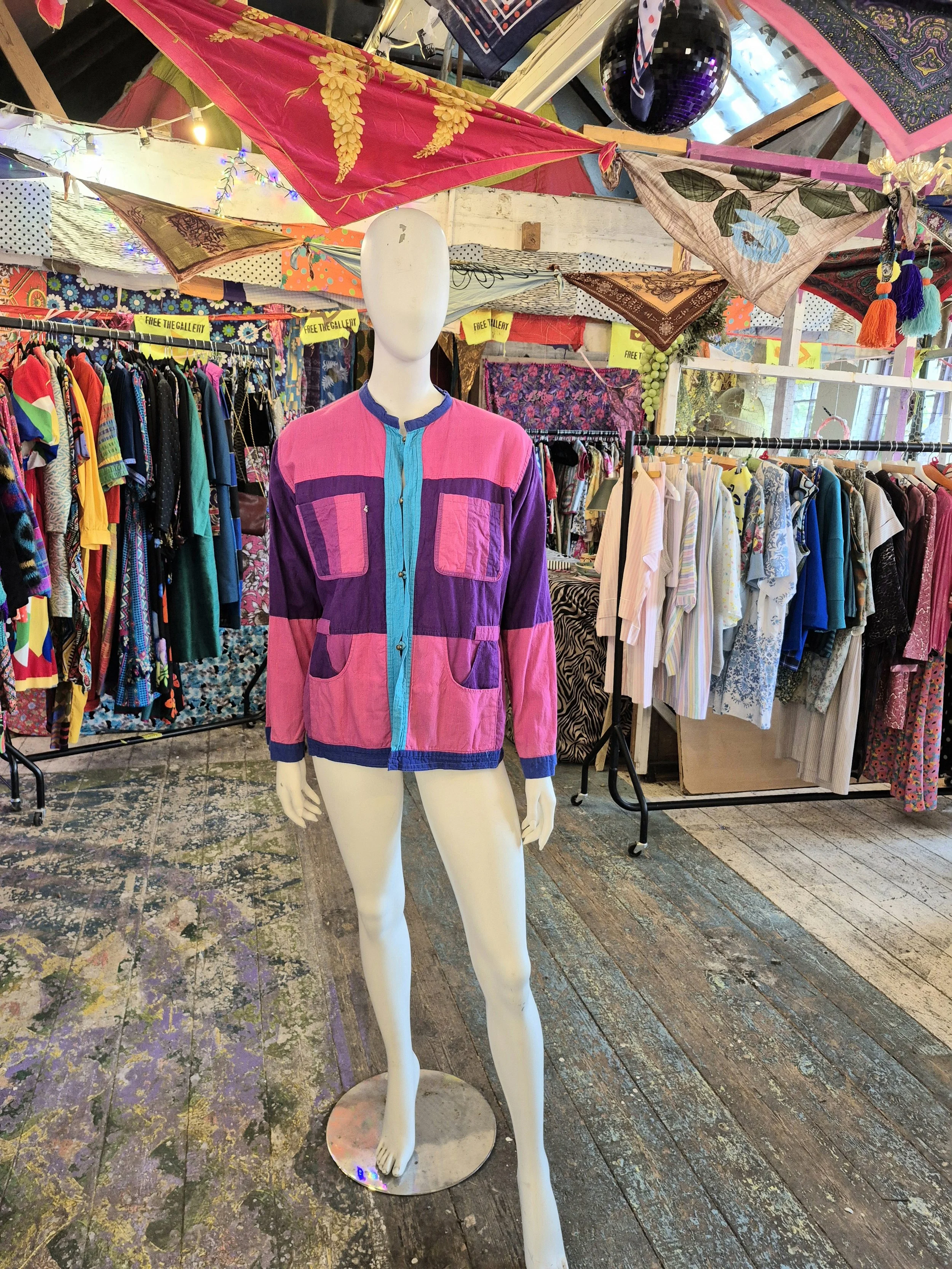 Thid is a lovely lightweight cotton jacket. One side is purple and blue patchwork and the other pink and purple.