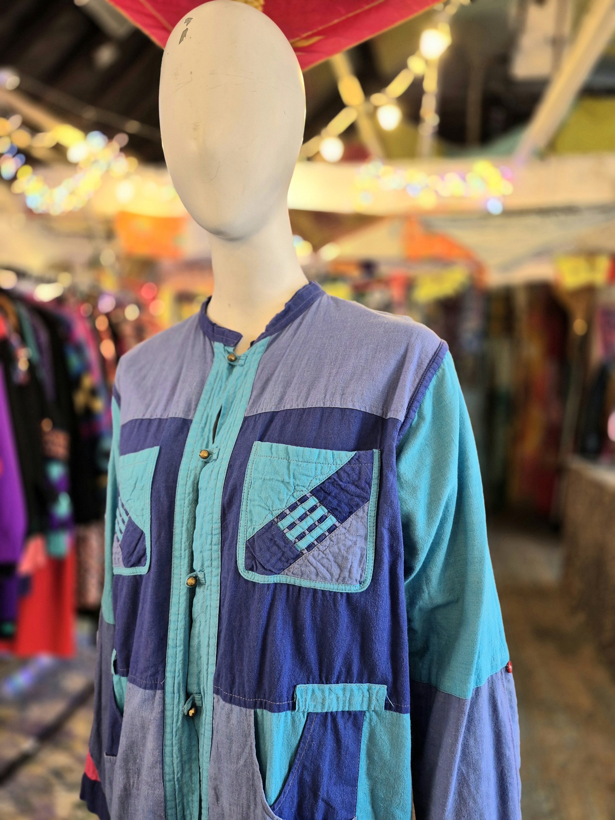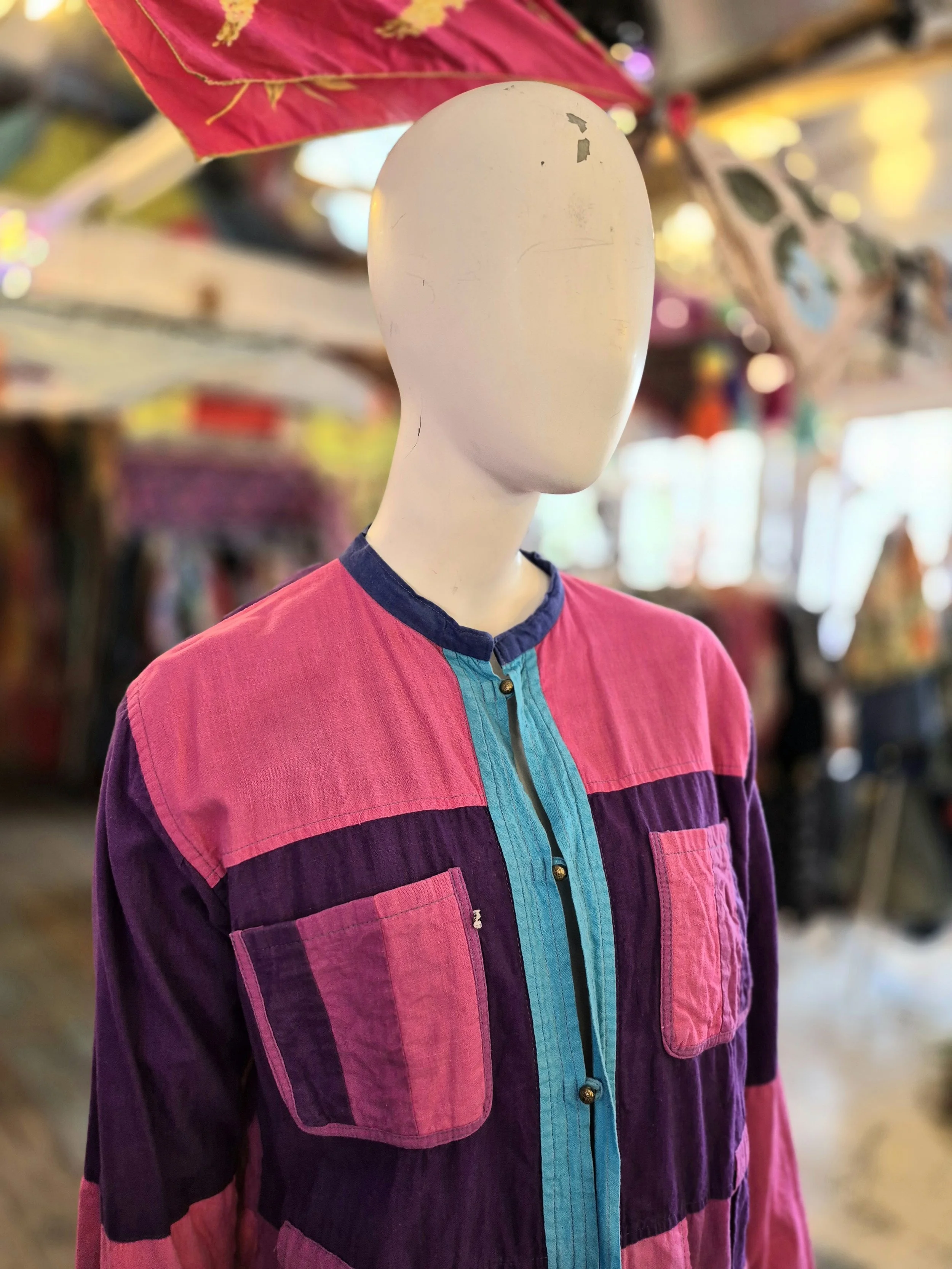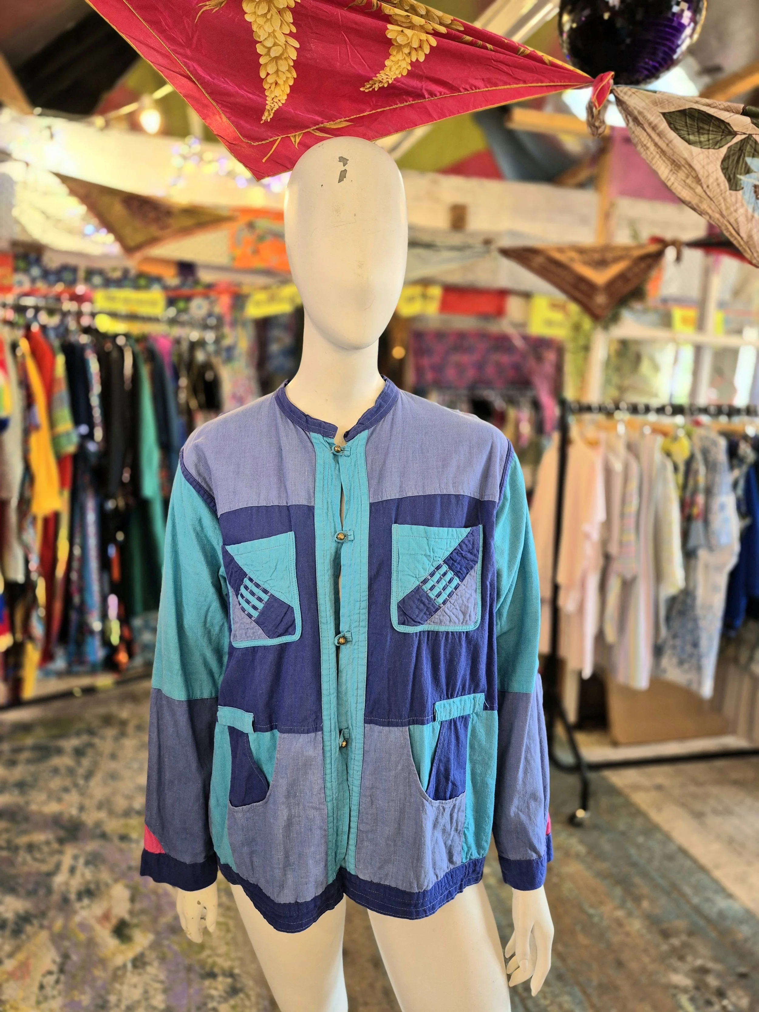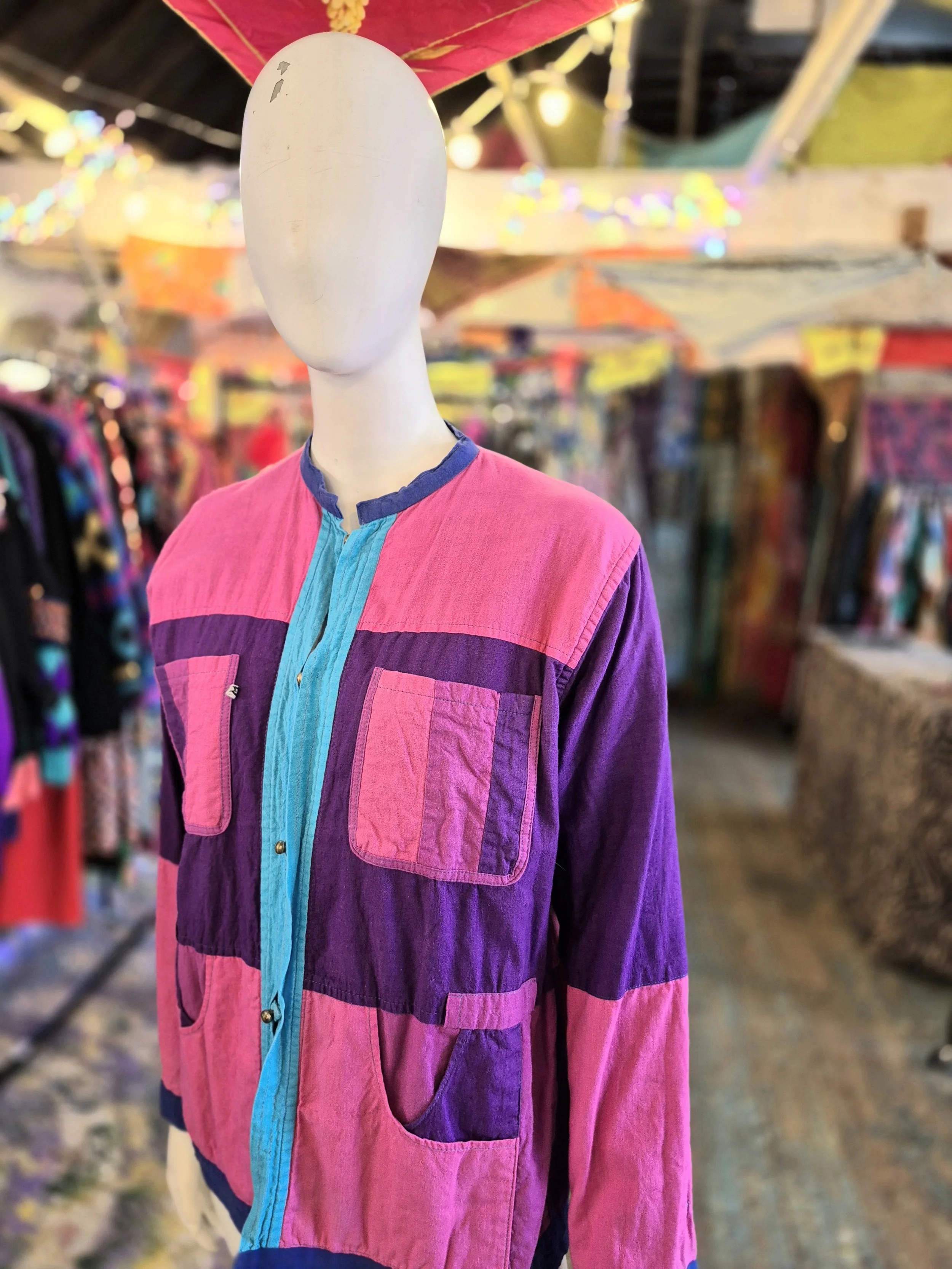 Thid is a lovely lightweight cotton jacket. One side is purple and blue patchwork and the other pink and purple.