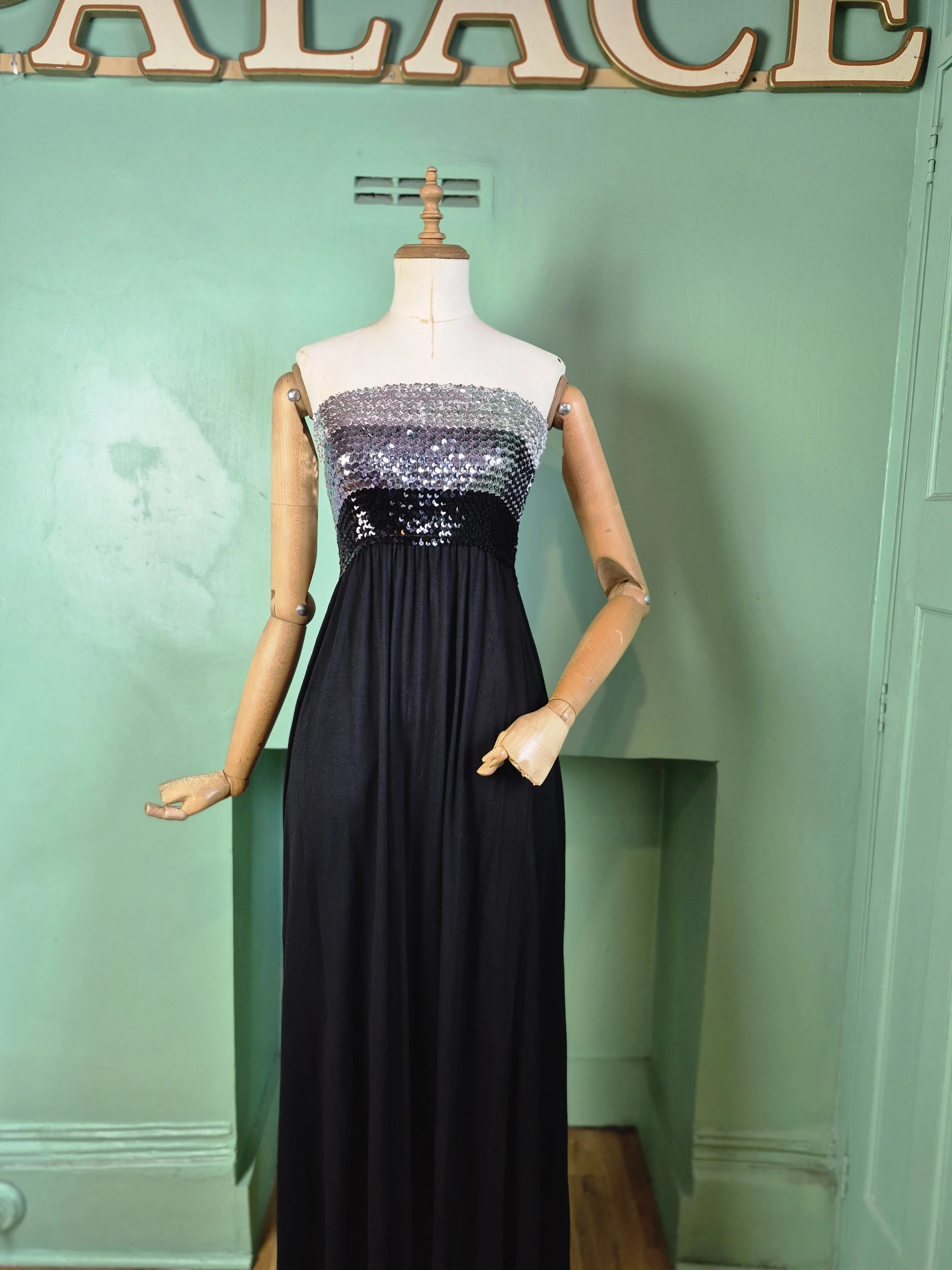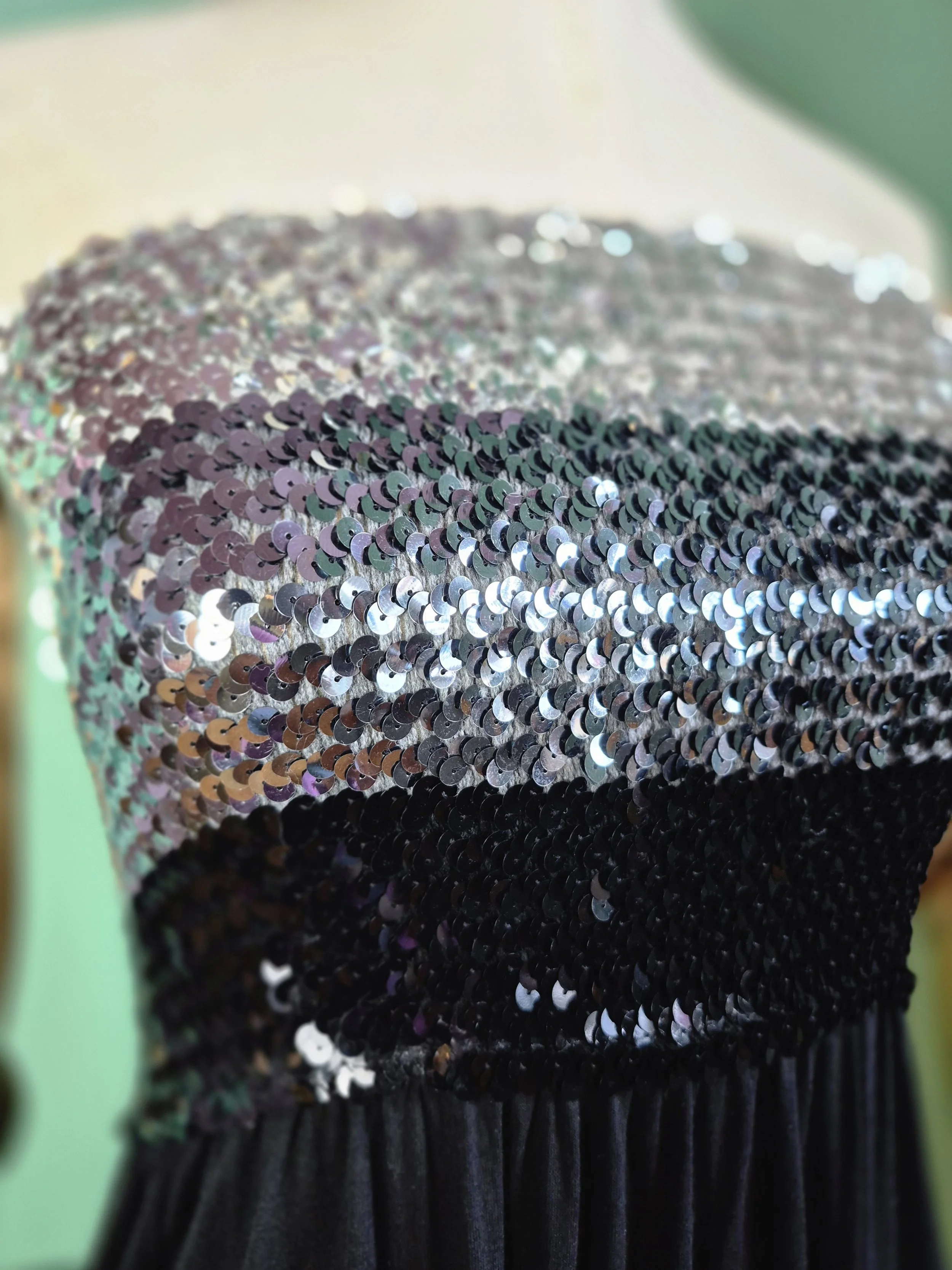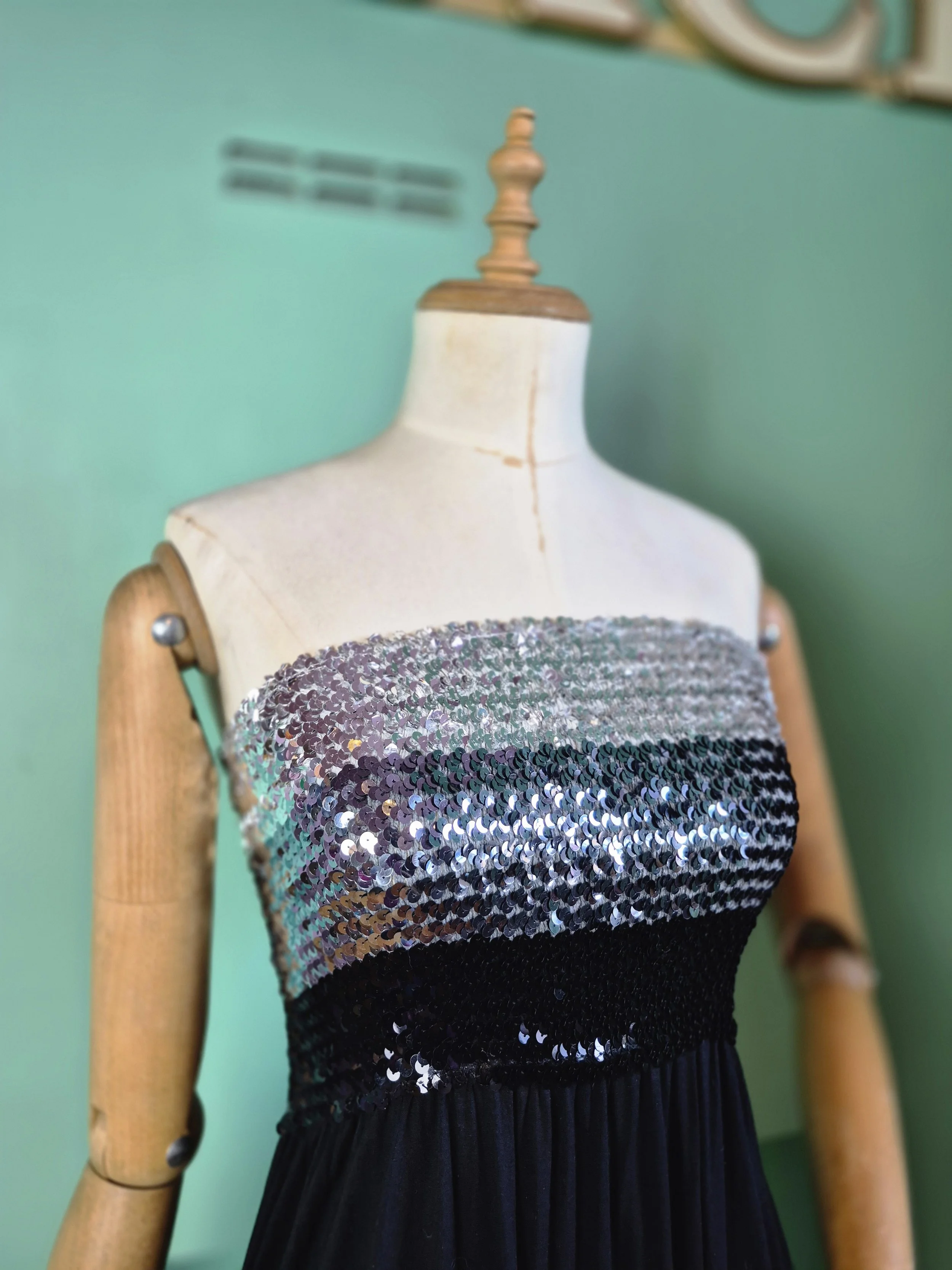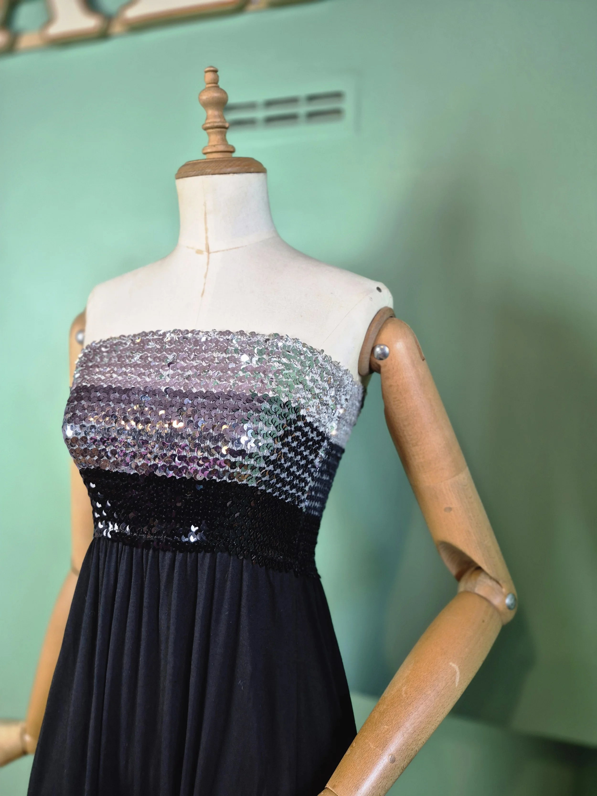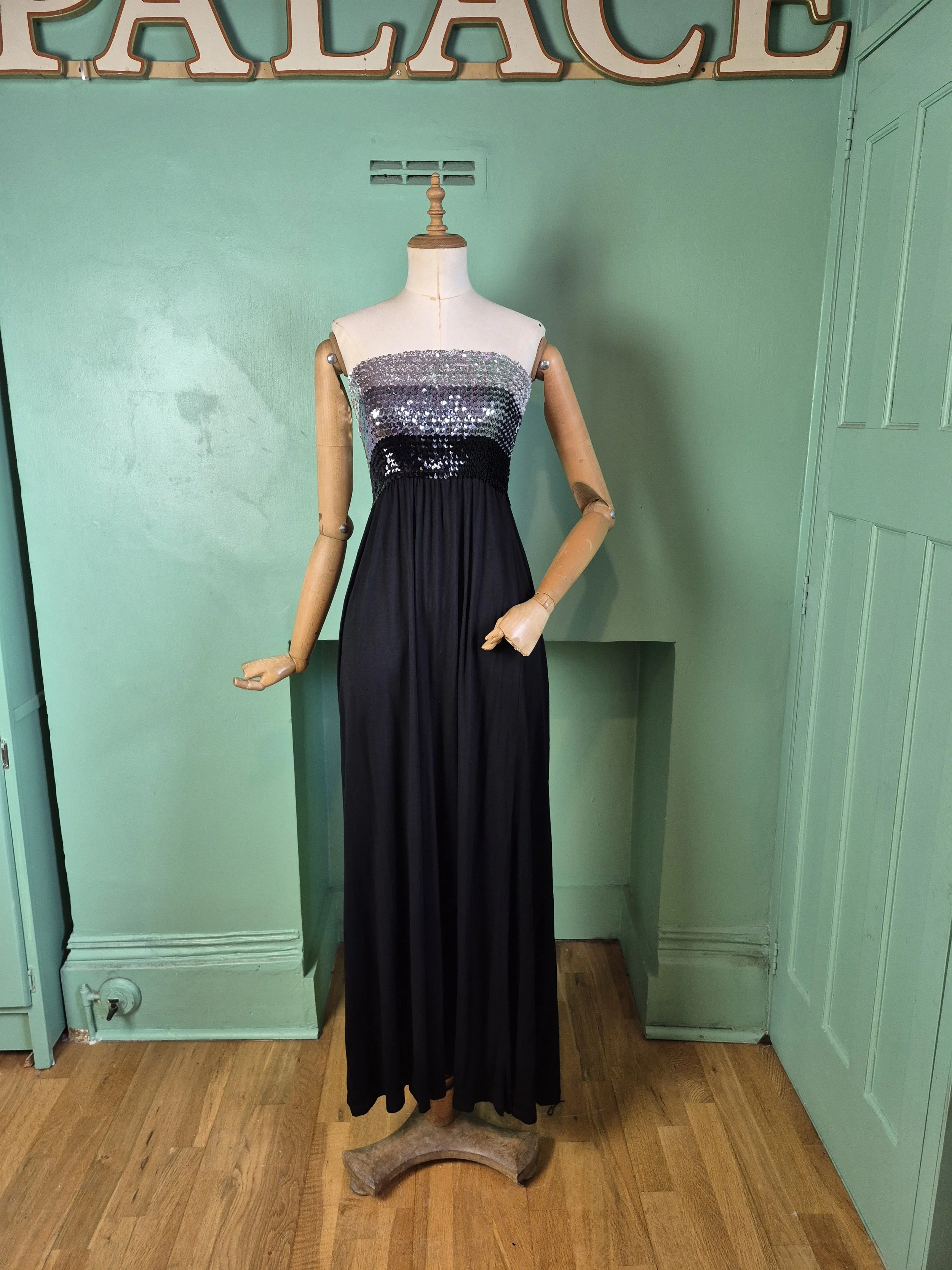 Super disco styling. Elasticated sequin boob tube top with black jersey skirt.