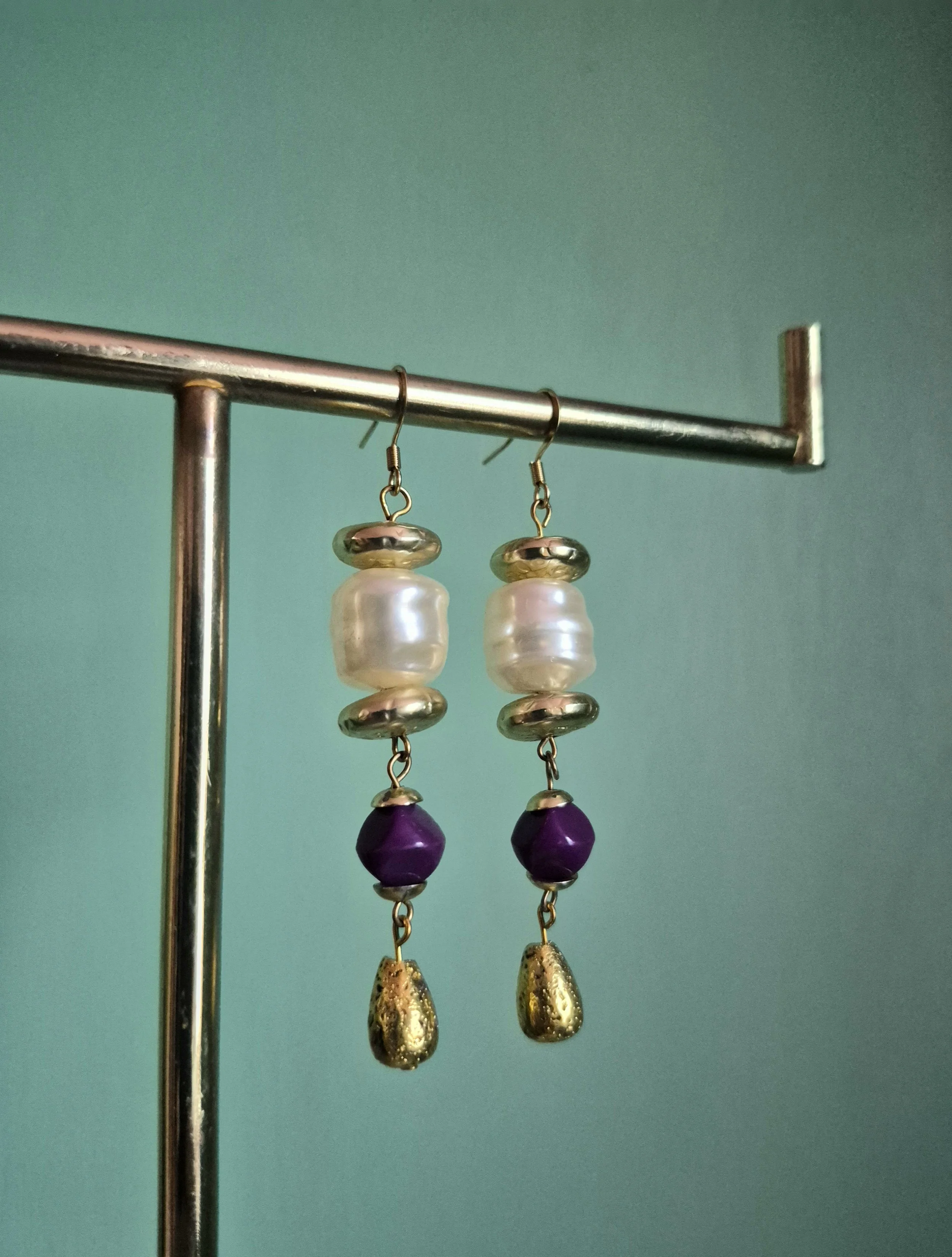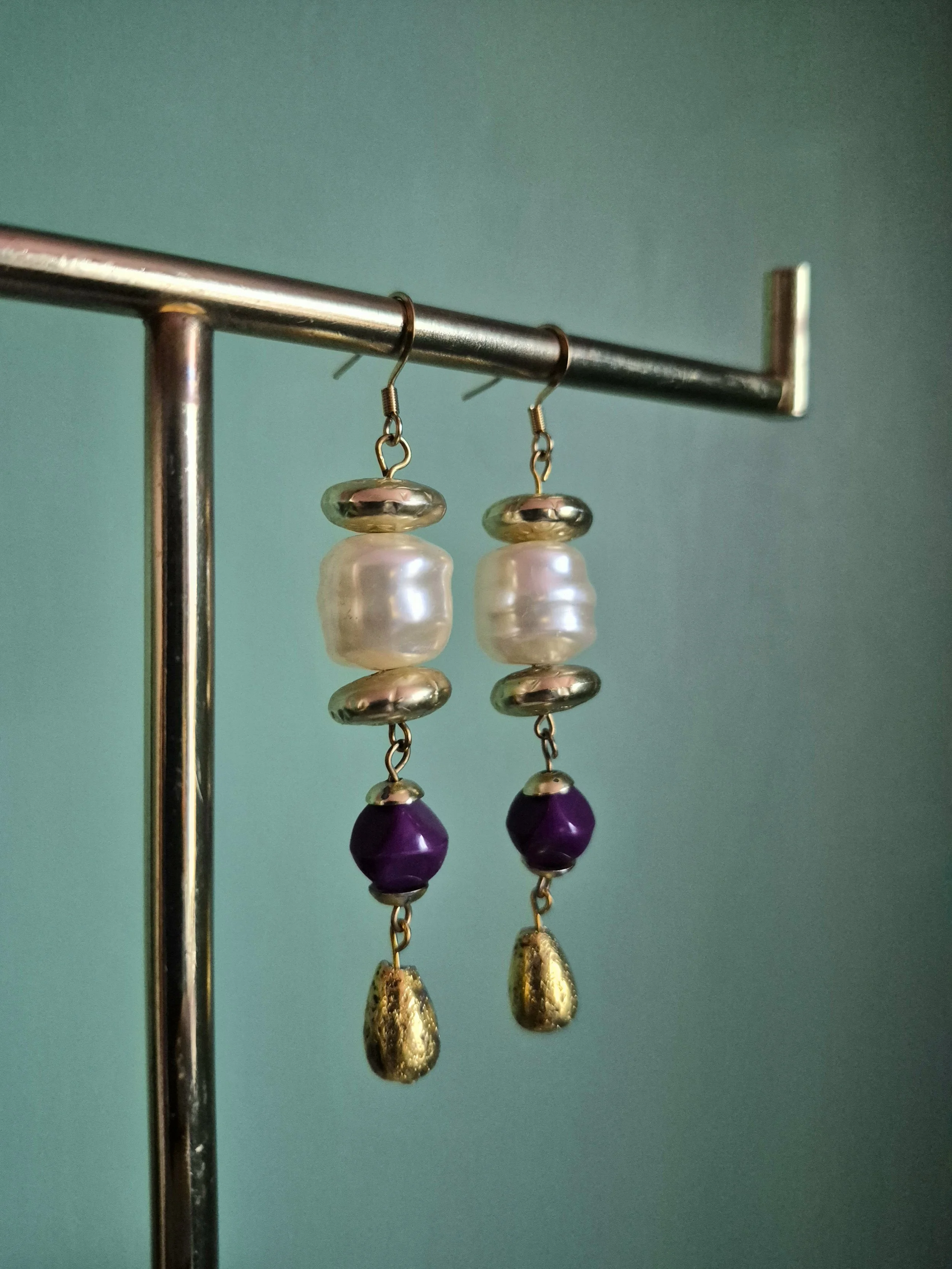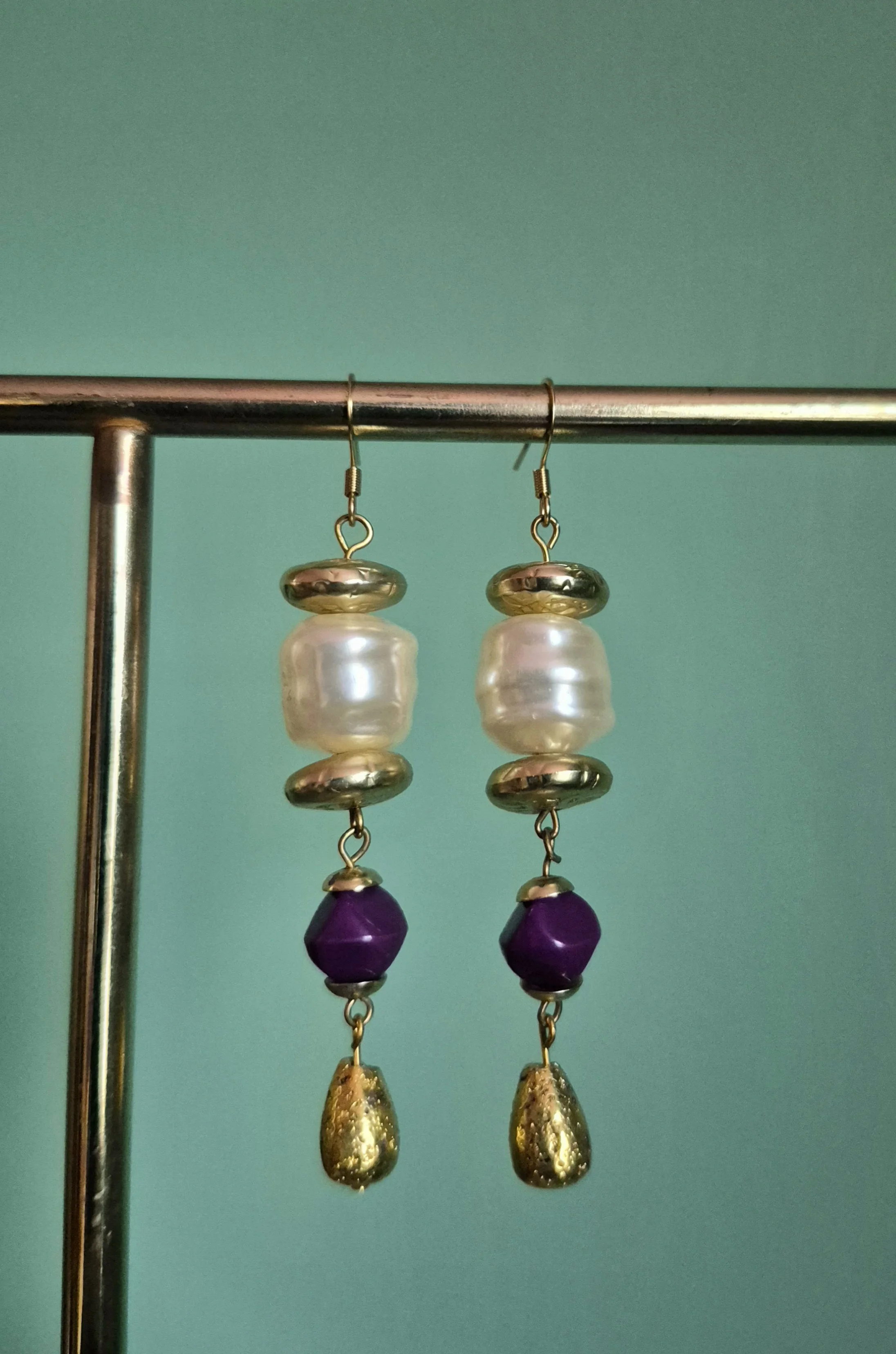 Lightweight earrings made from gold tone beads, purple beads and chunky faux pearl beads.