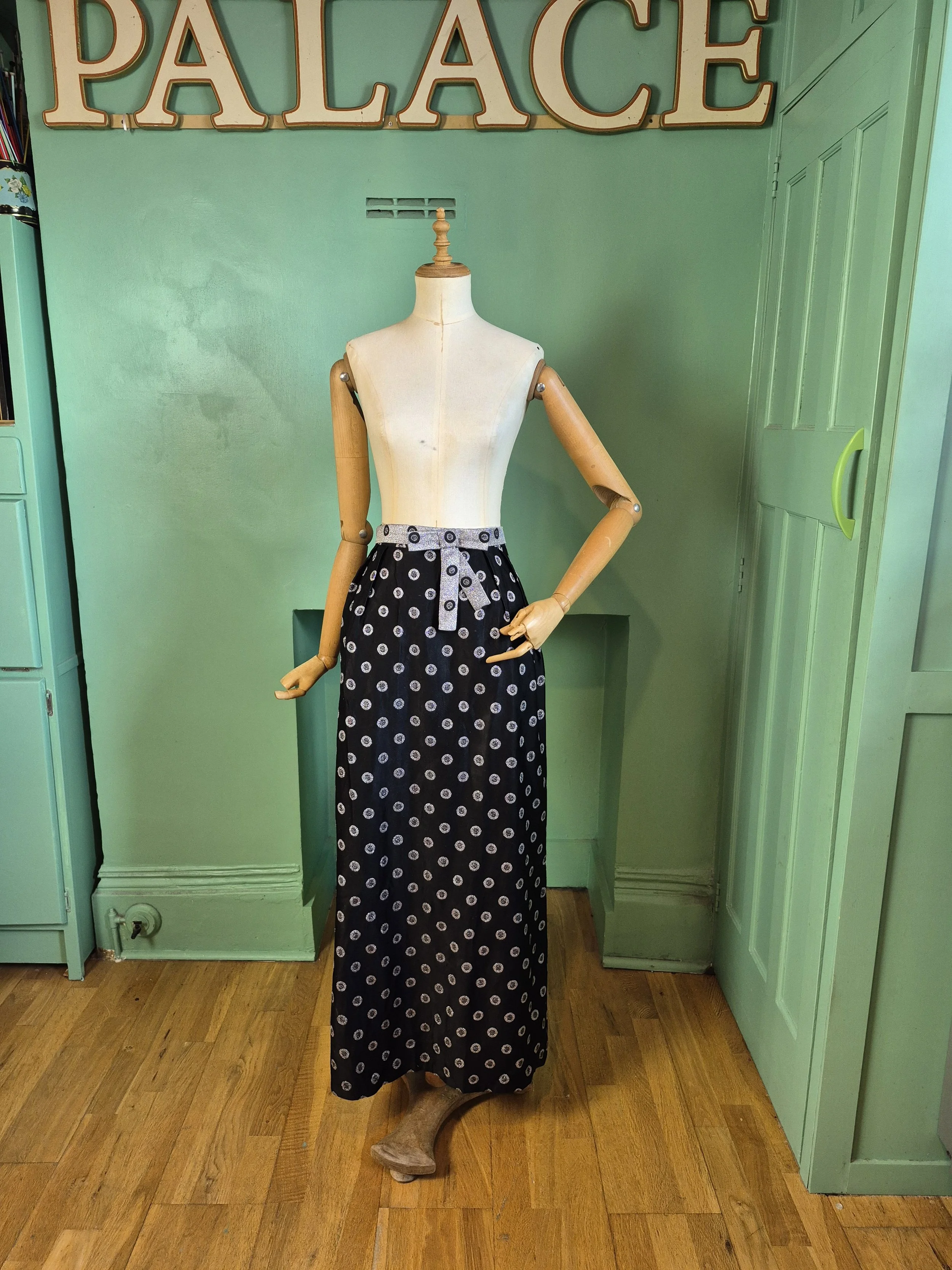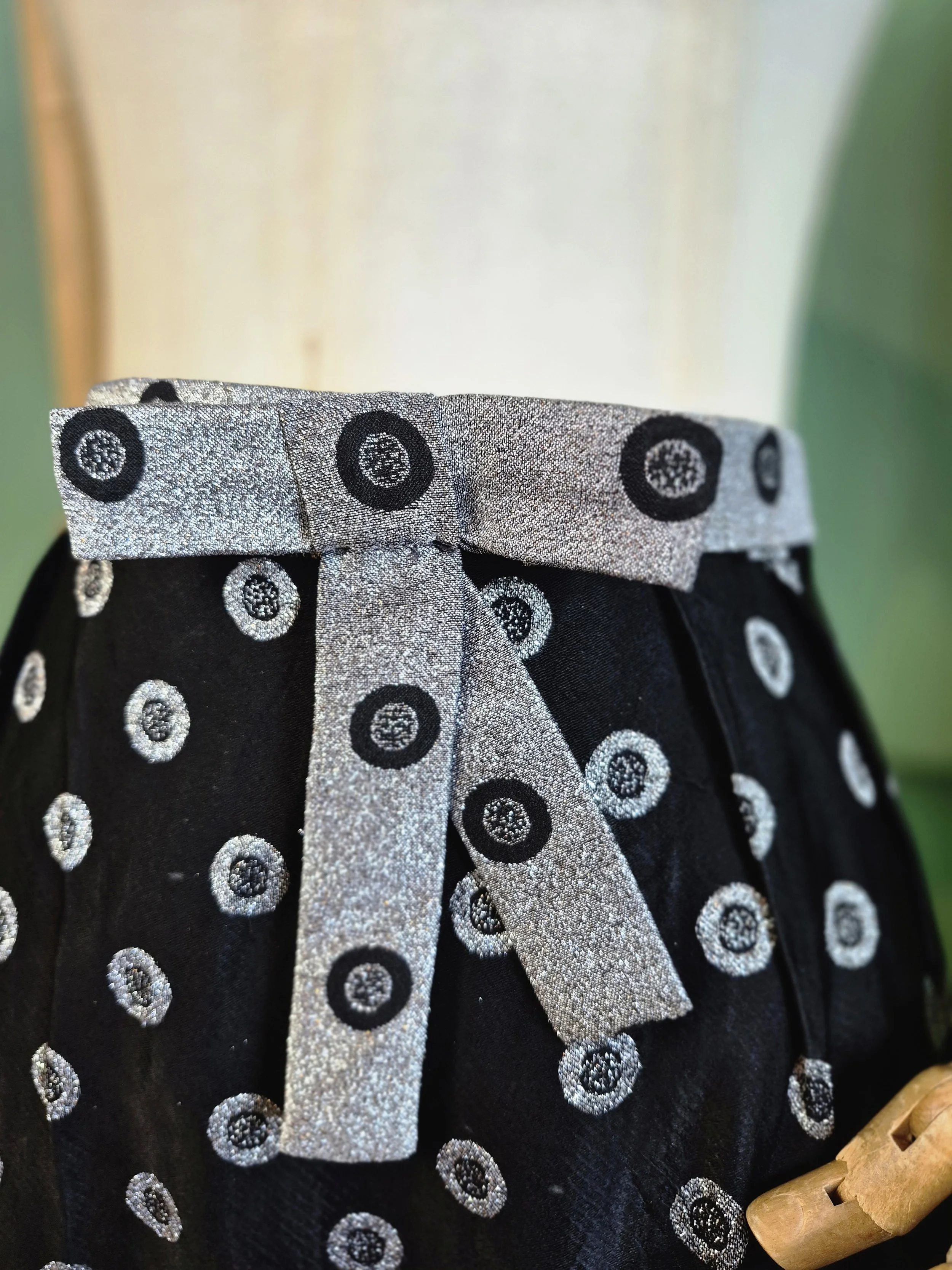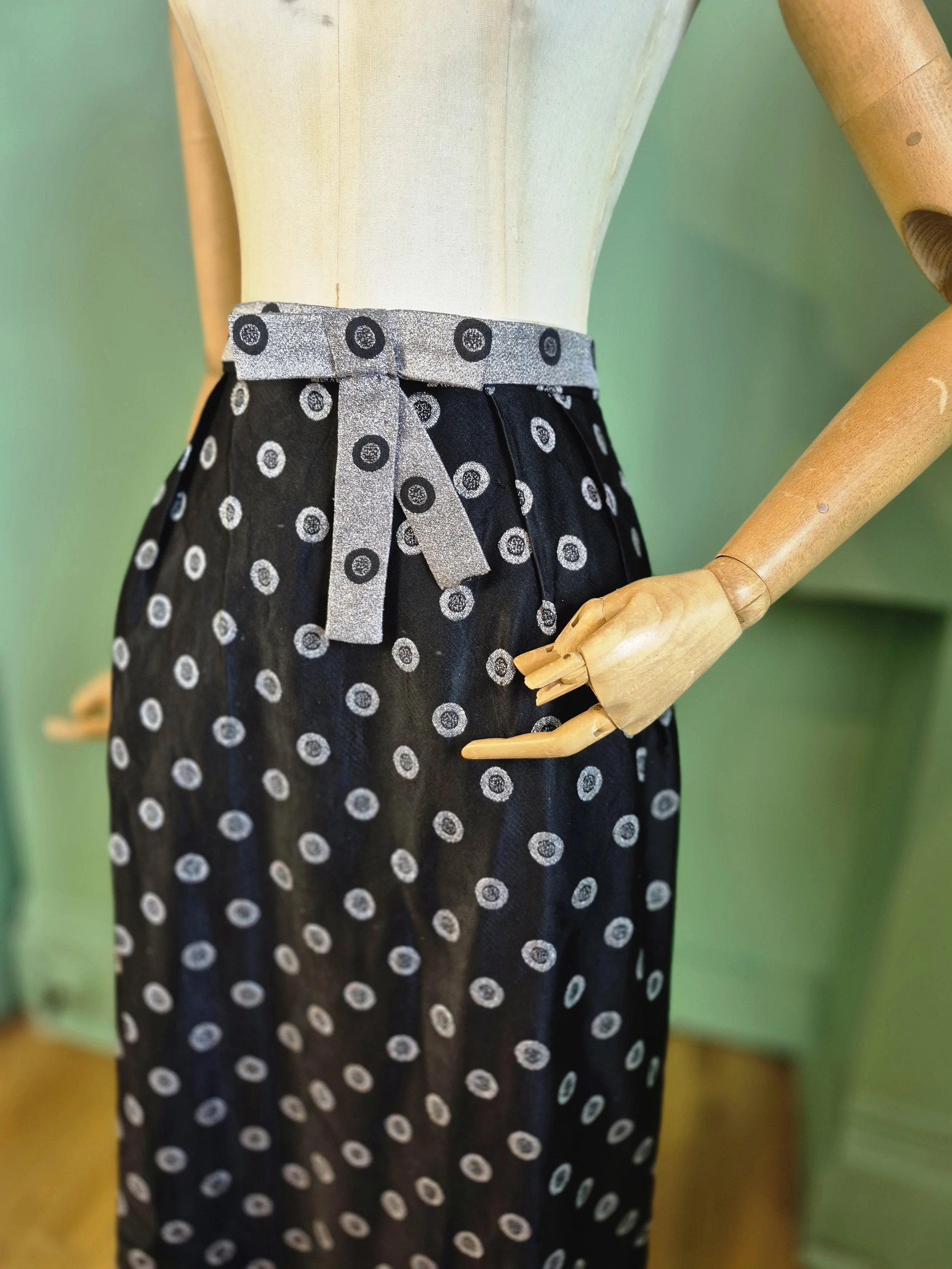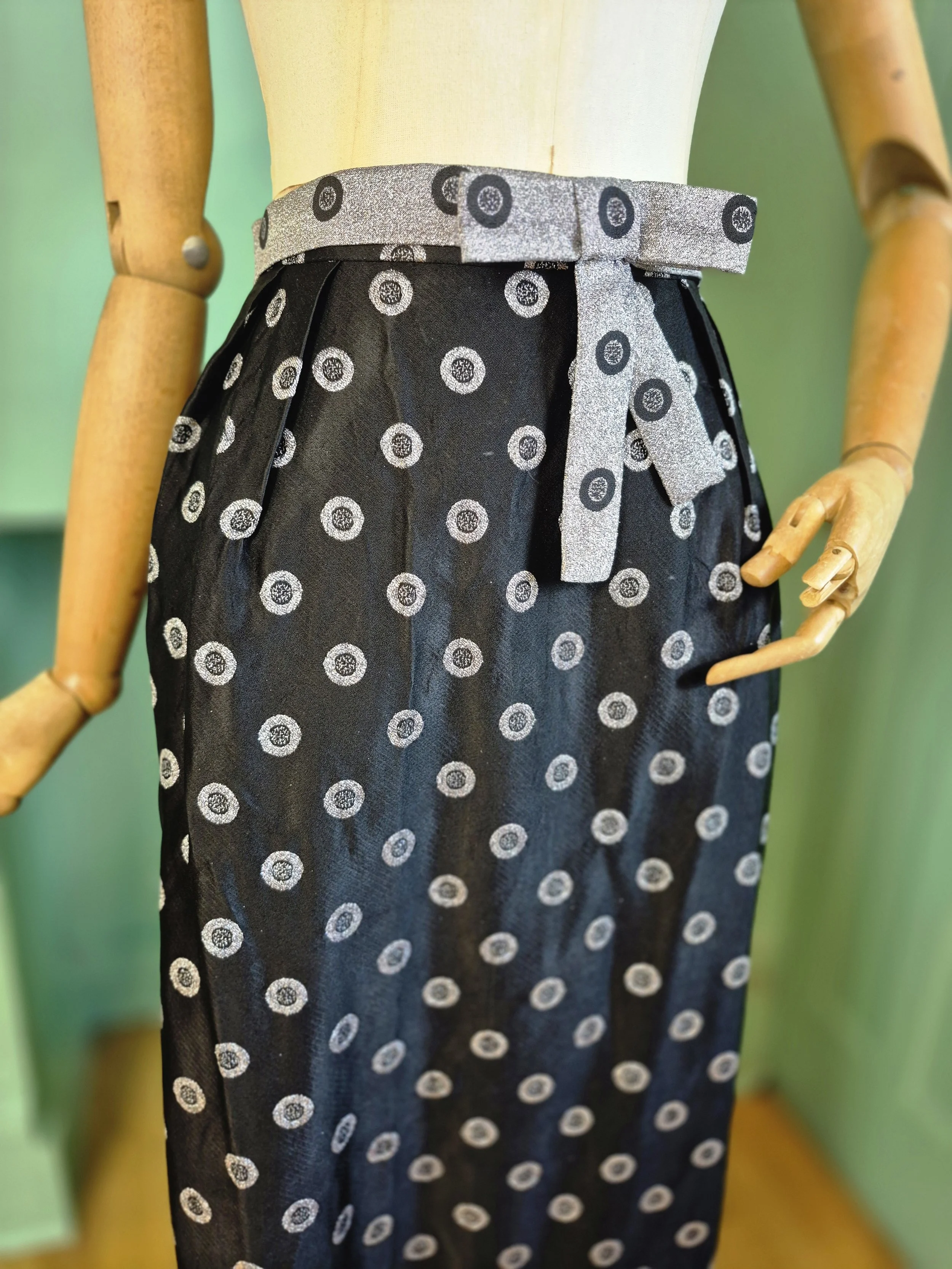Gorgeous handmade lurex maxi skirt in black and silver. Has a matching belt in the reverse fabric for extra impact. Has a back slit.