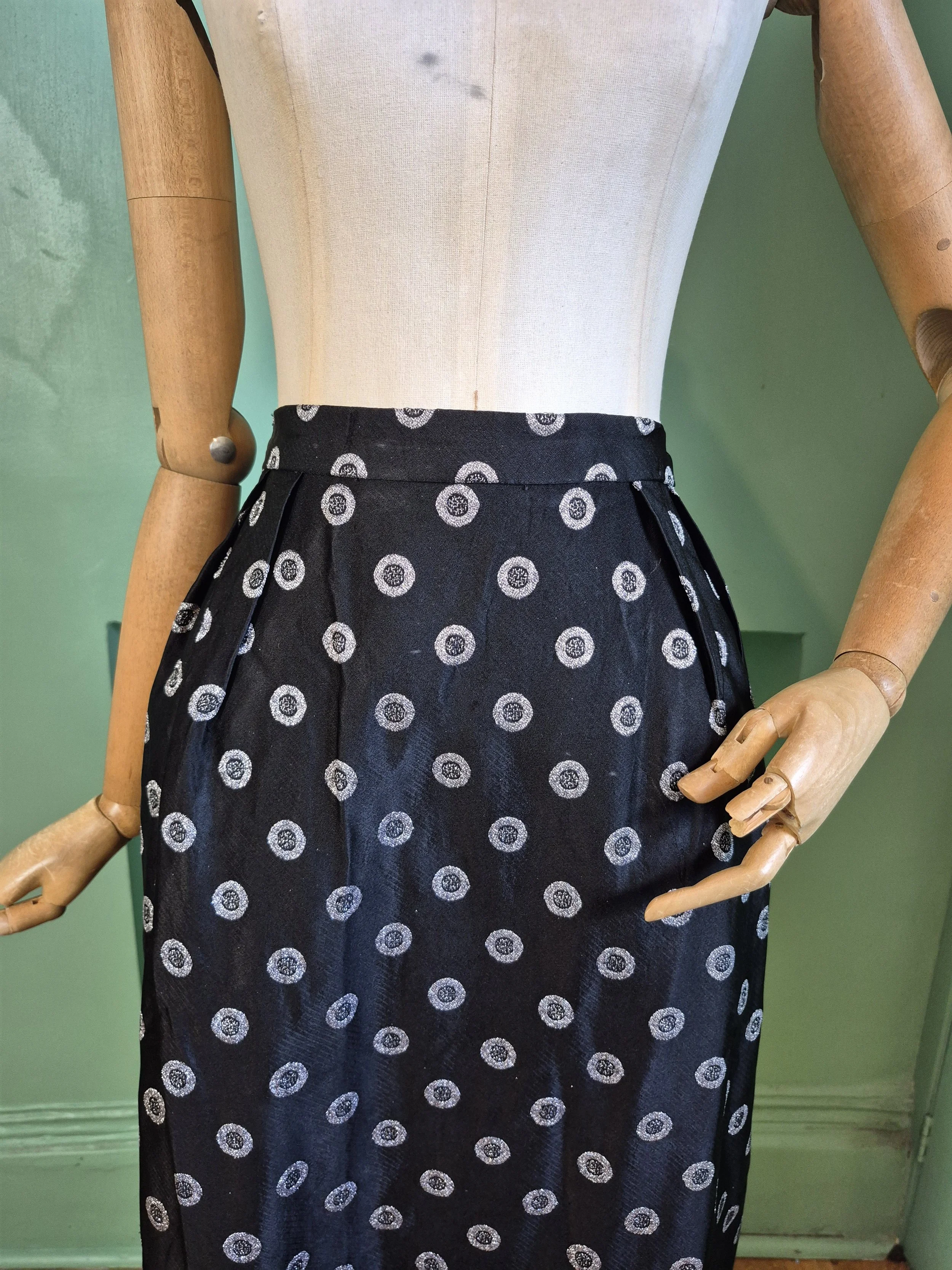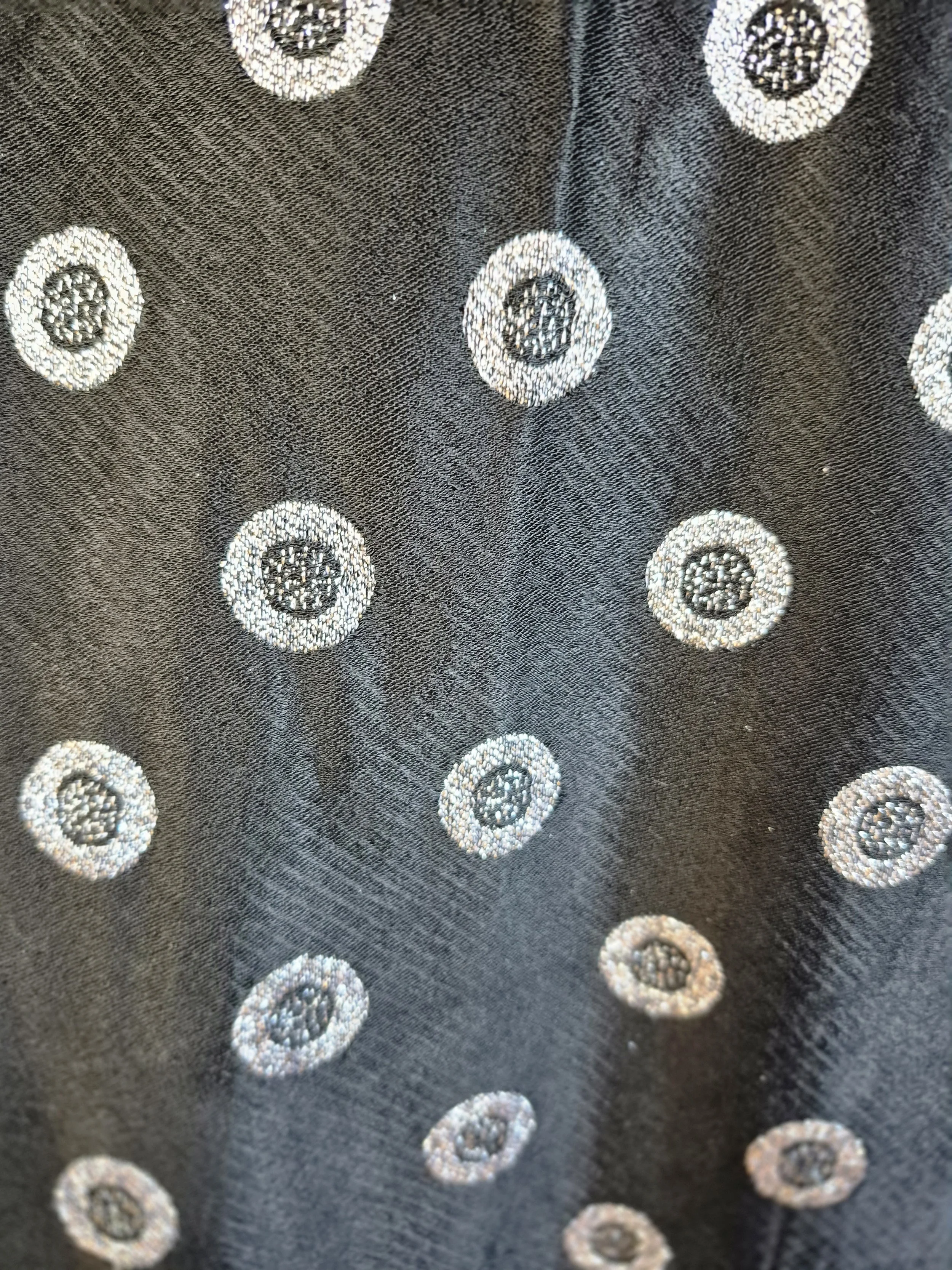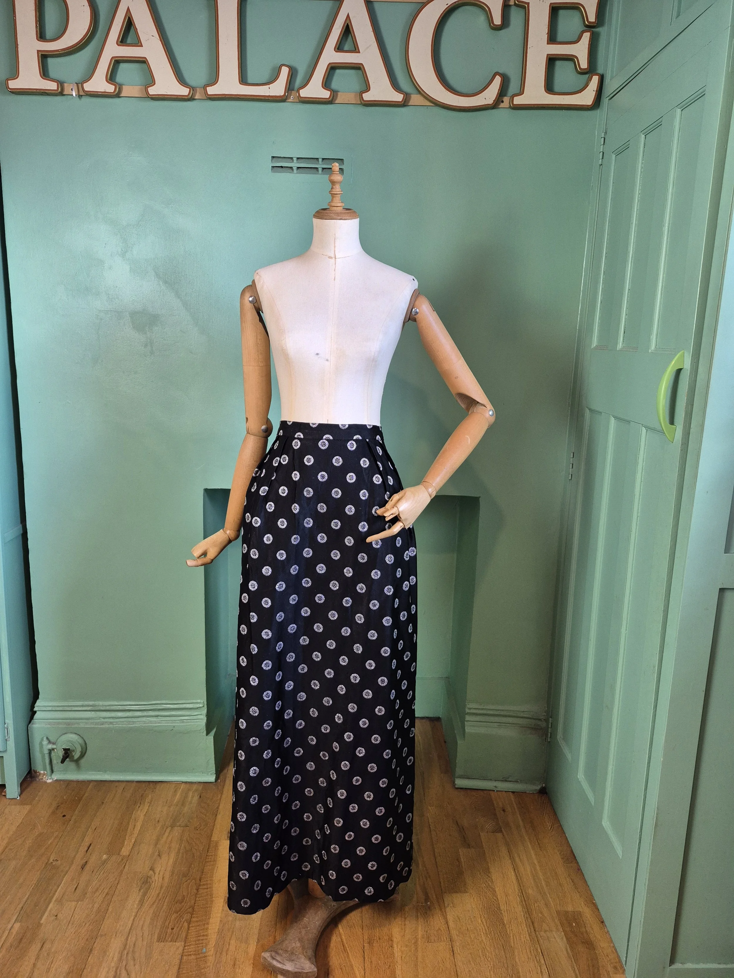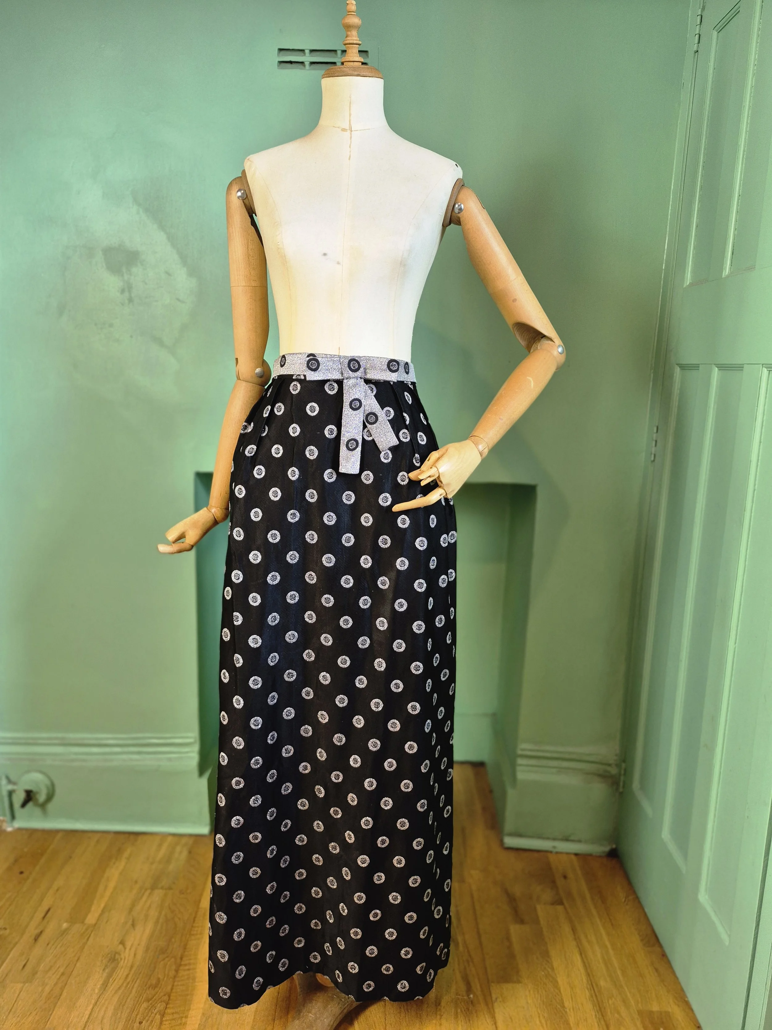 Gorgeous handmade lurex maxi skirt in black and silver. Has a matching belt in the reverse fabric for extra impact. Has a back slit.