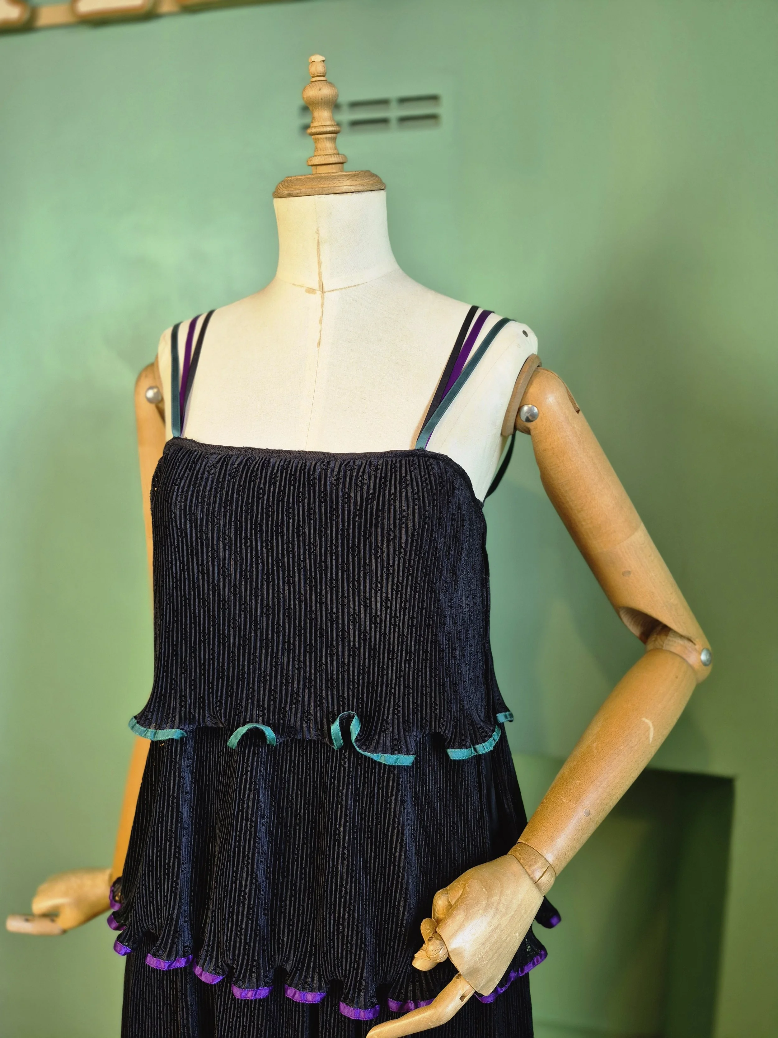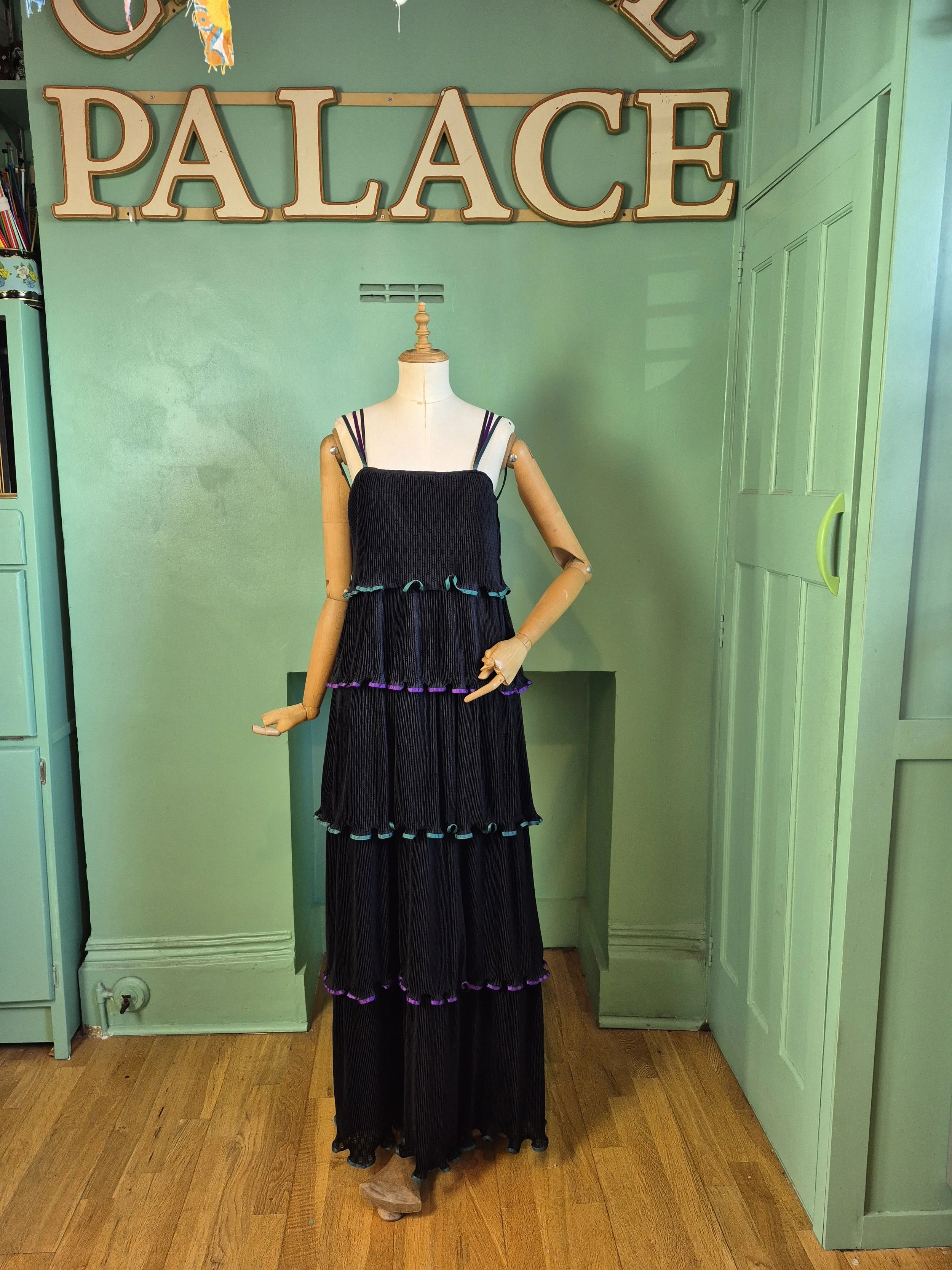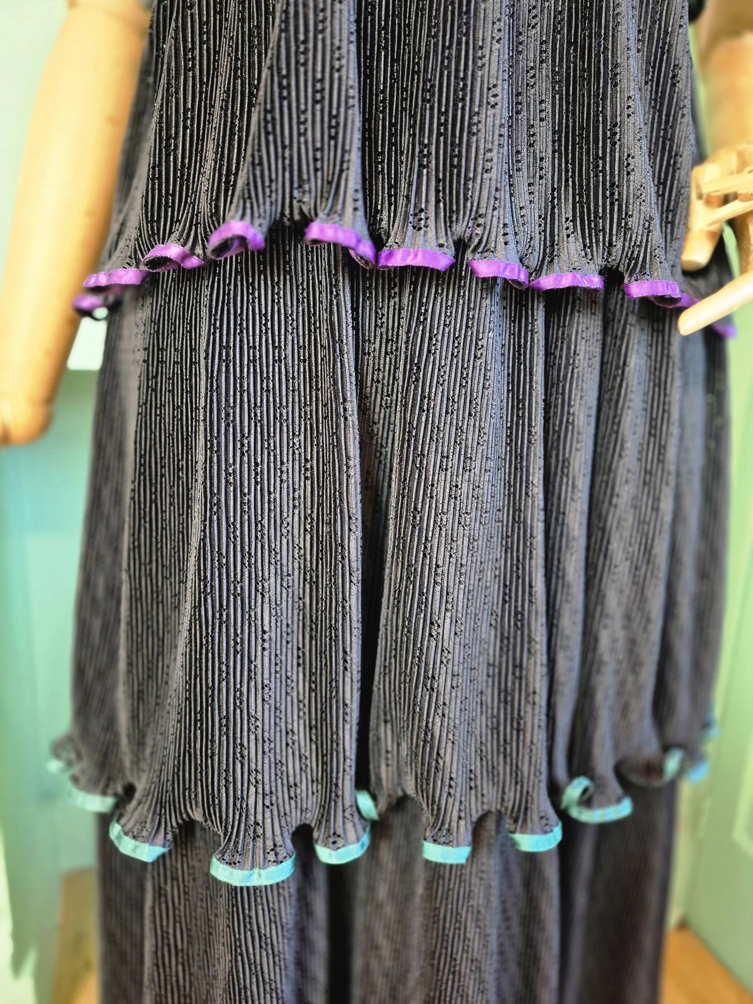 Be the belle of studio 54 in this incredible gown. Tiered design with coloured edging and ribbon straps. Fastens with a side zip and poppers.