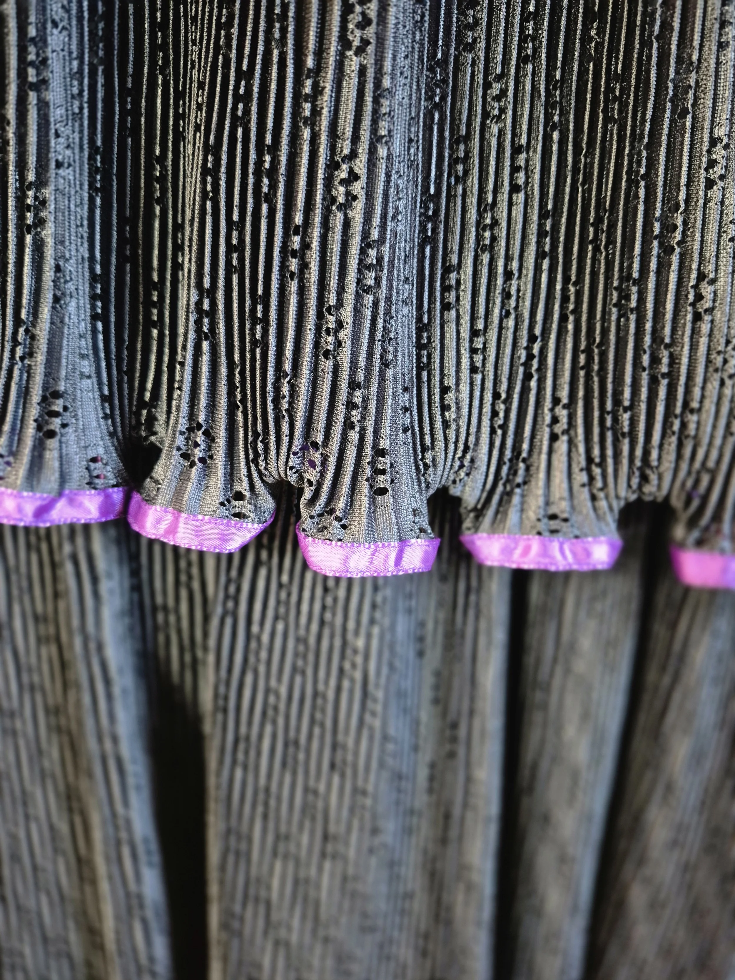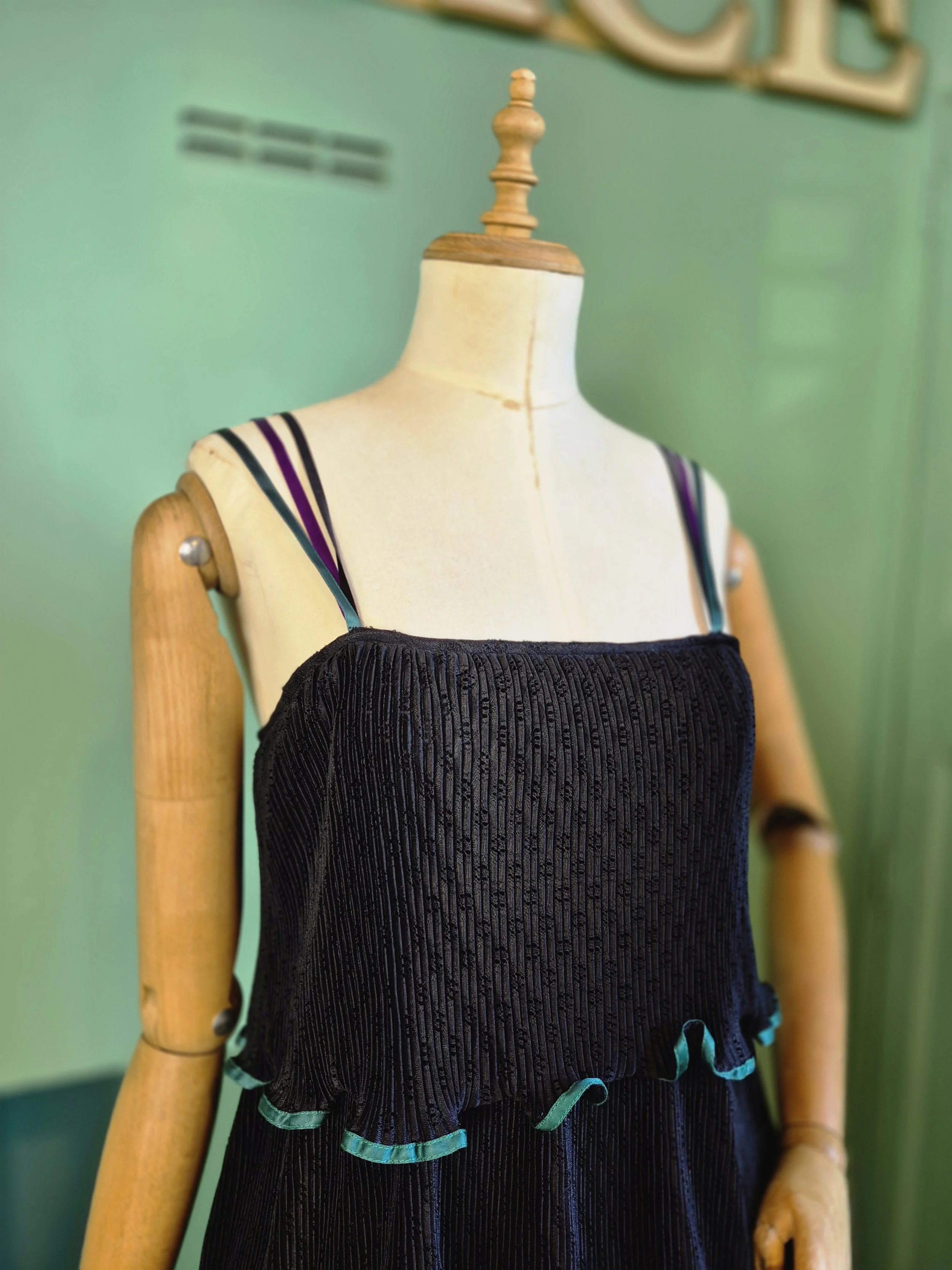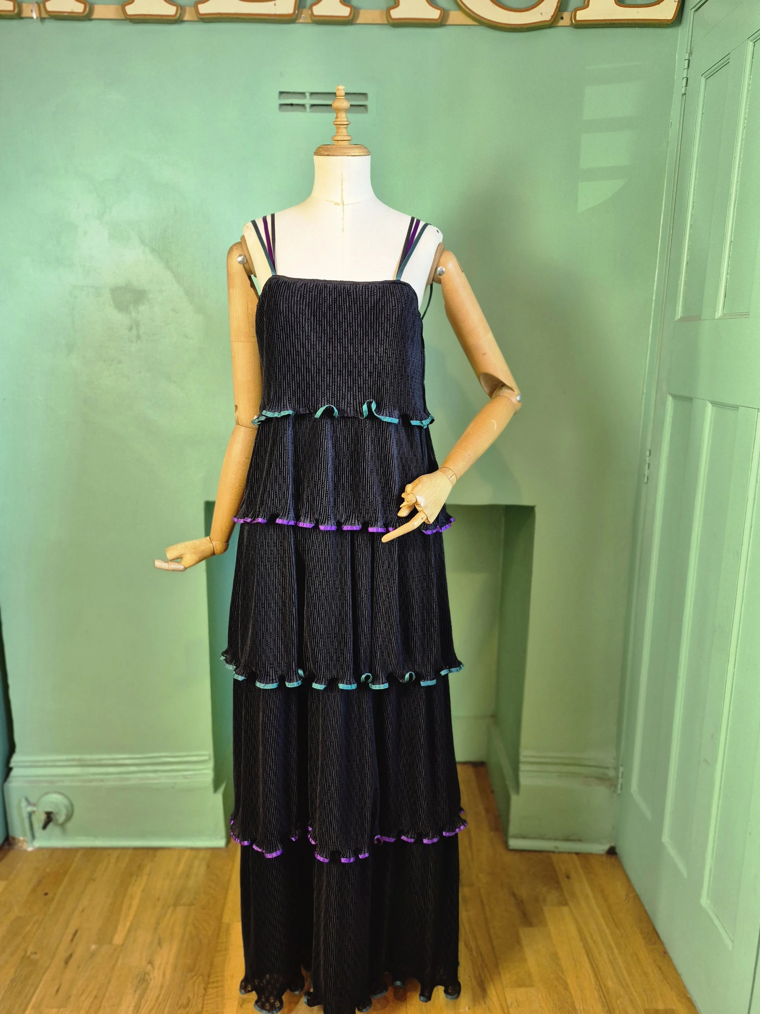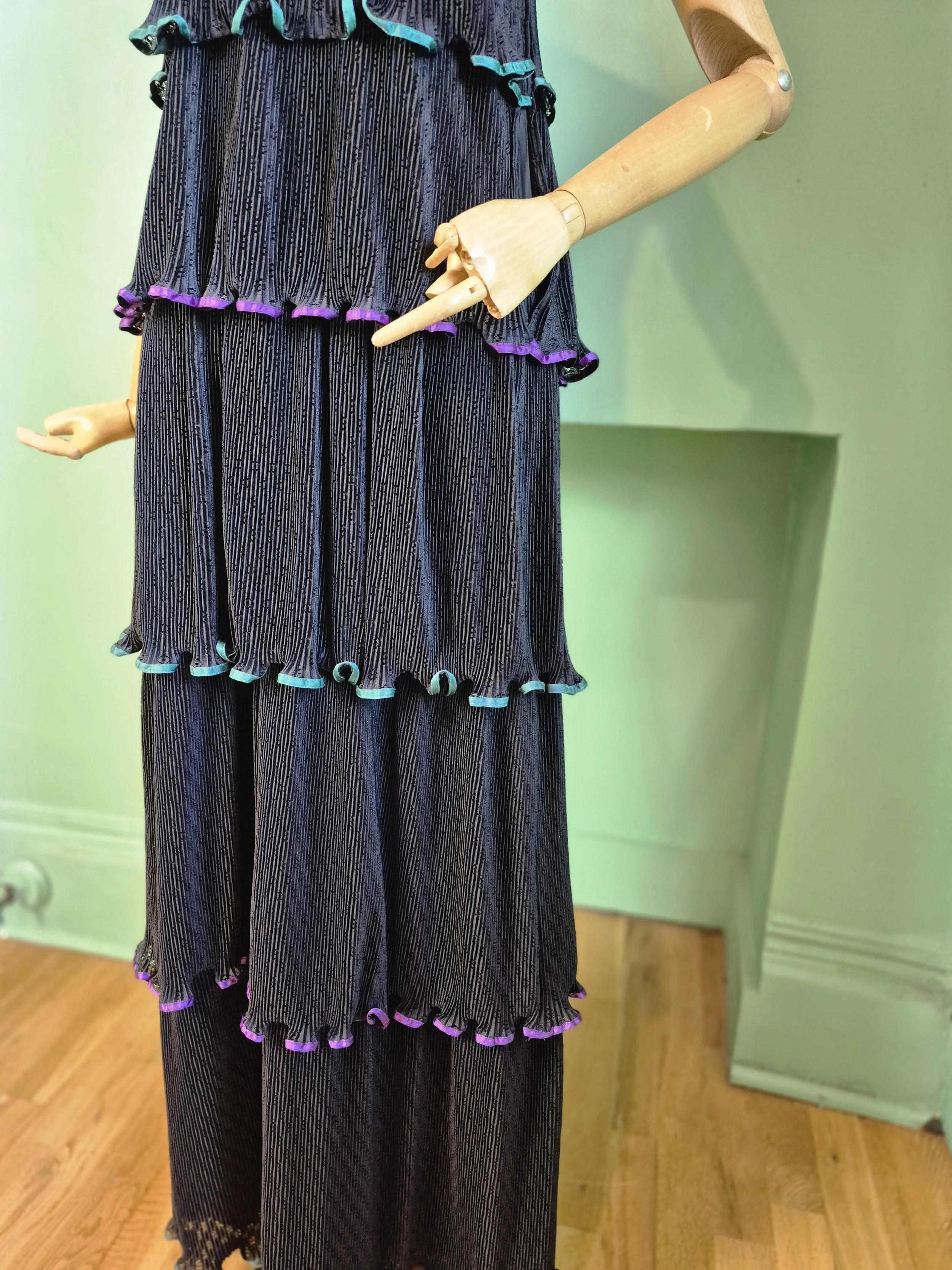 Be the belle of studio 54 in this incredible gown. Tiered design with coloured edging and ribbon straps. Fastens with a side zip and poppers.