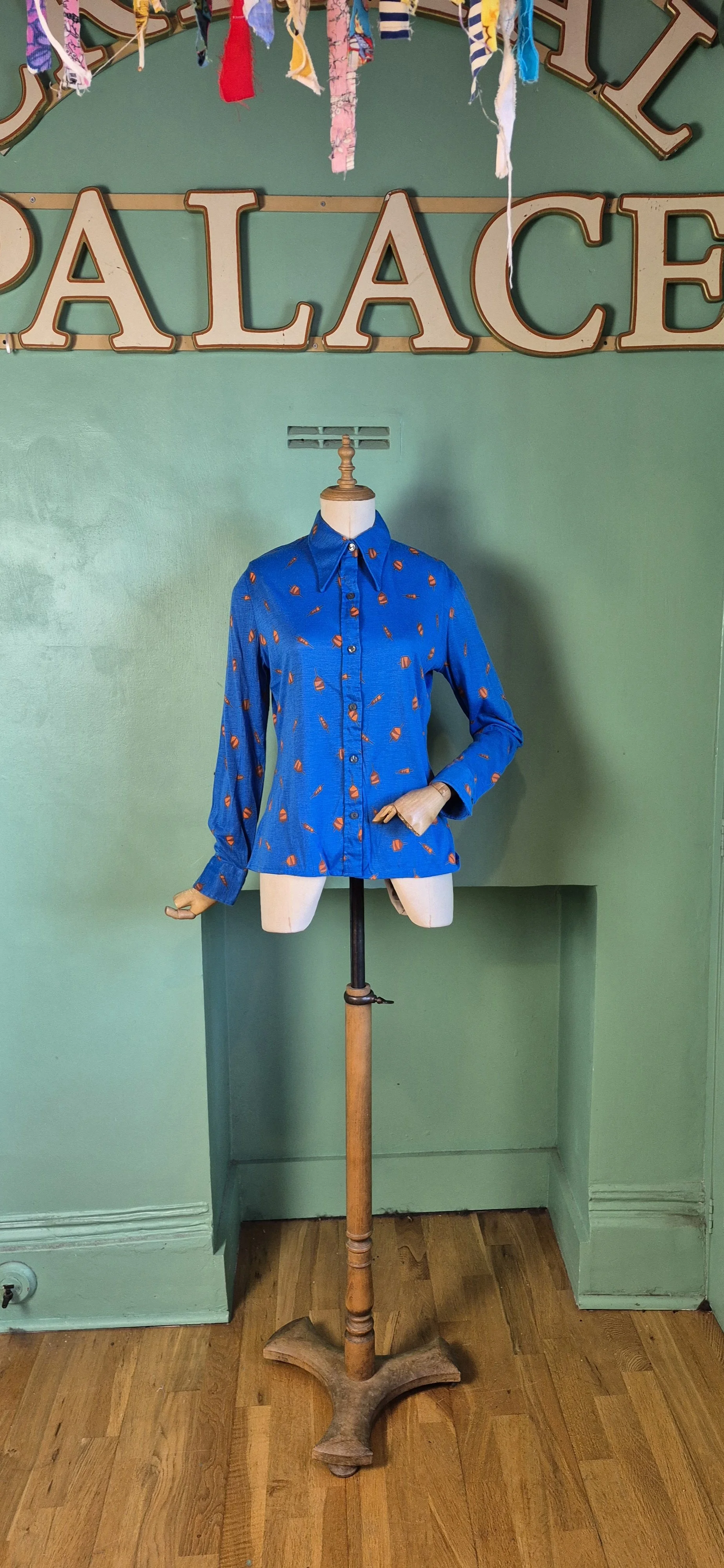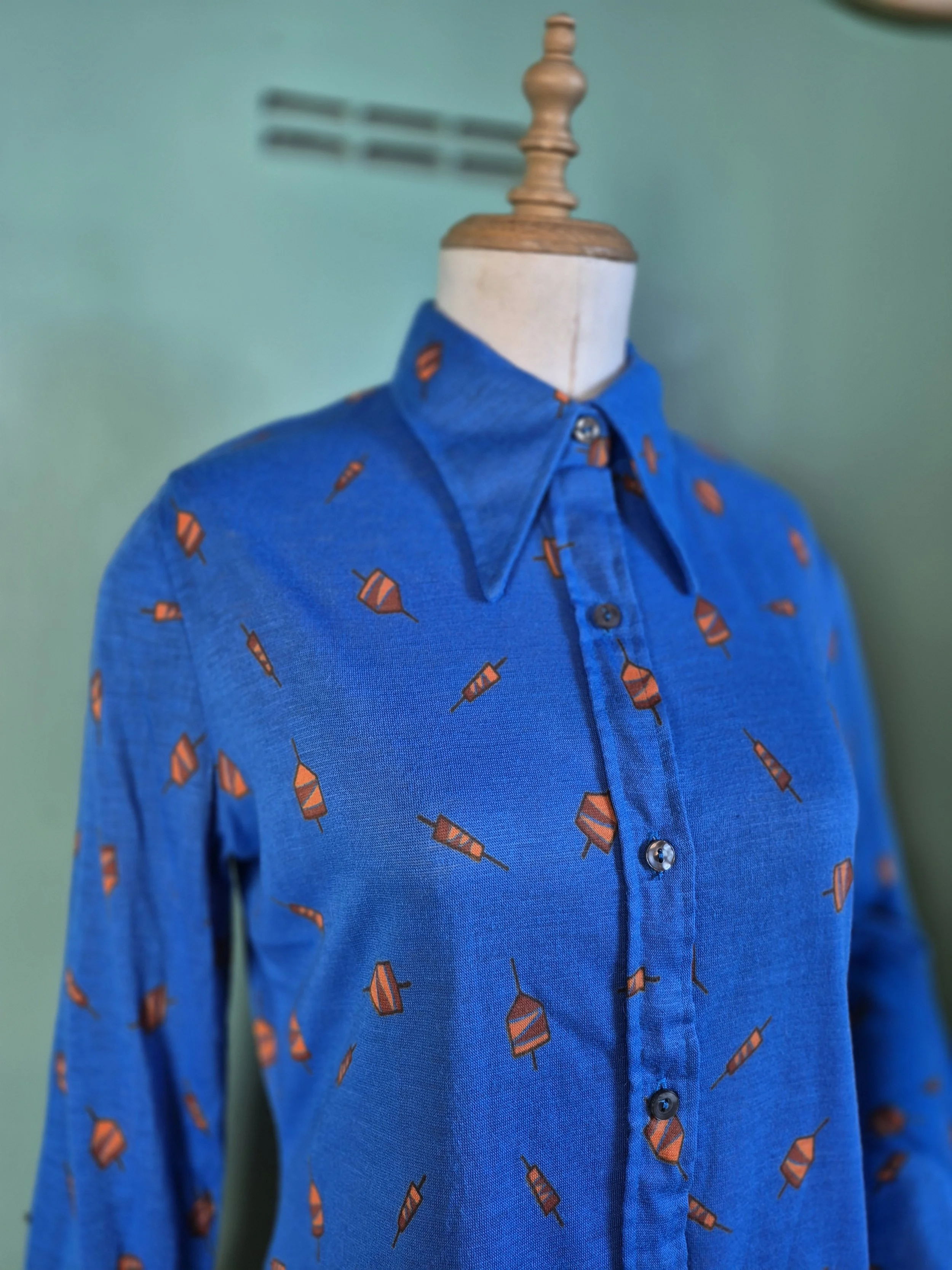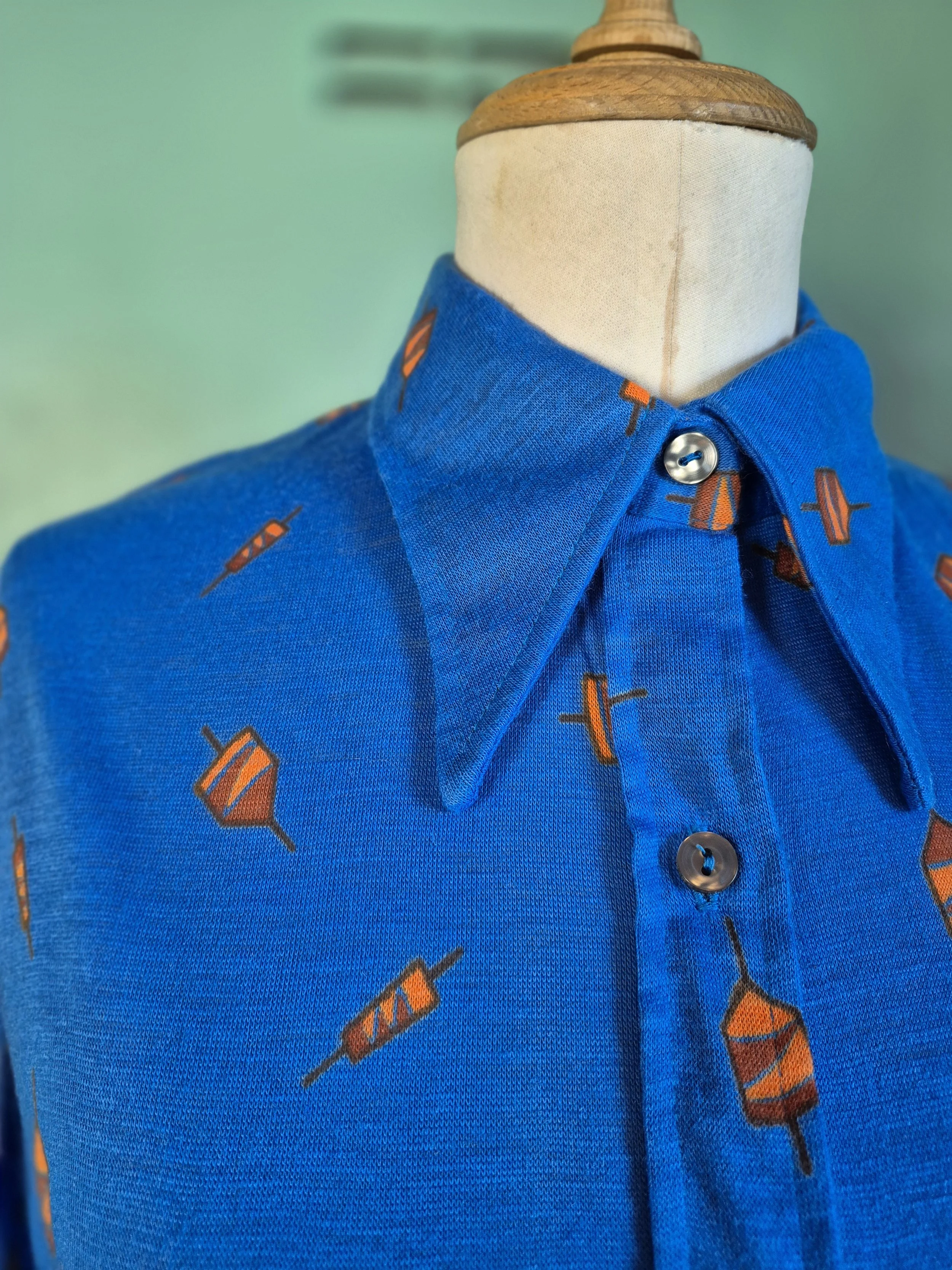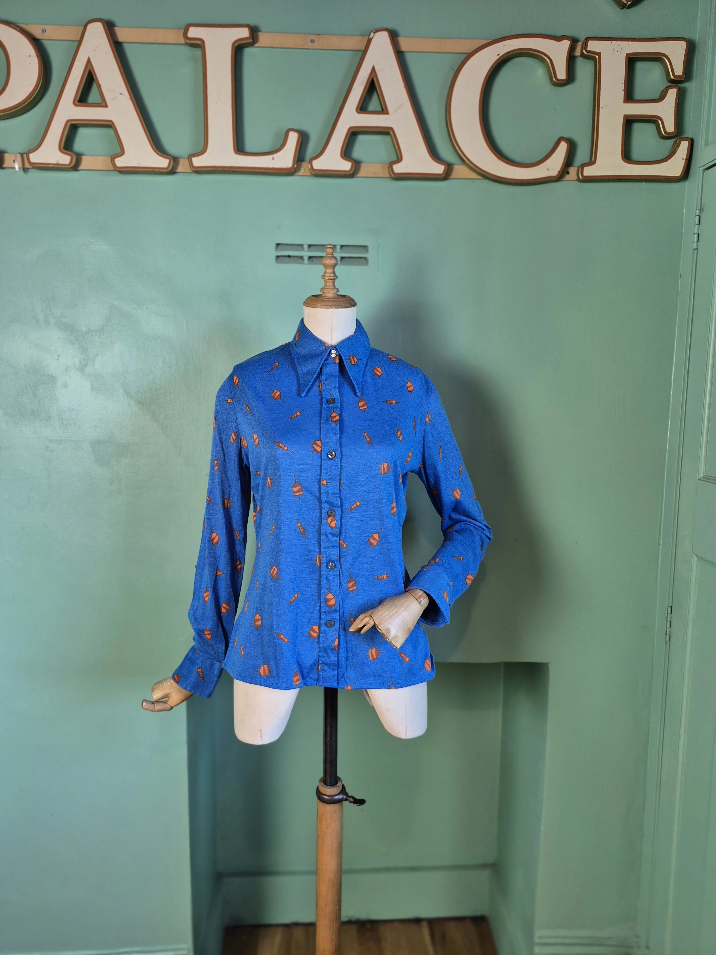 This is a fabulous 70s dagger collar shirt in bold blue with orange geometric shapes. Has a slight stretch to the fabric.