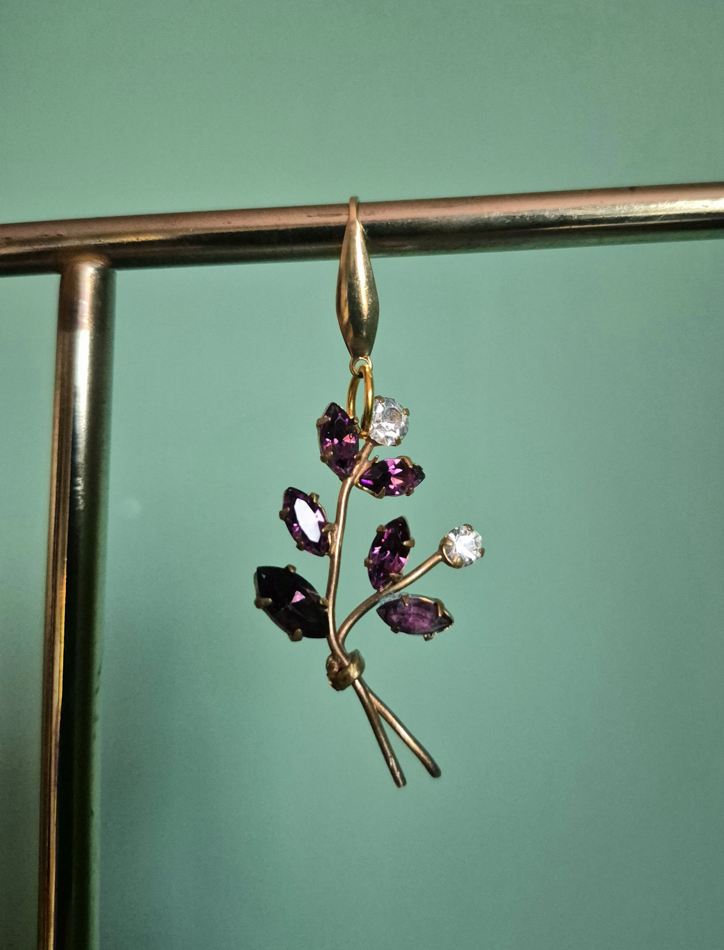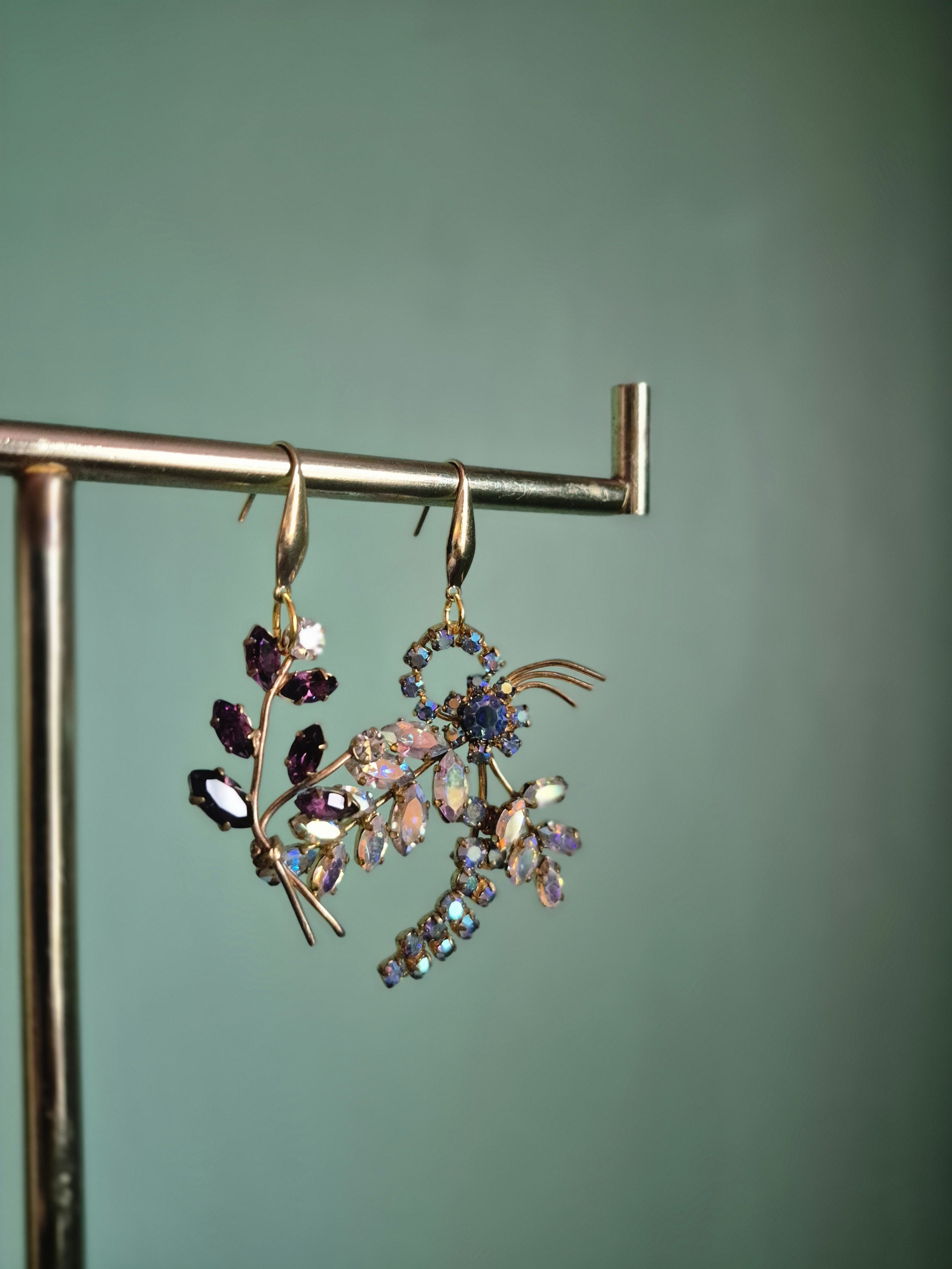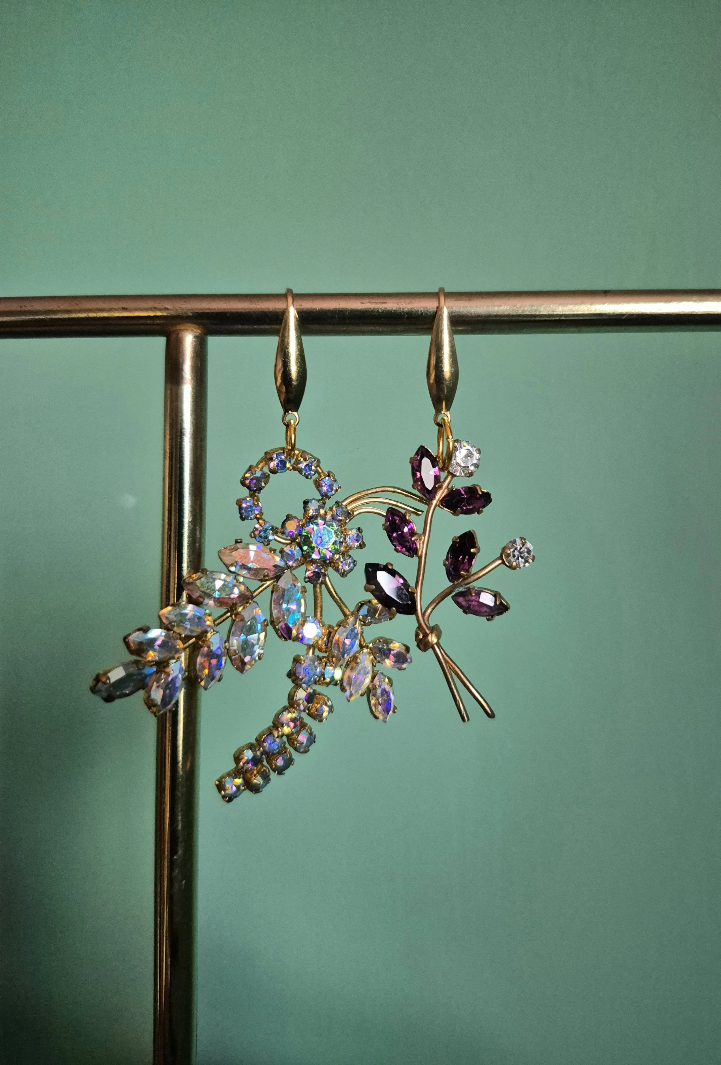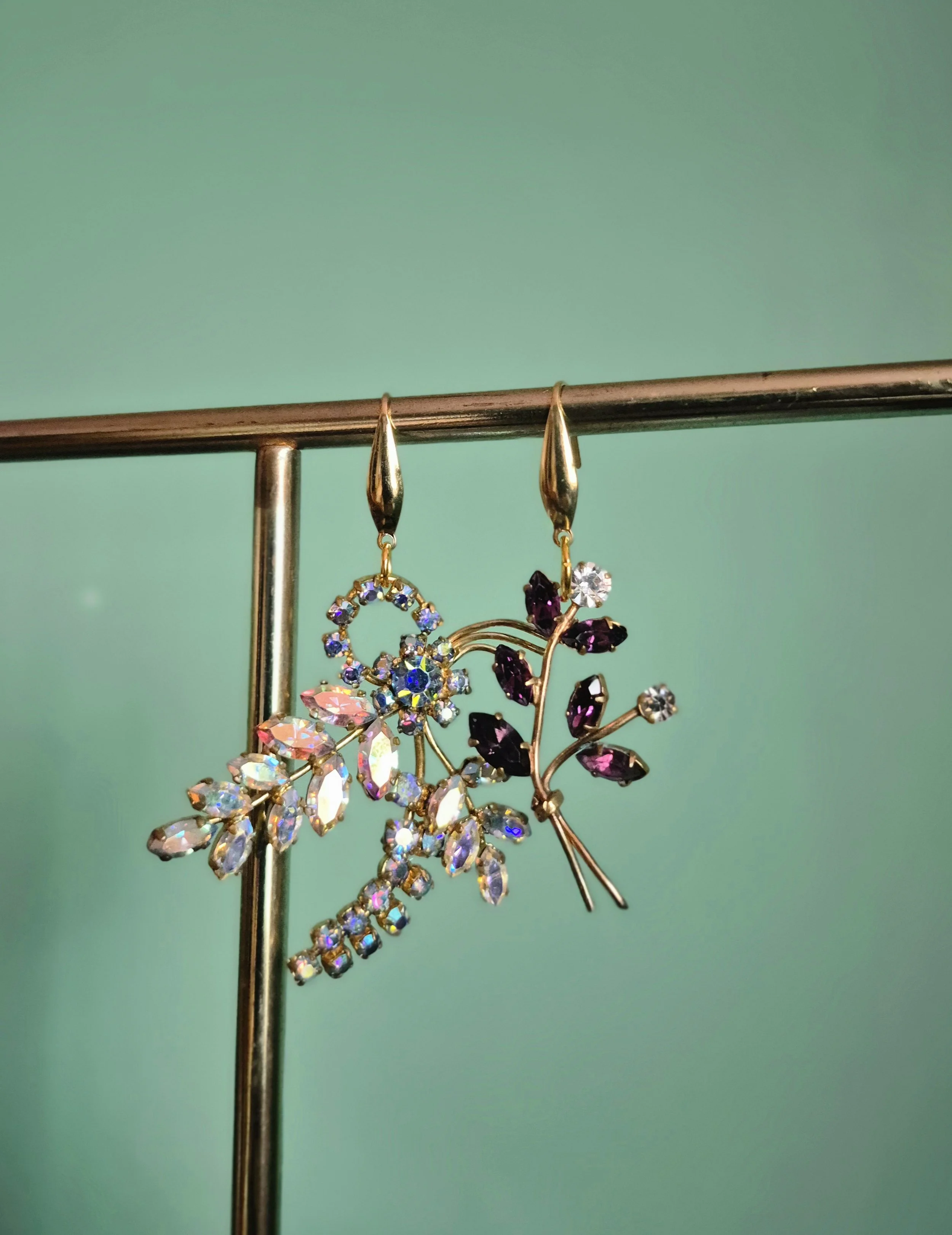 Asymmetrical earrings made from paste brooches. The colours are lovely iridescent and purple tones.