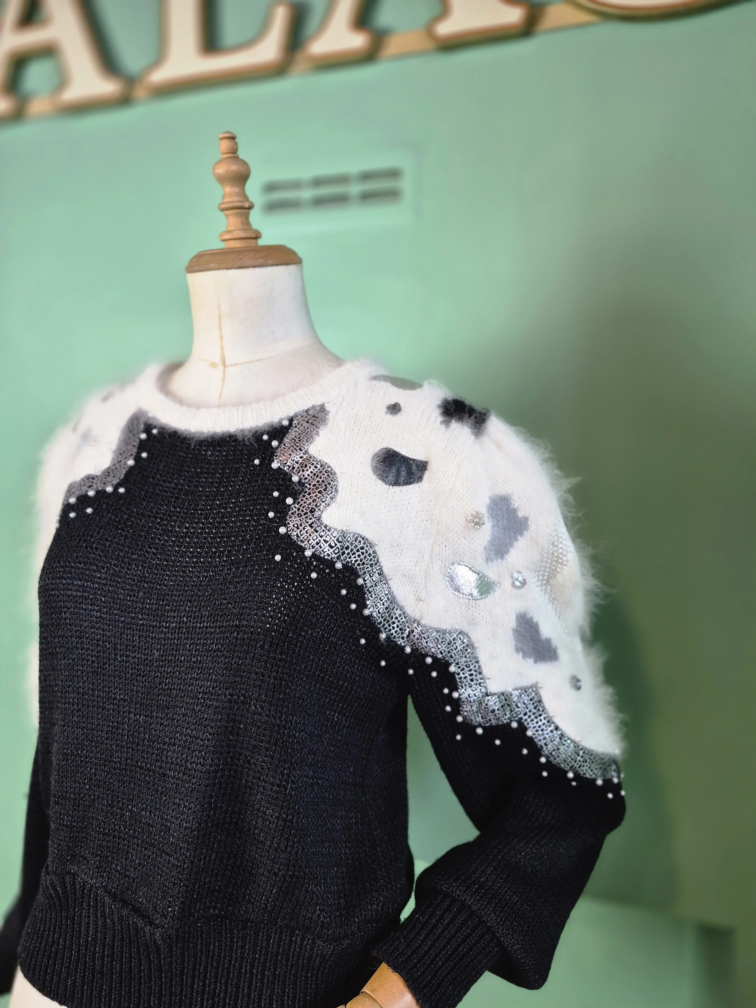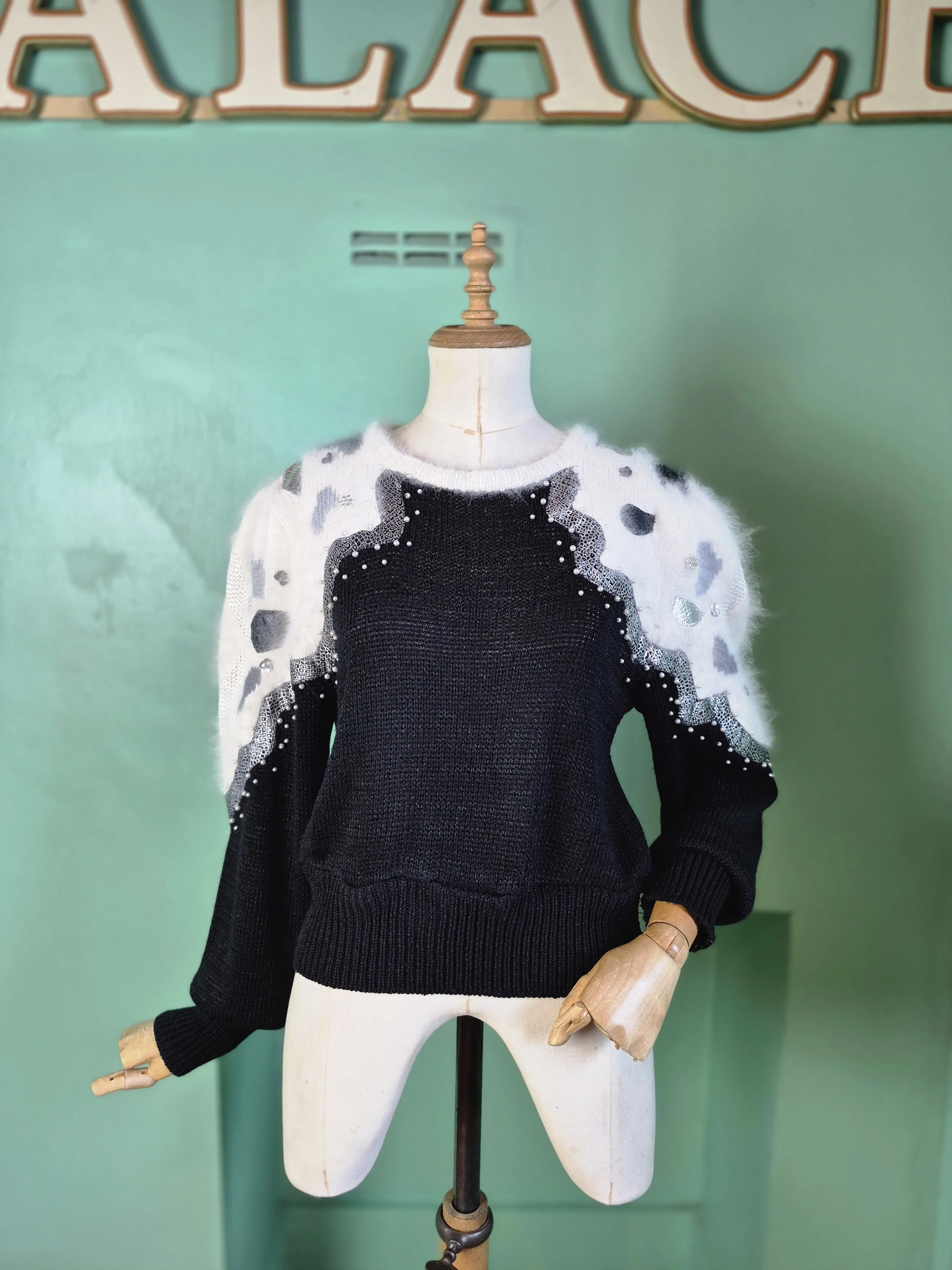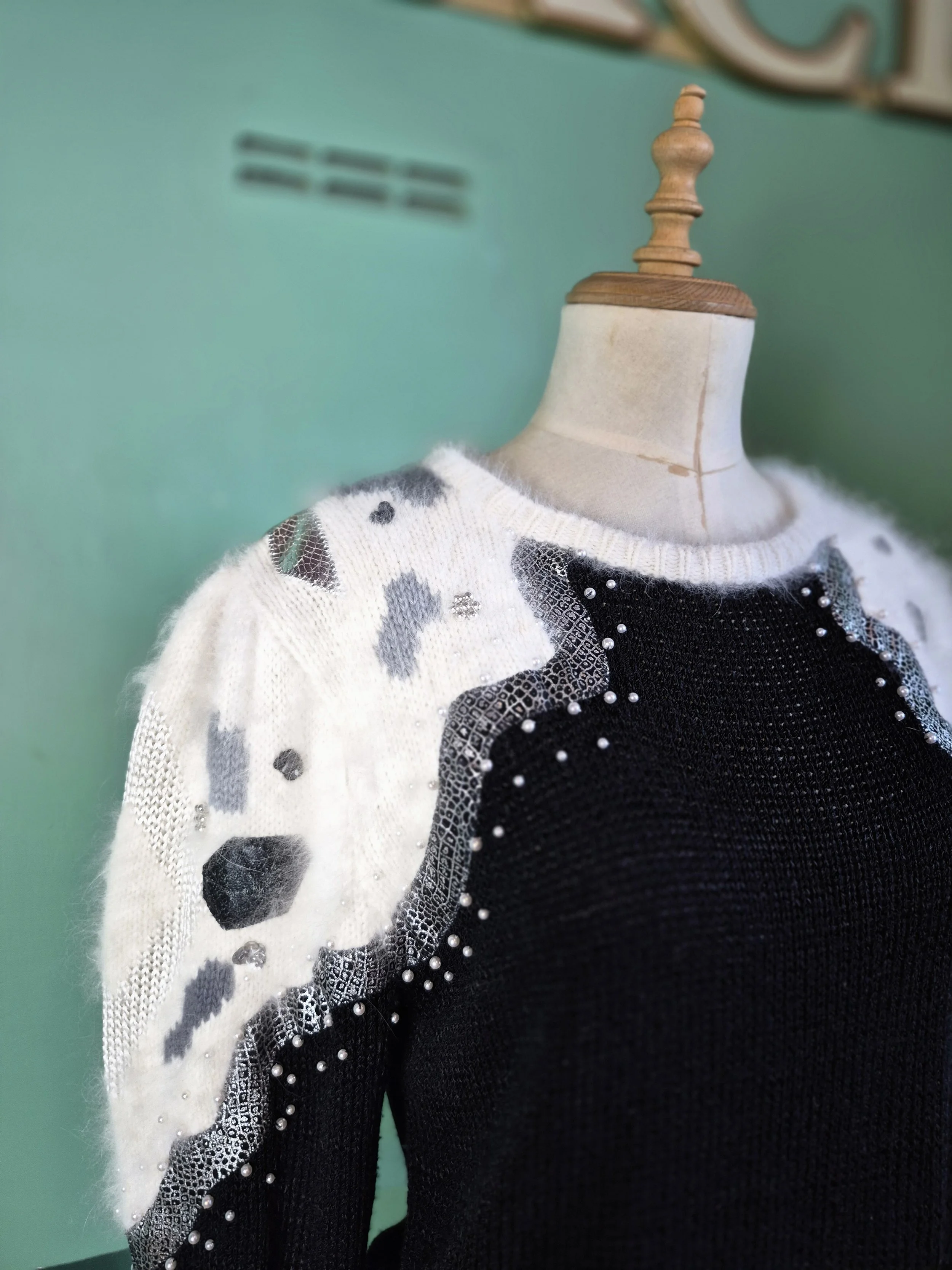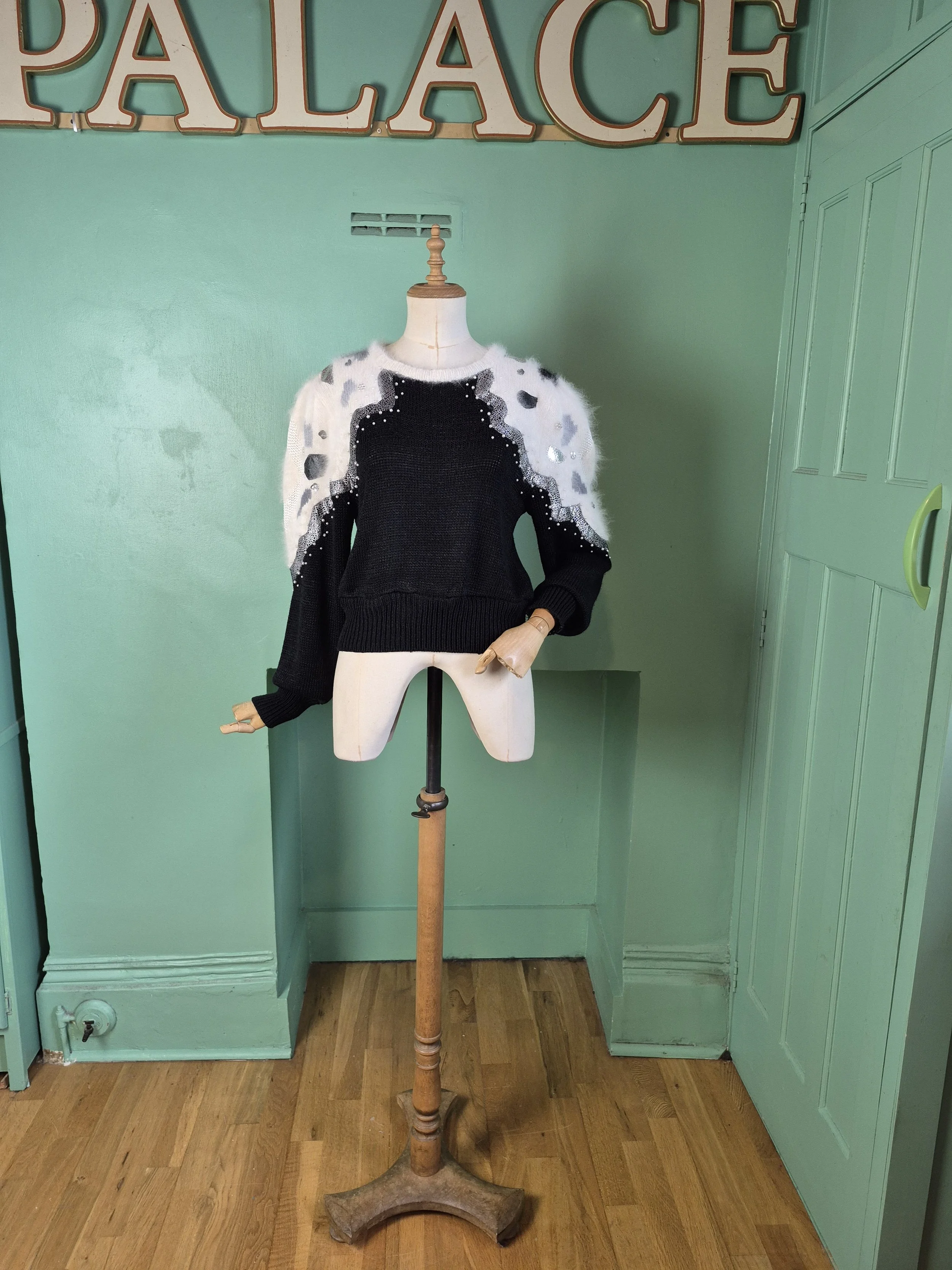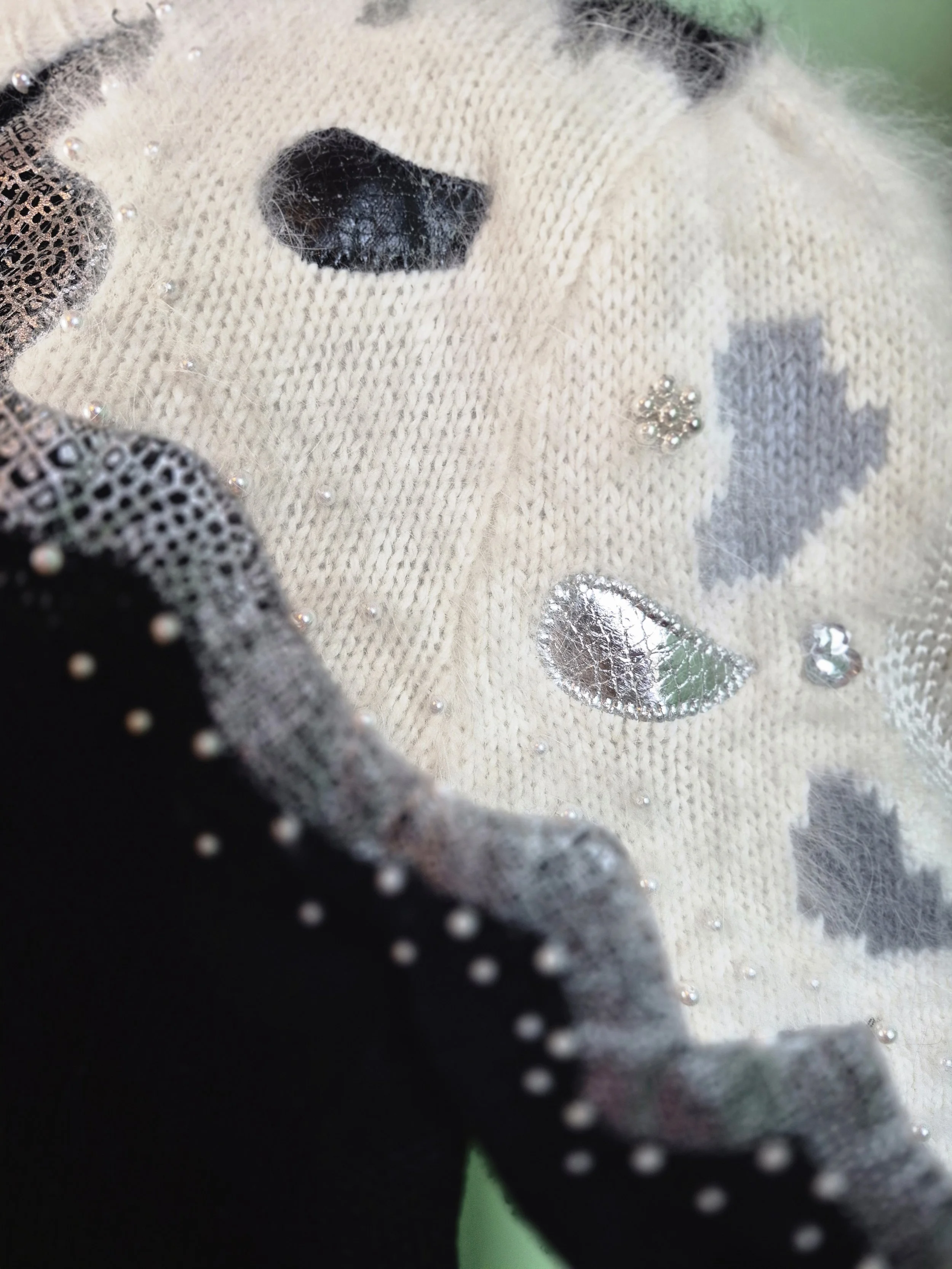 Mixed materials in the fun knit. Embellished shoulders proving more is more.