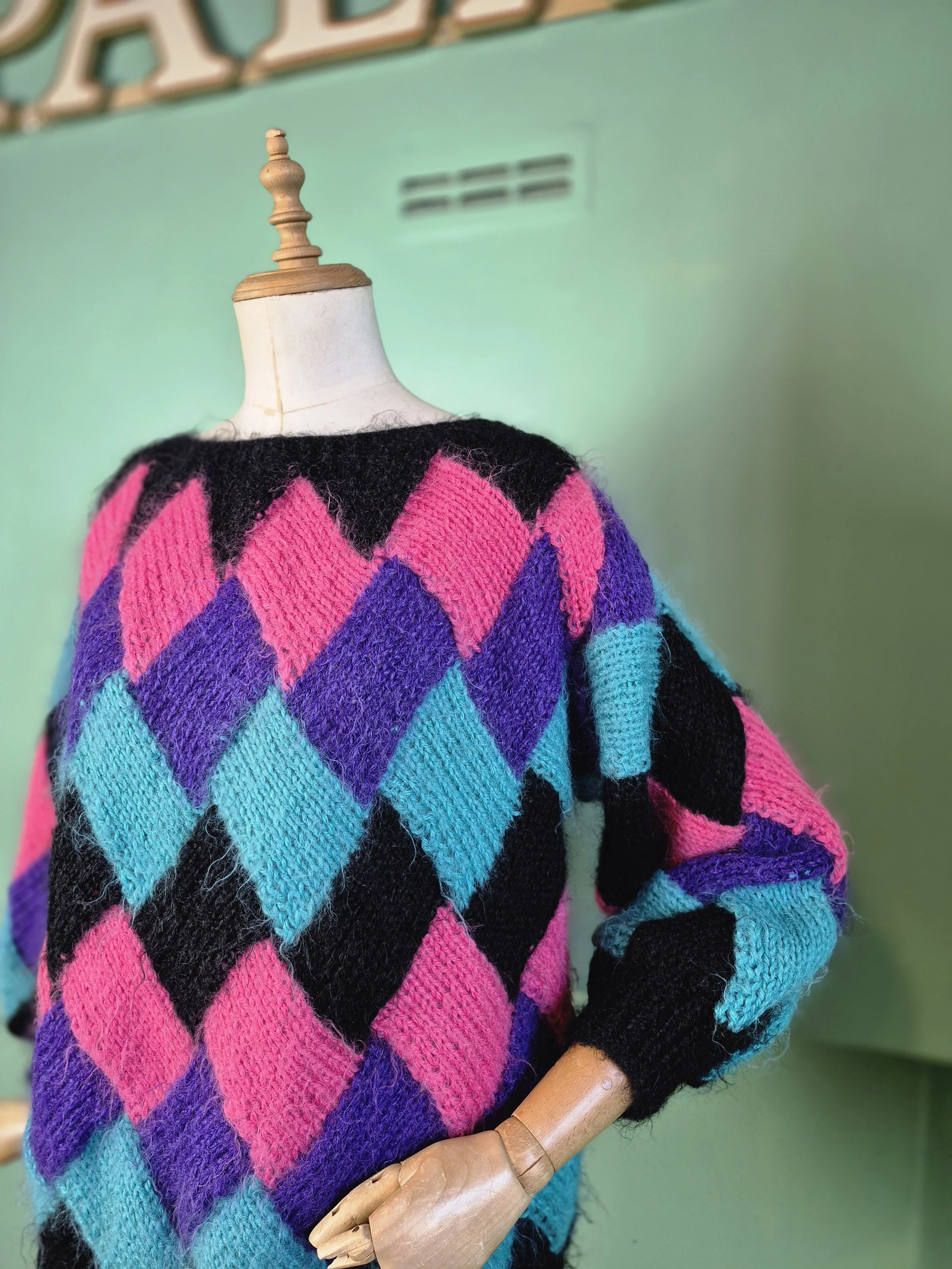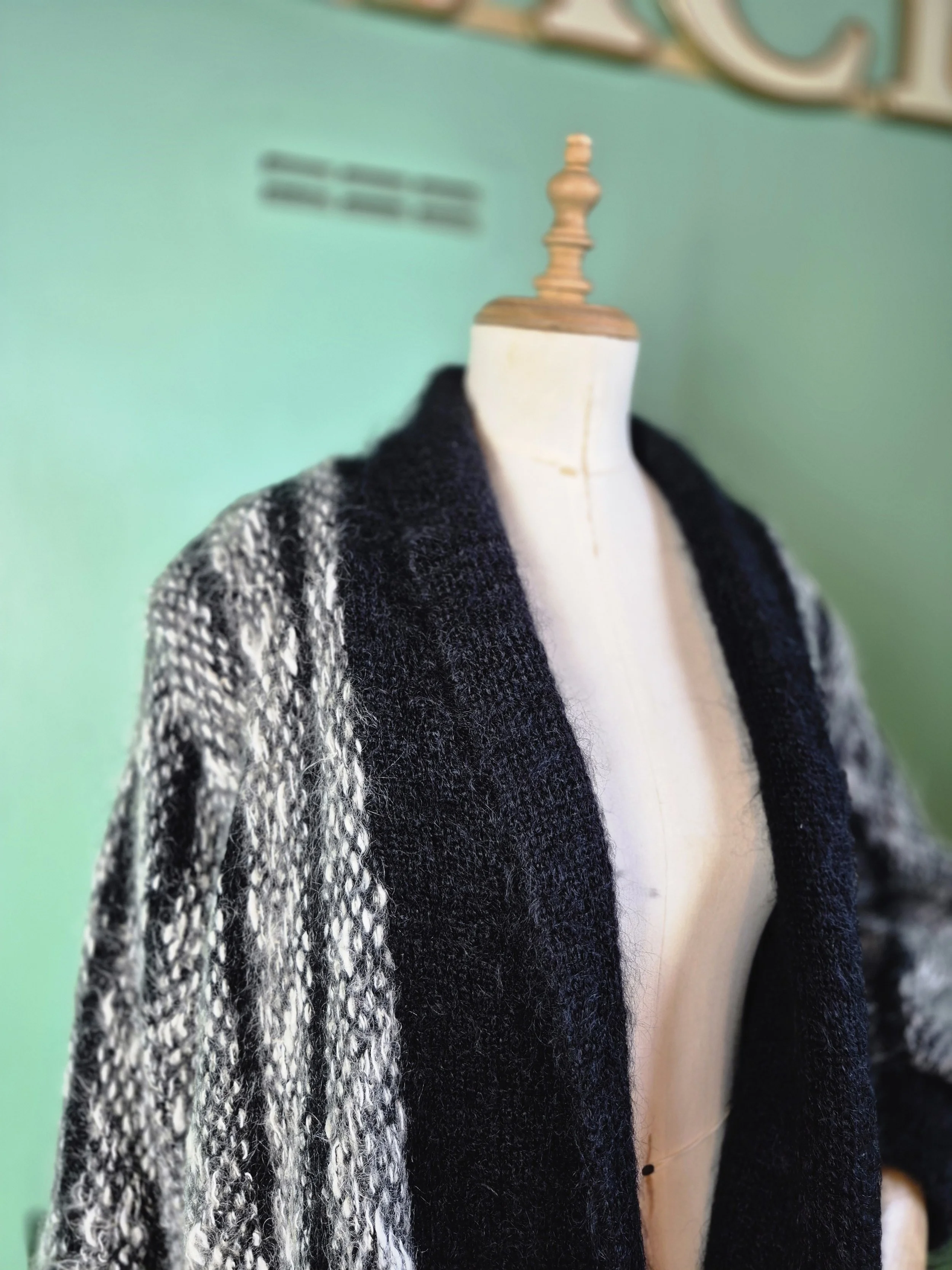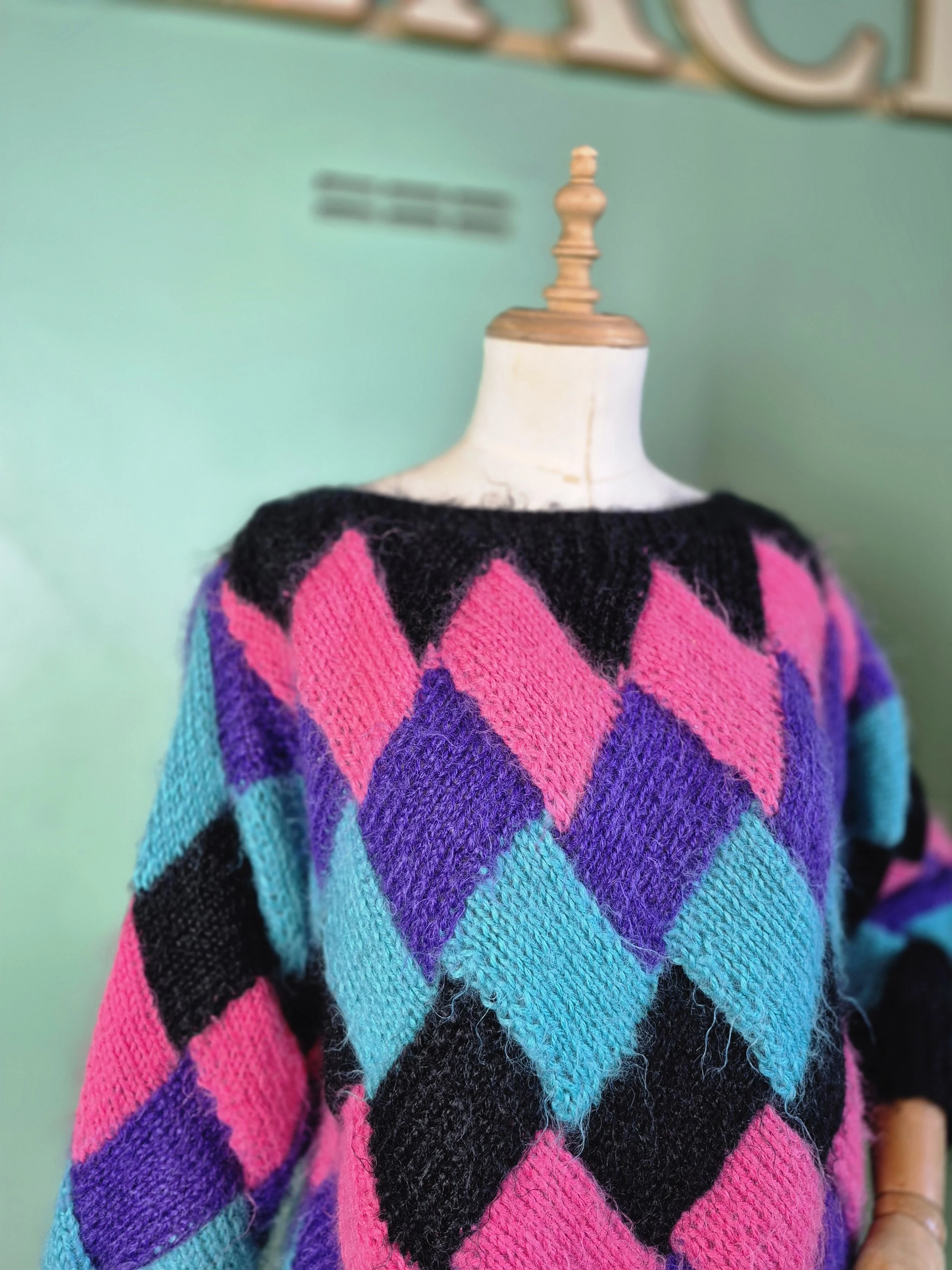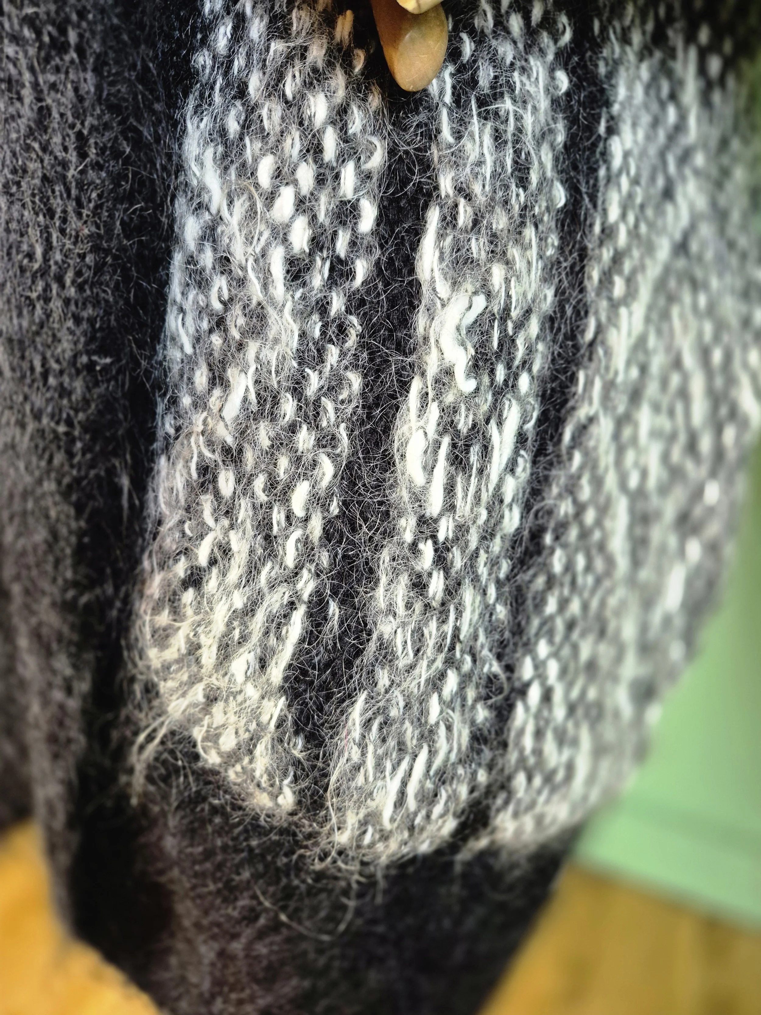 Mixed materials in the fun knit. Embellished shoulders proving more is more.