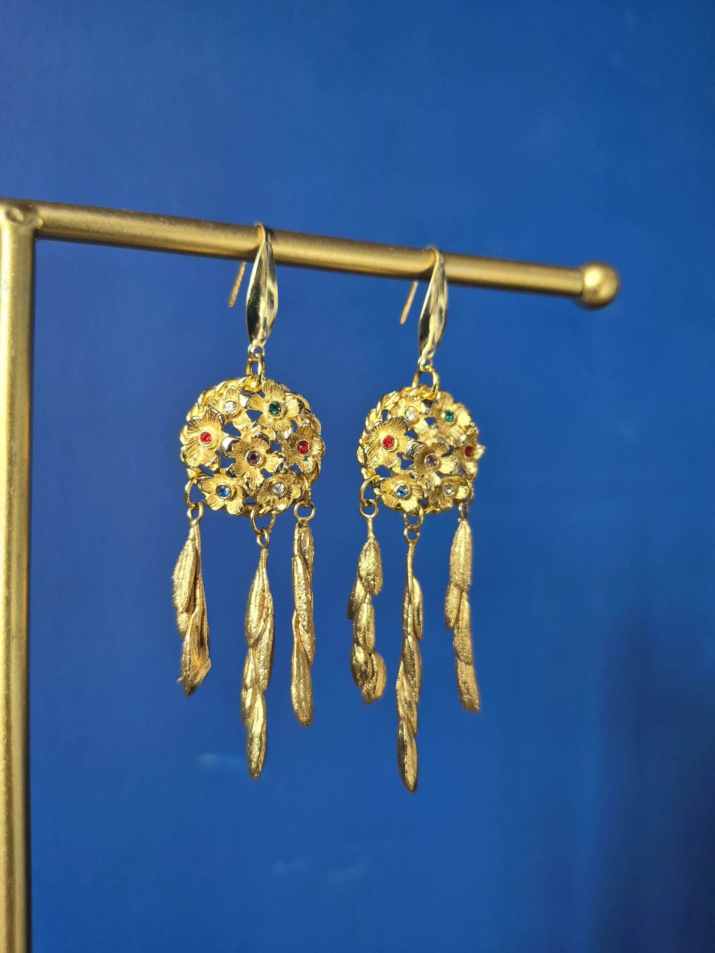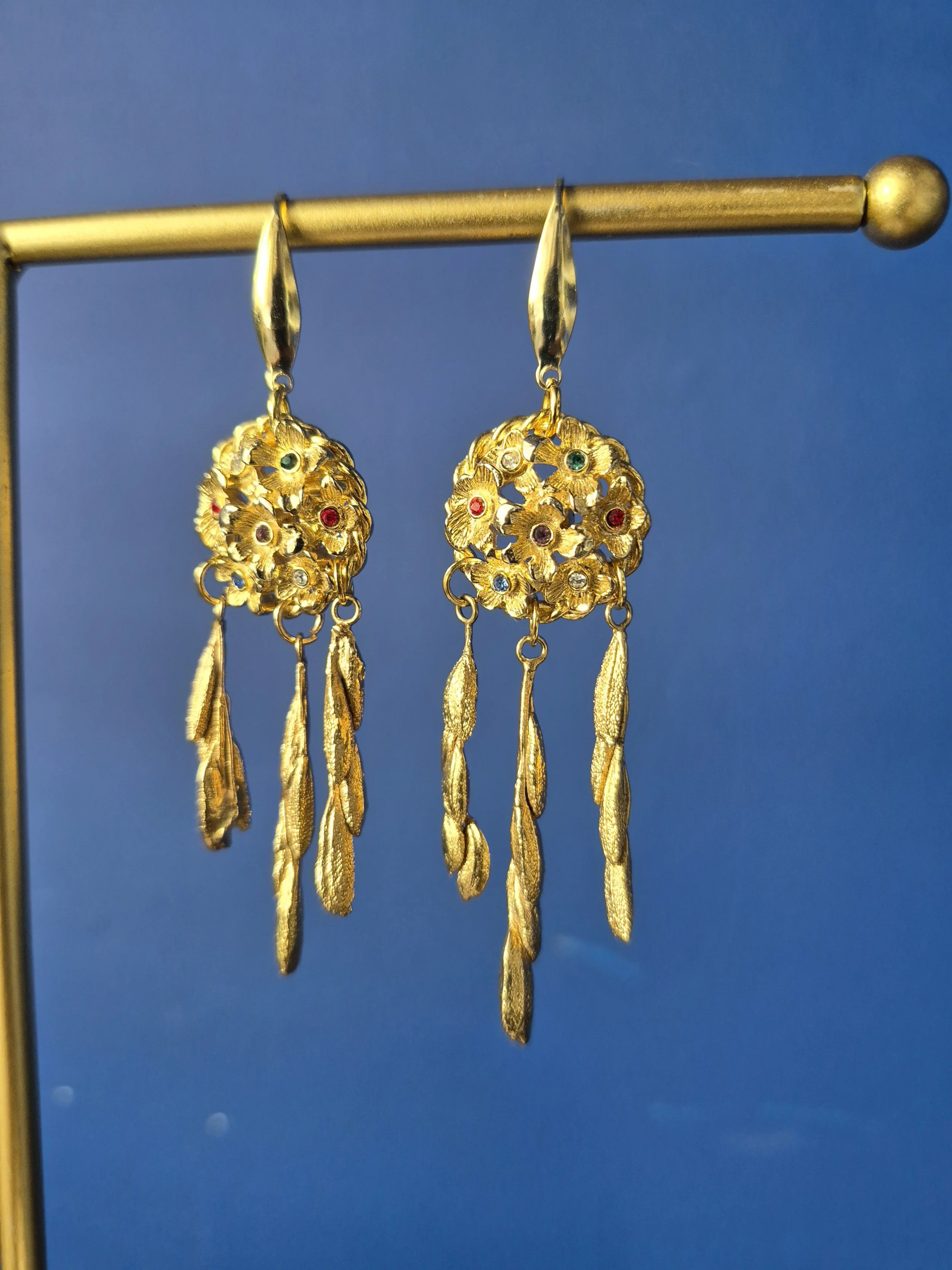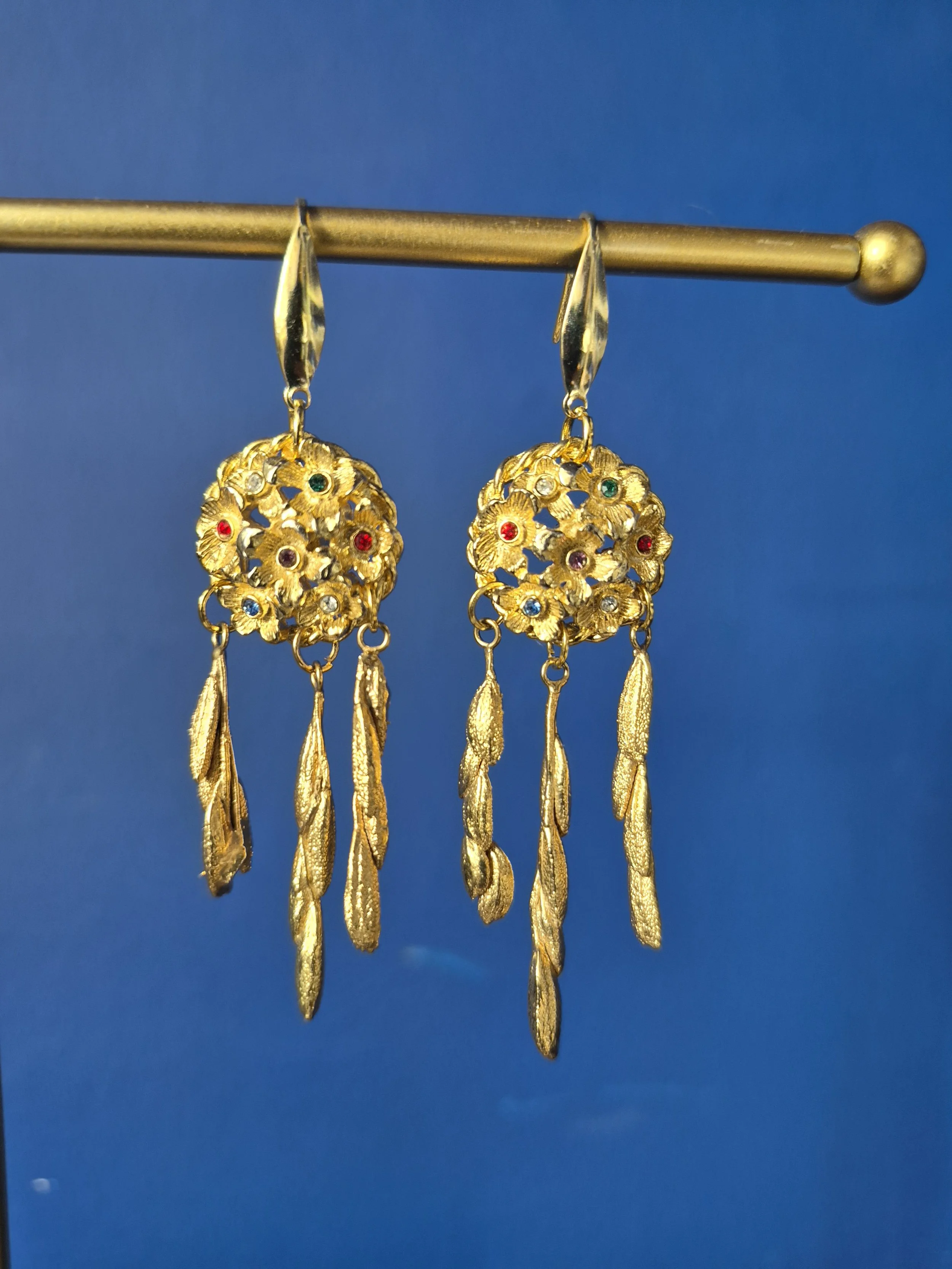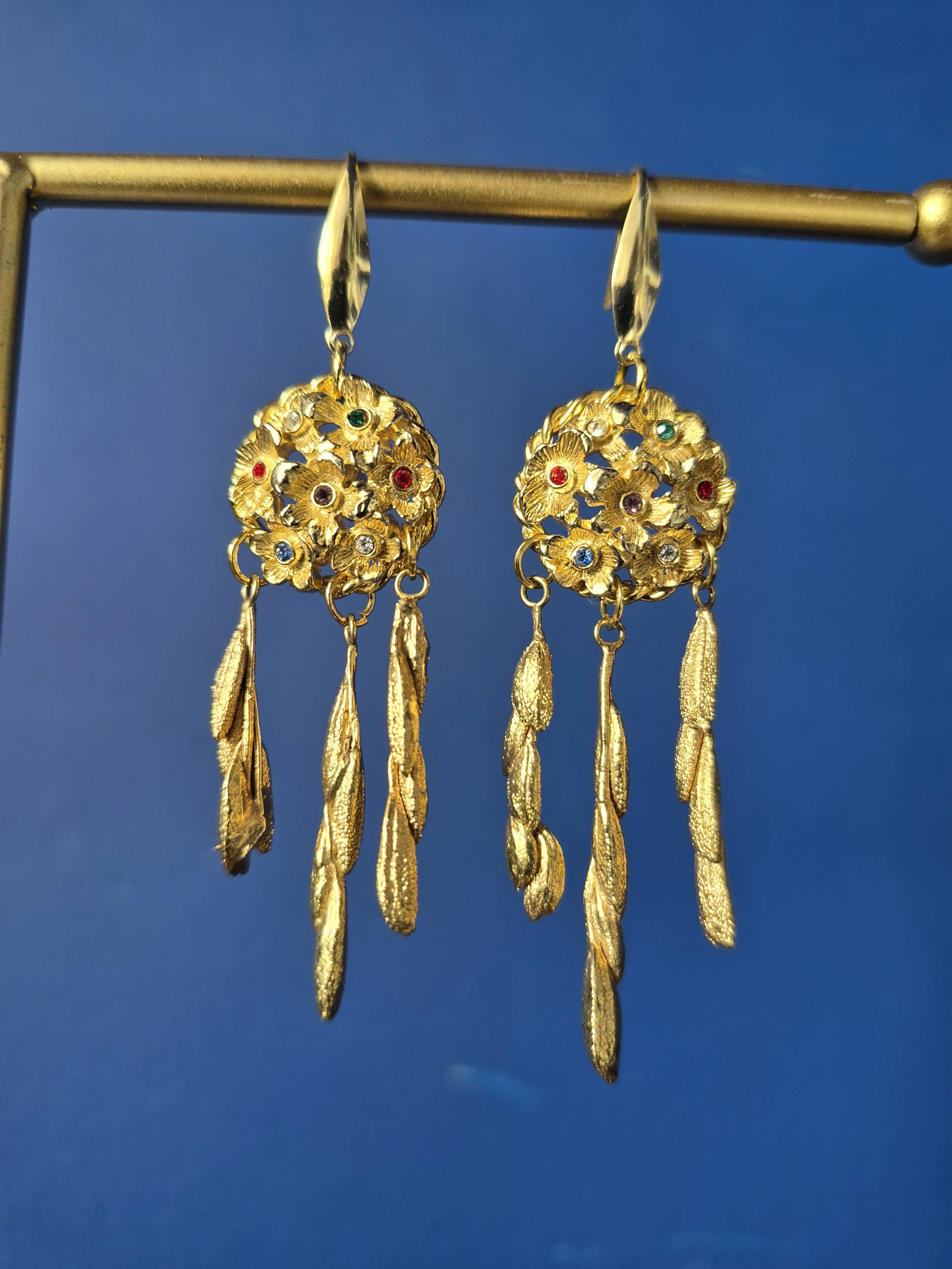 This unique pair of earrings have been made using the most beautiful gold tone buttons set with multicoloured crystals. Finished with three textured gold tone drops.