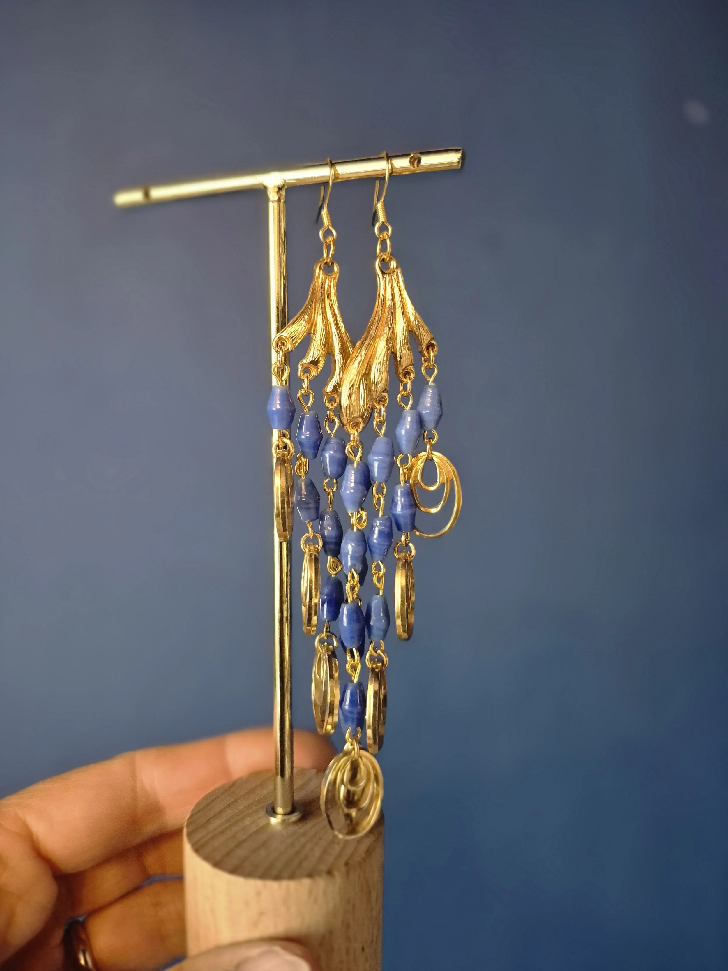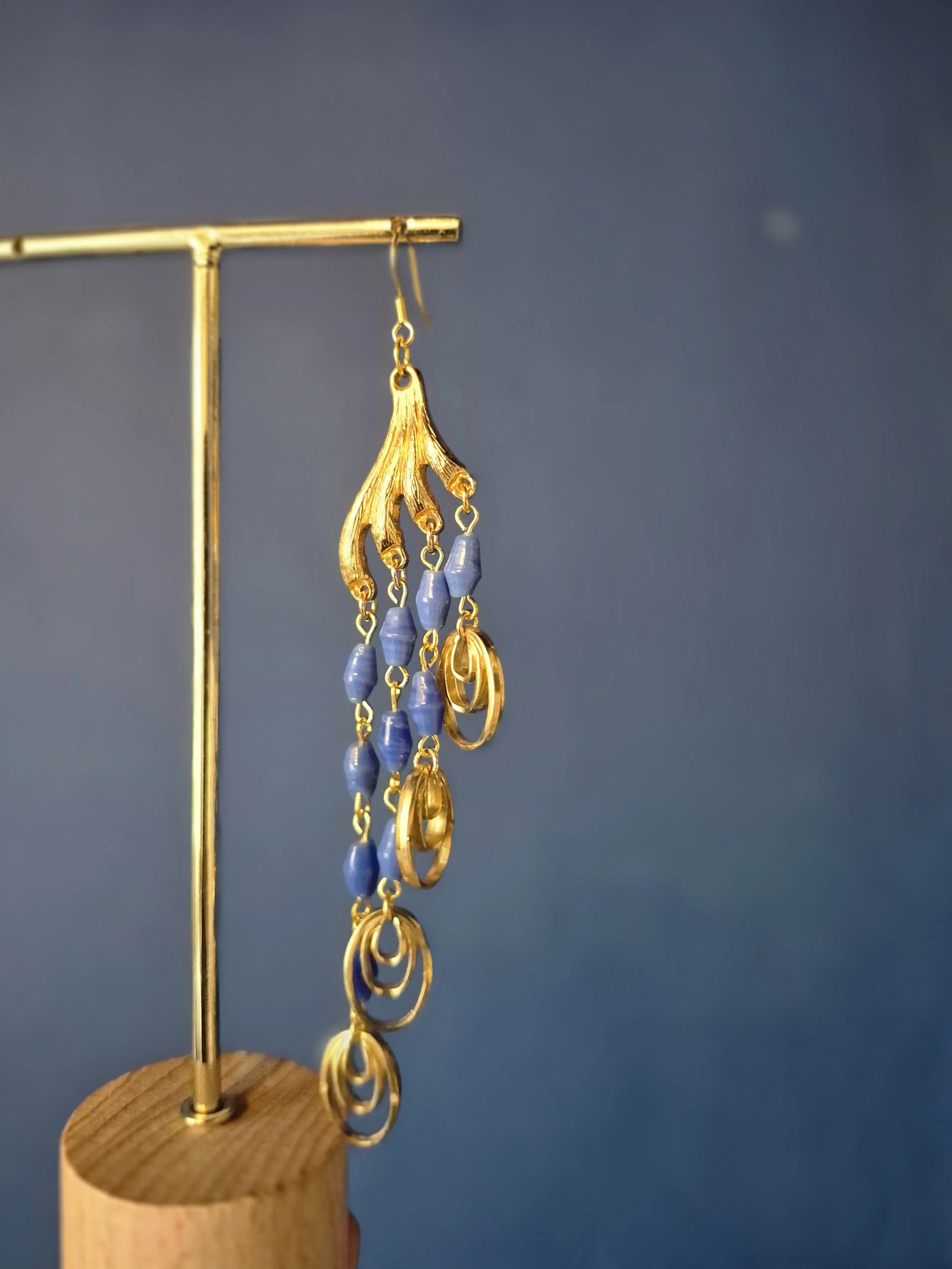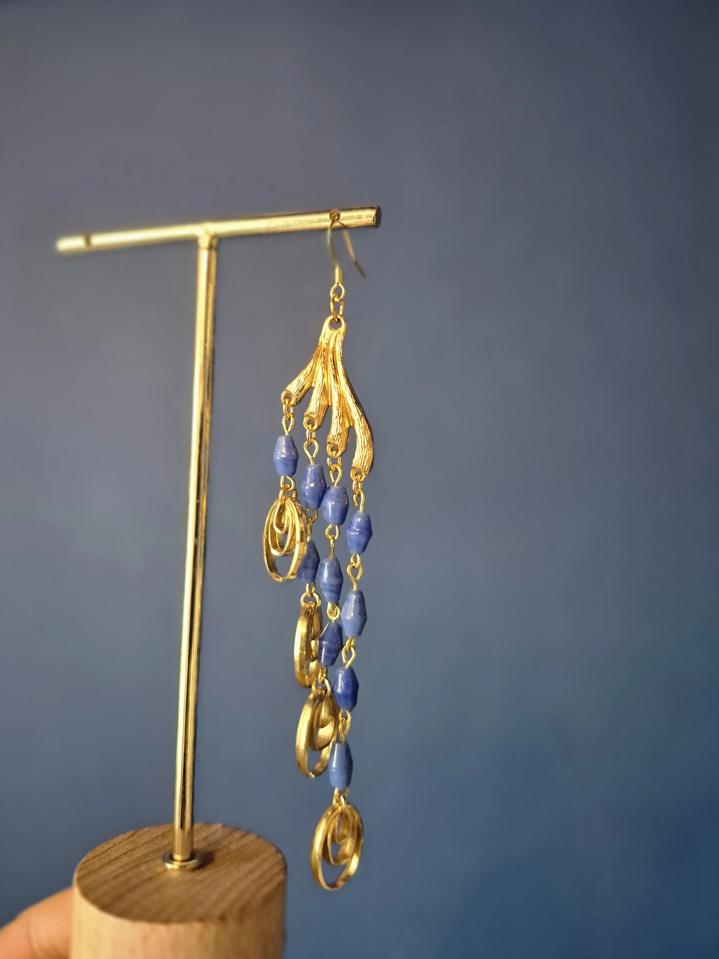 Beautiful asymmetrical drop earrings made from blue, yellow and red glass beads and a vintage chain link.