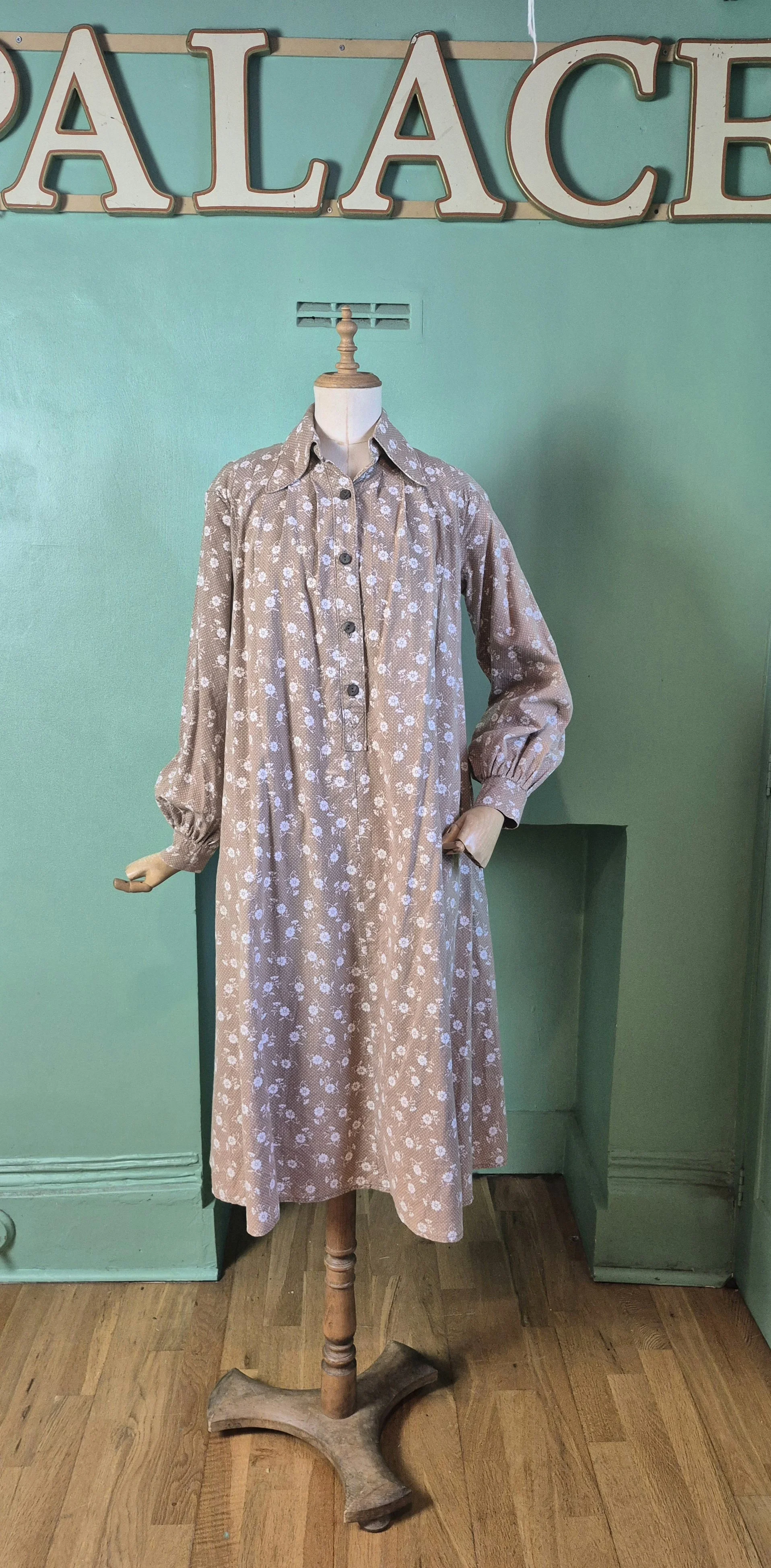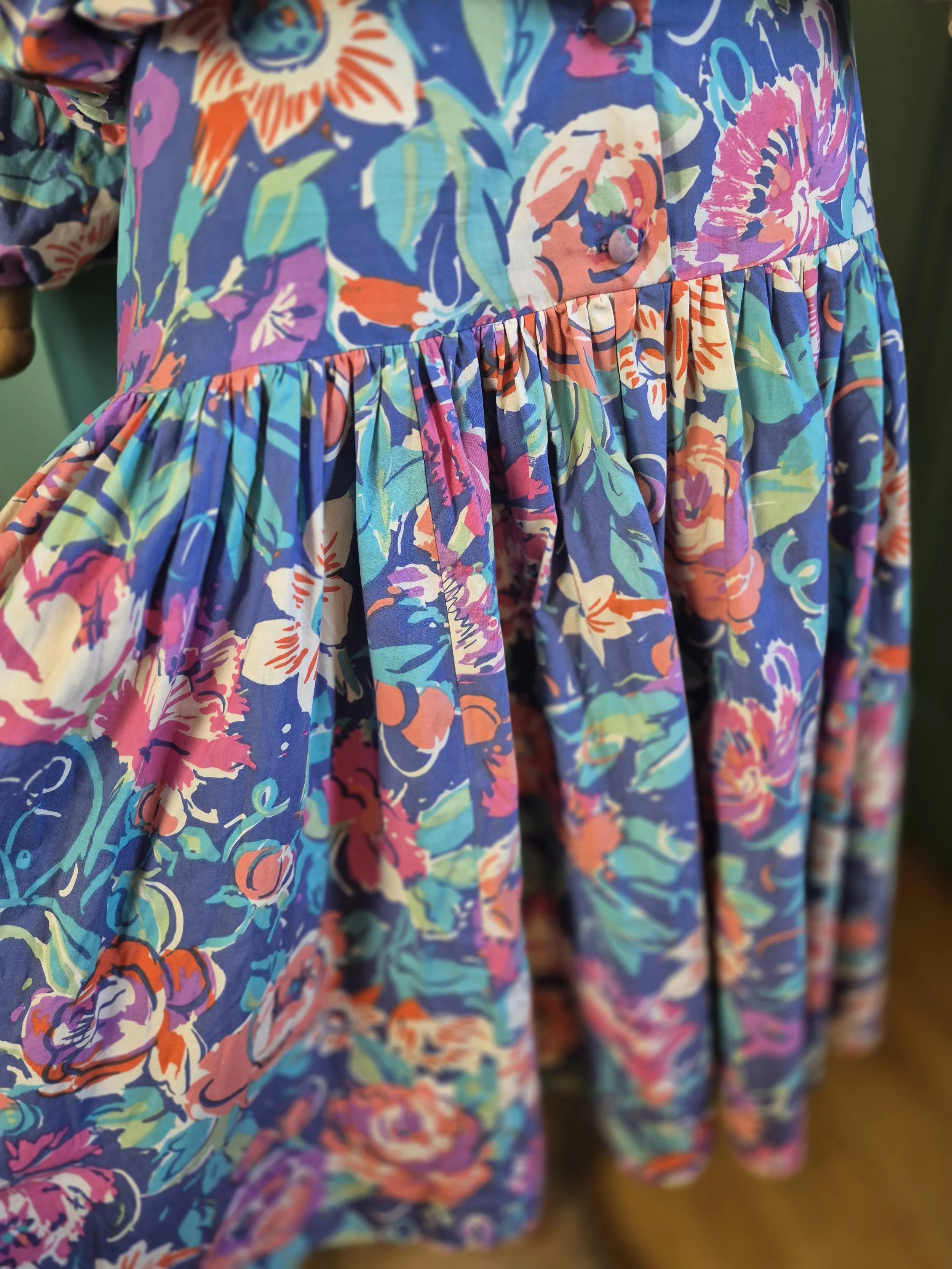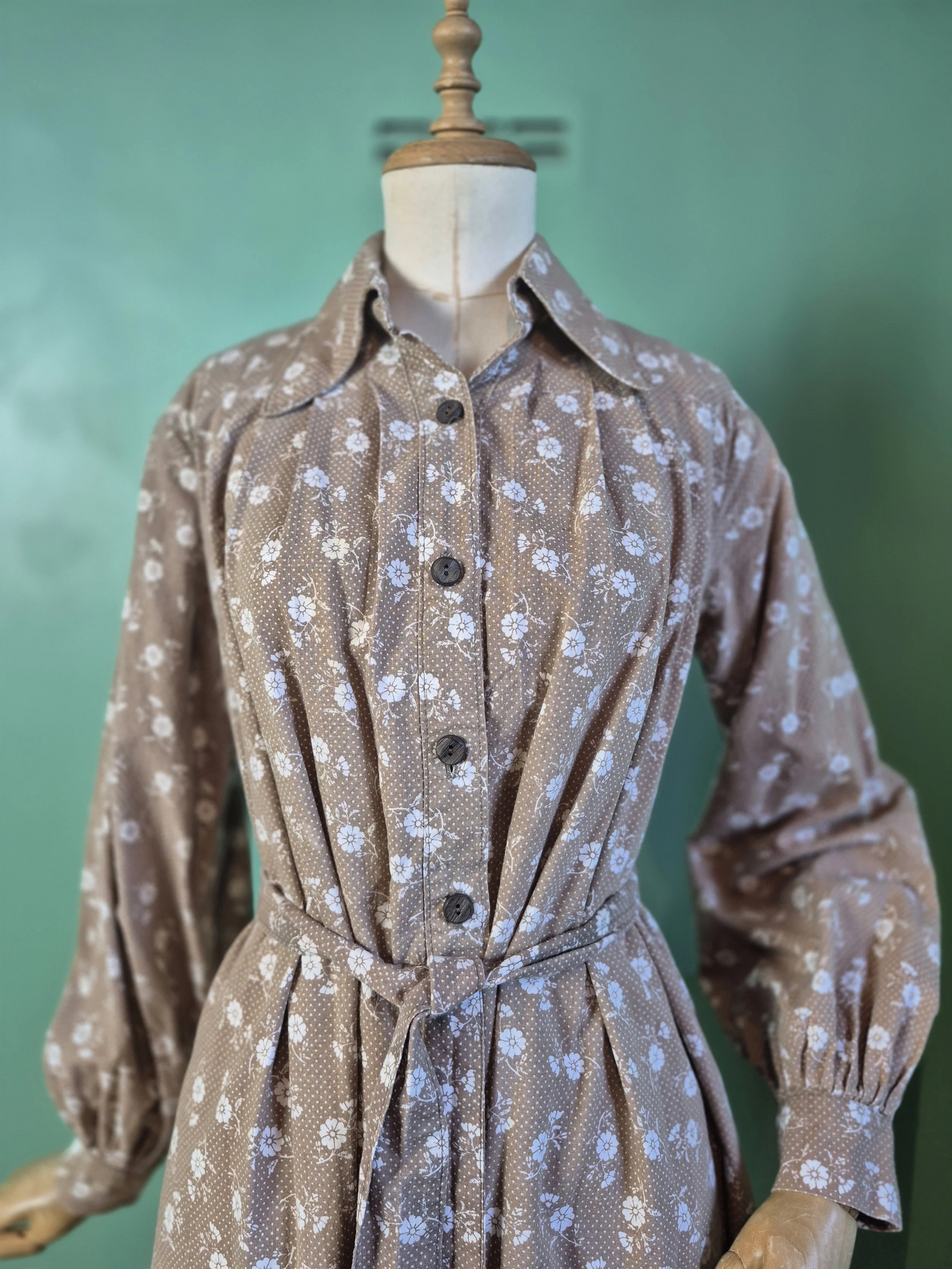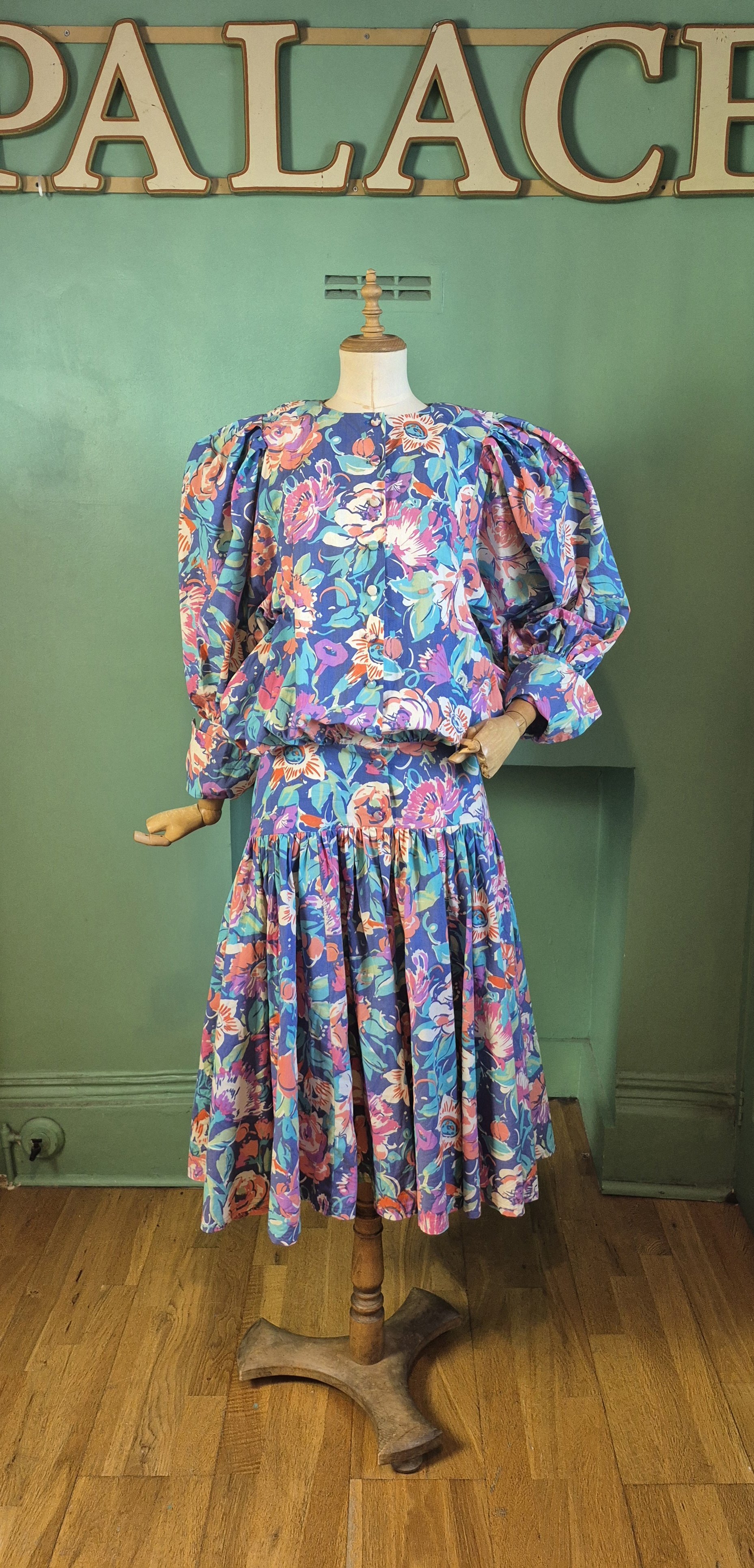 This dress is pure Droopy and Browns. Huge puff sleeves with turn back cuffs, drop waist, blousey top and full skirt. Just stunning.