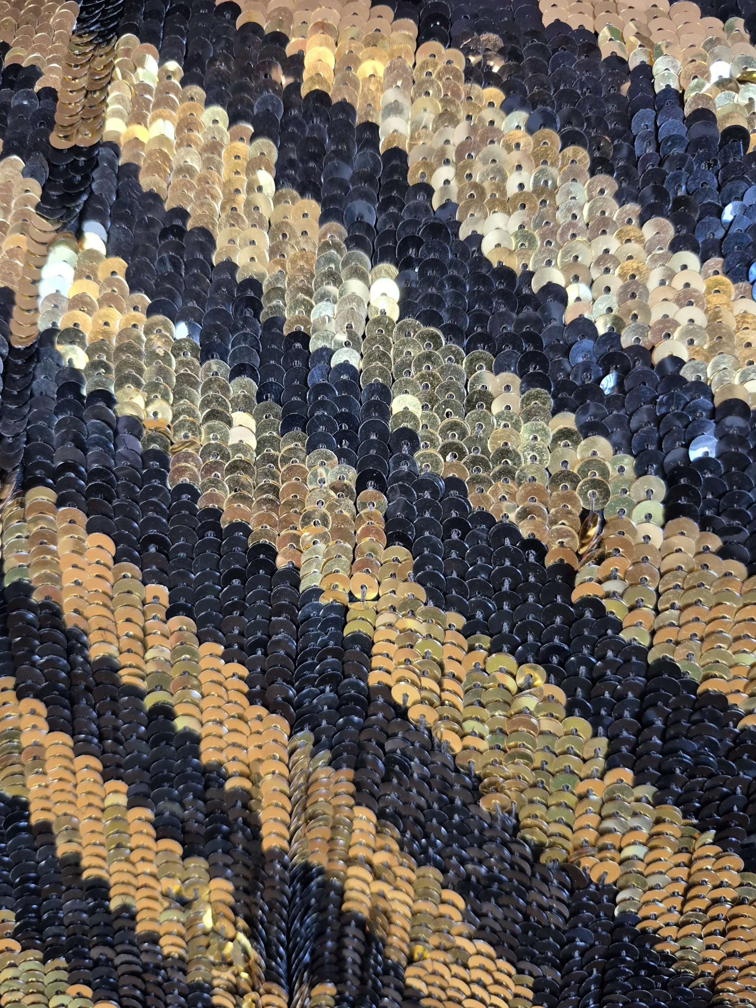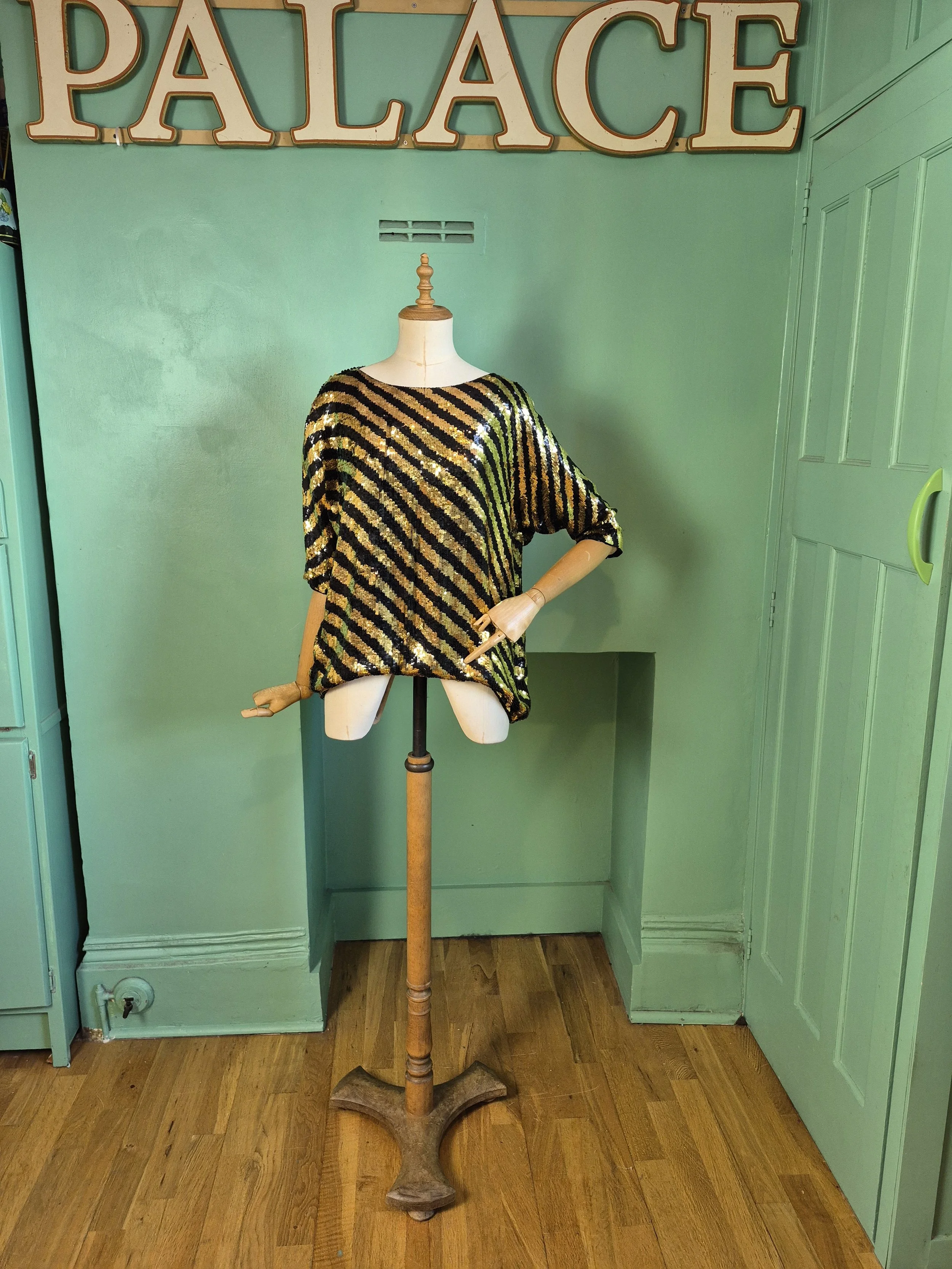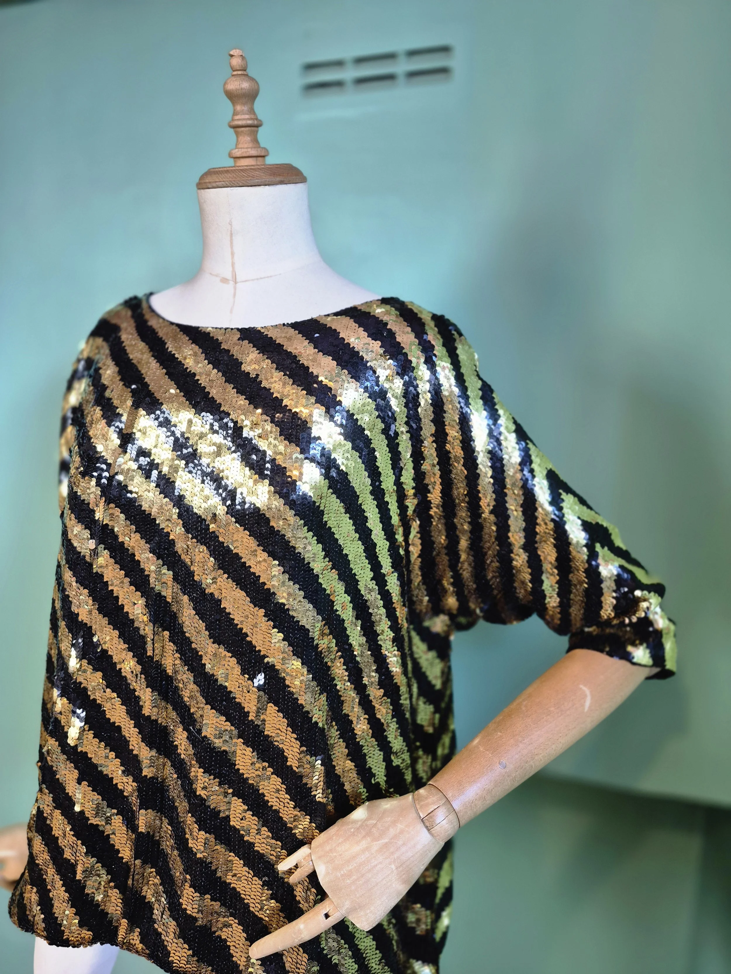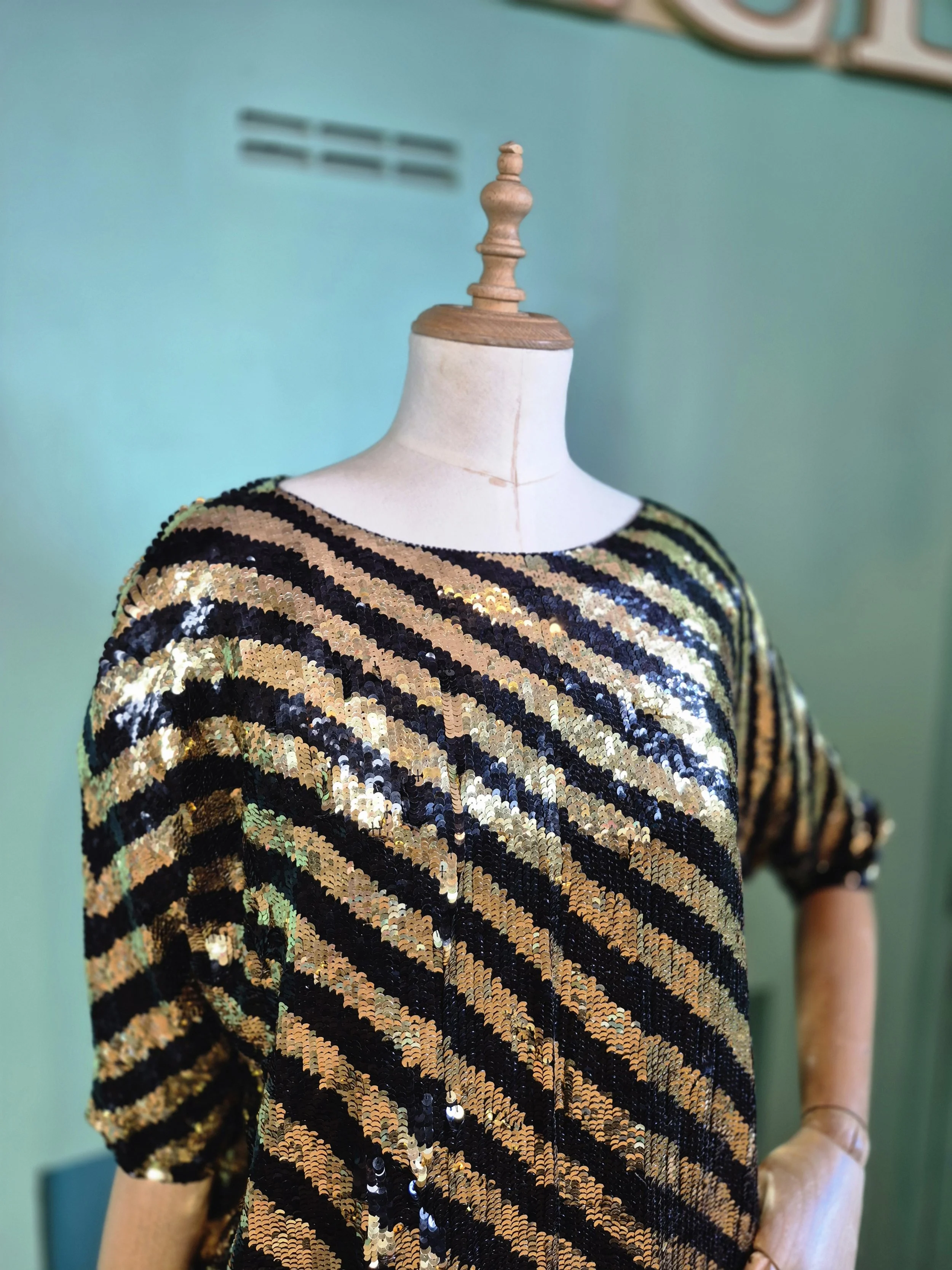 What an incredible top. Bold black and gold sequin stripes. Slouchy fit.