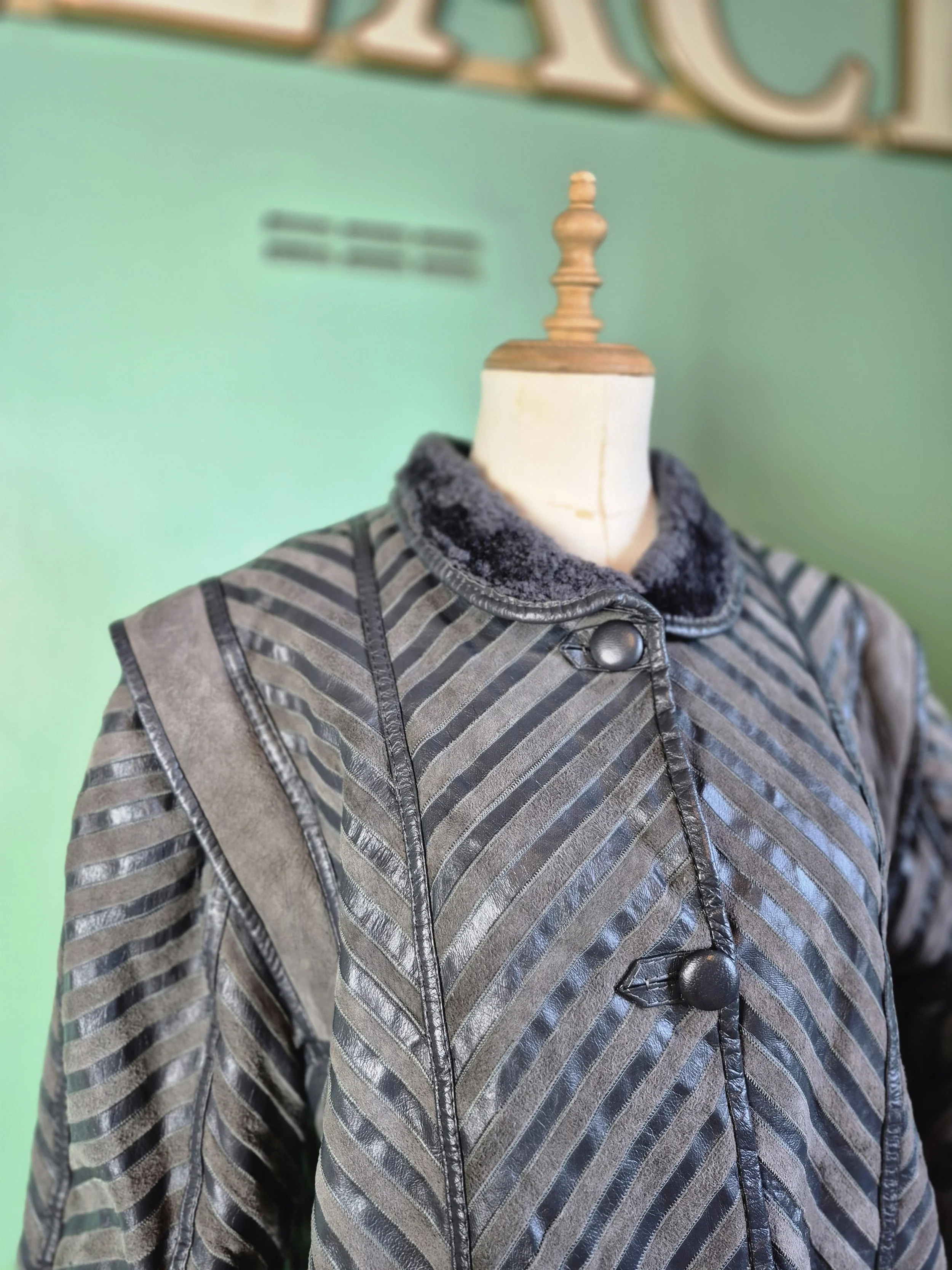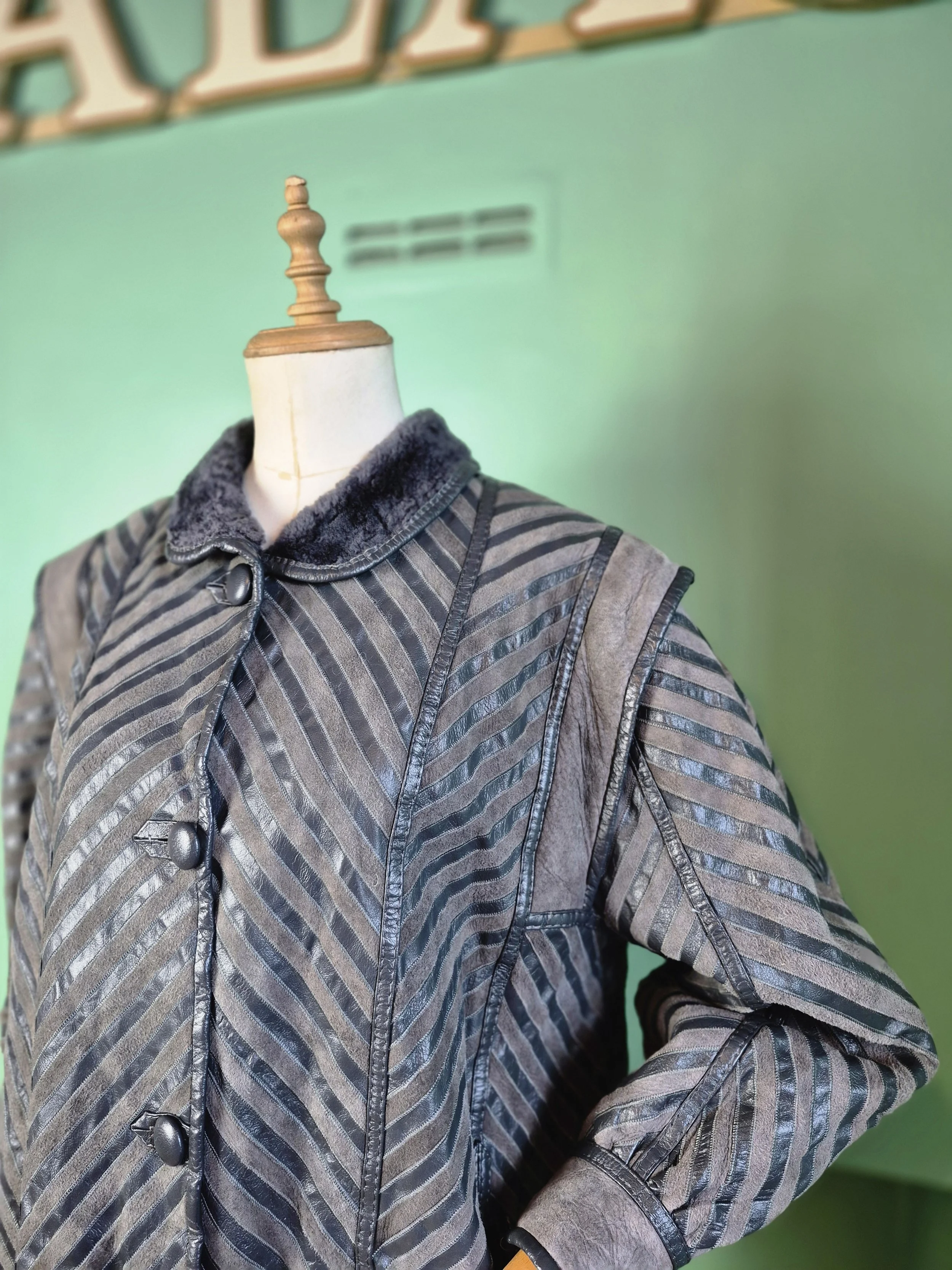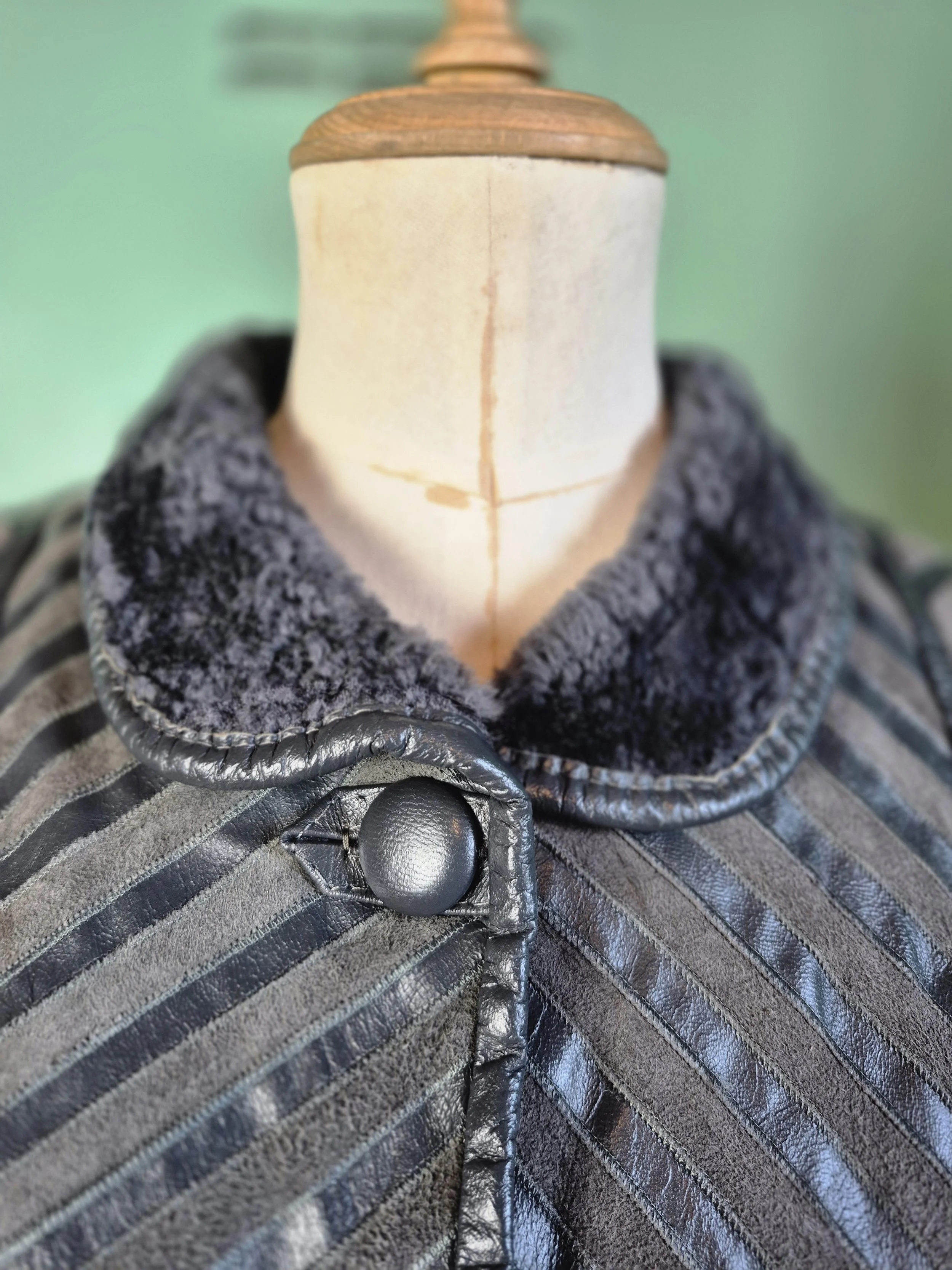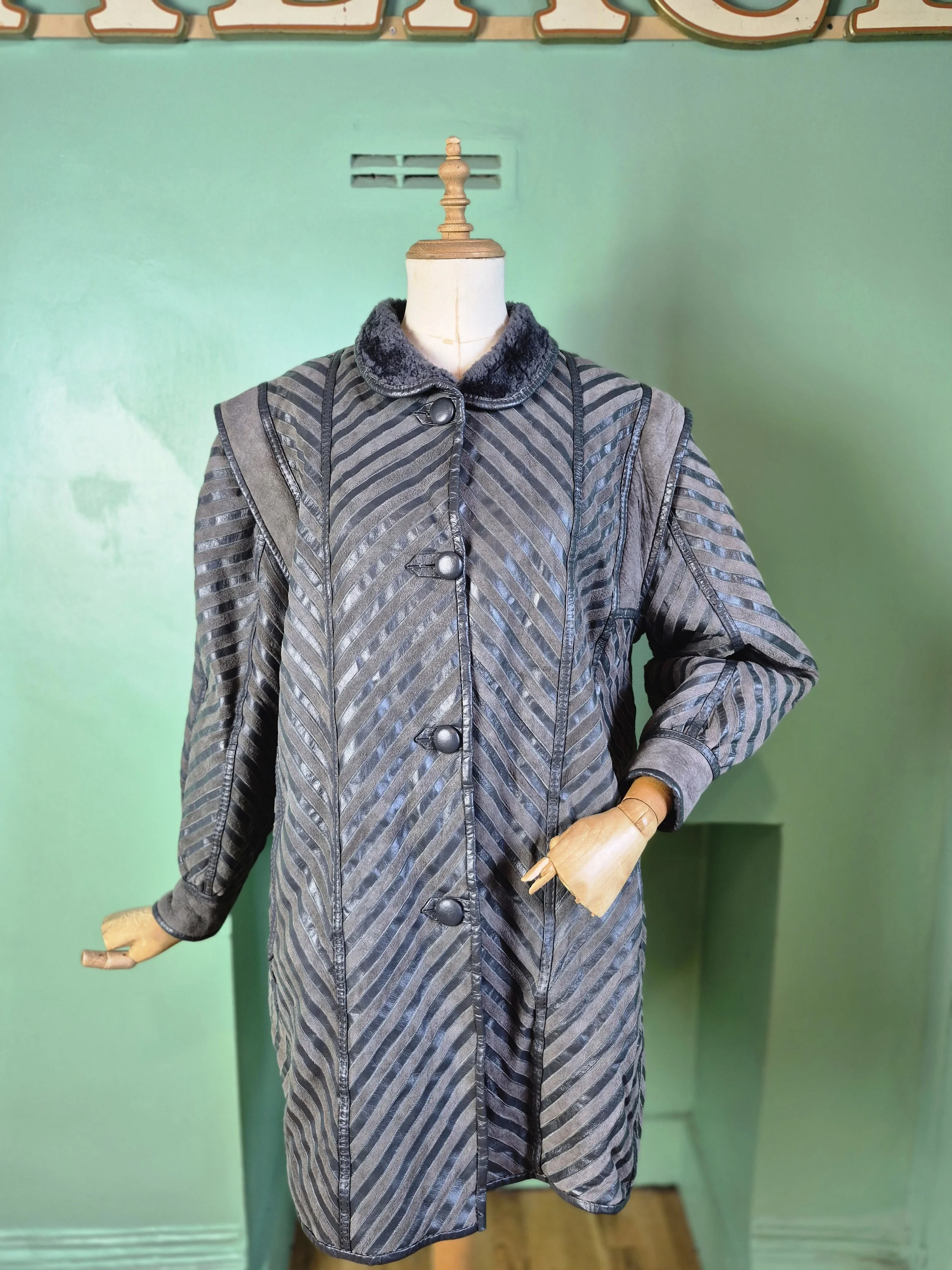 This is a gorgeous stripe design suede and poss leather coat. Faux for lined so super snuggly.